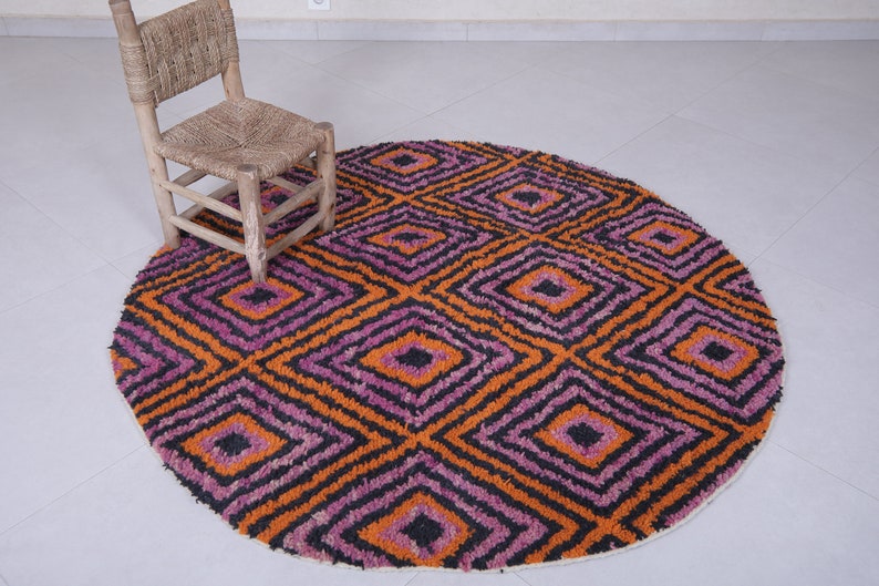 This Moroccan Round Rug features a bold diamond pattern in vibrant orange, pink, and purple hues—perfect for making a statement in any space. A playful yet artistic design rooted in tradition.