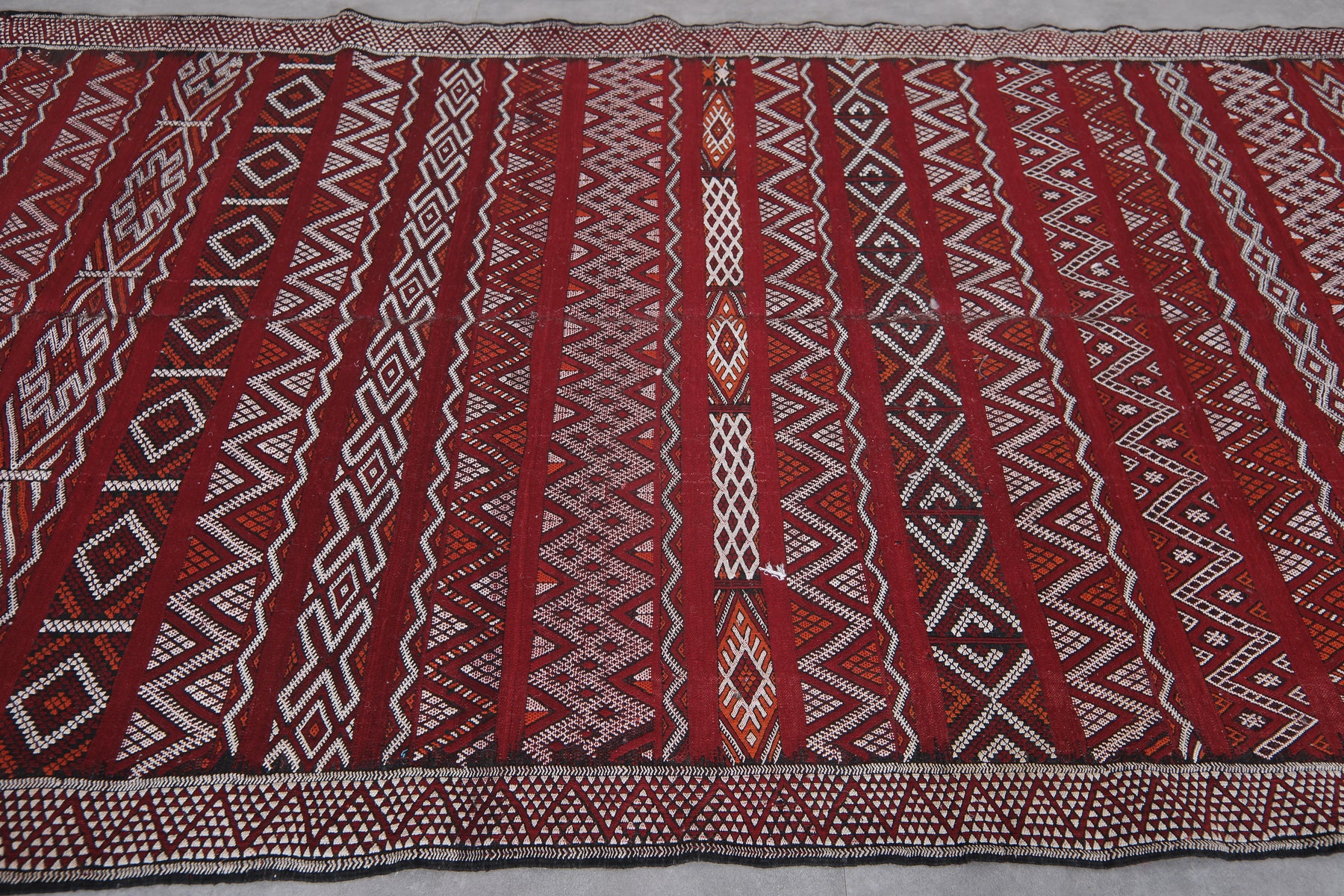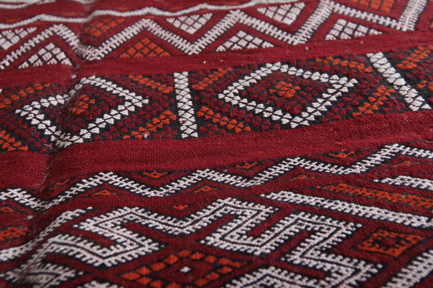 • Features vibrant reds and whites with rich geometric motifs.