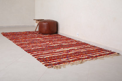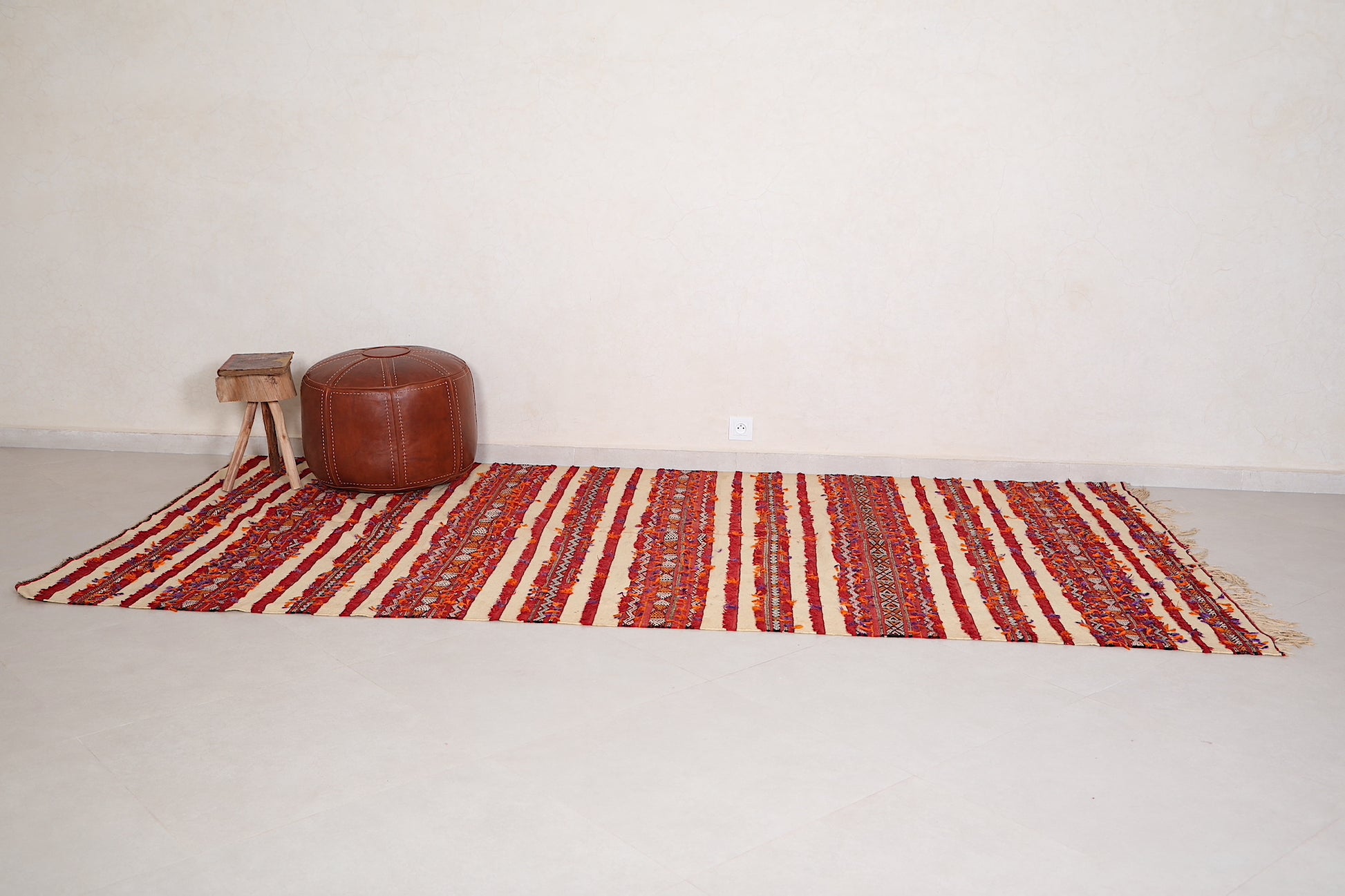 This 5.2 FT x 10.6 FT Handira Berber Kilim Rug is a bold celebration of Moroccan heritage, featuring vibrant stripes and traditional tribal motifs. Perfect as a centerpiece or hallway runner, it adds cultural richness to any setting.