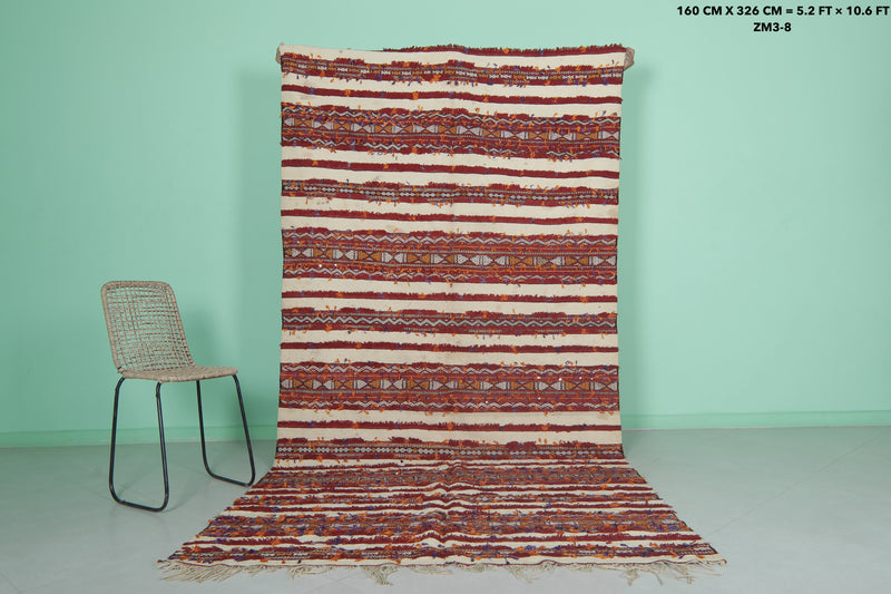 This 5.2 FT x 10.6 FT Handira Berber Kilim Rug is a bold celebration of Moroccan heritage, featuring vibrant stripes and traditional tribal motifs. Perfect as a centerpiece or hallway runner, it adds cultural richness to any setting.