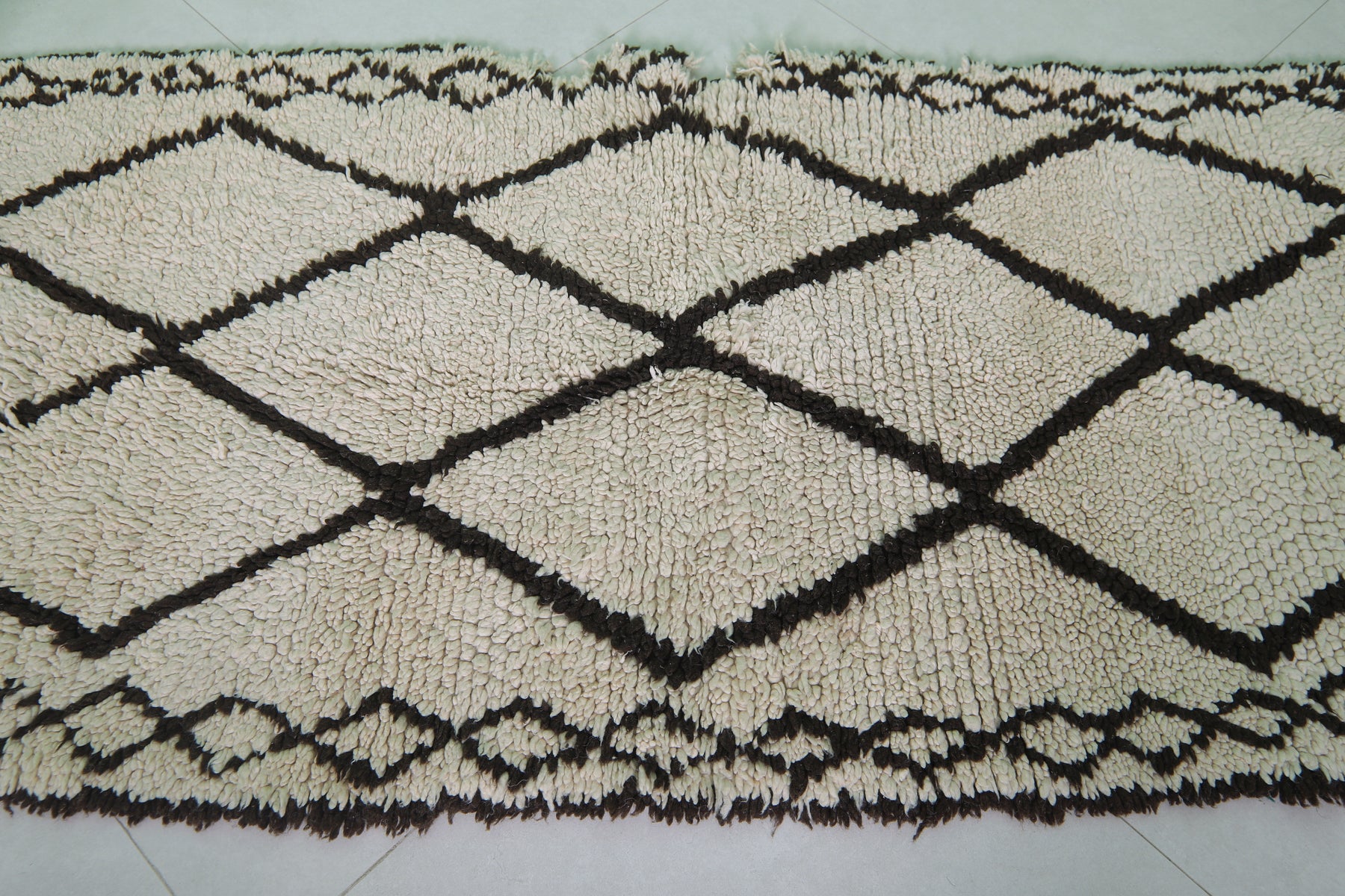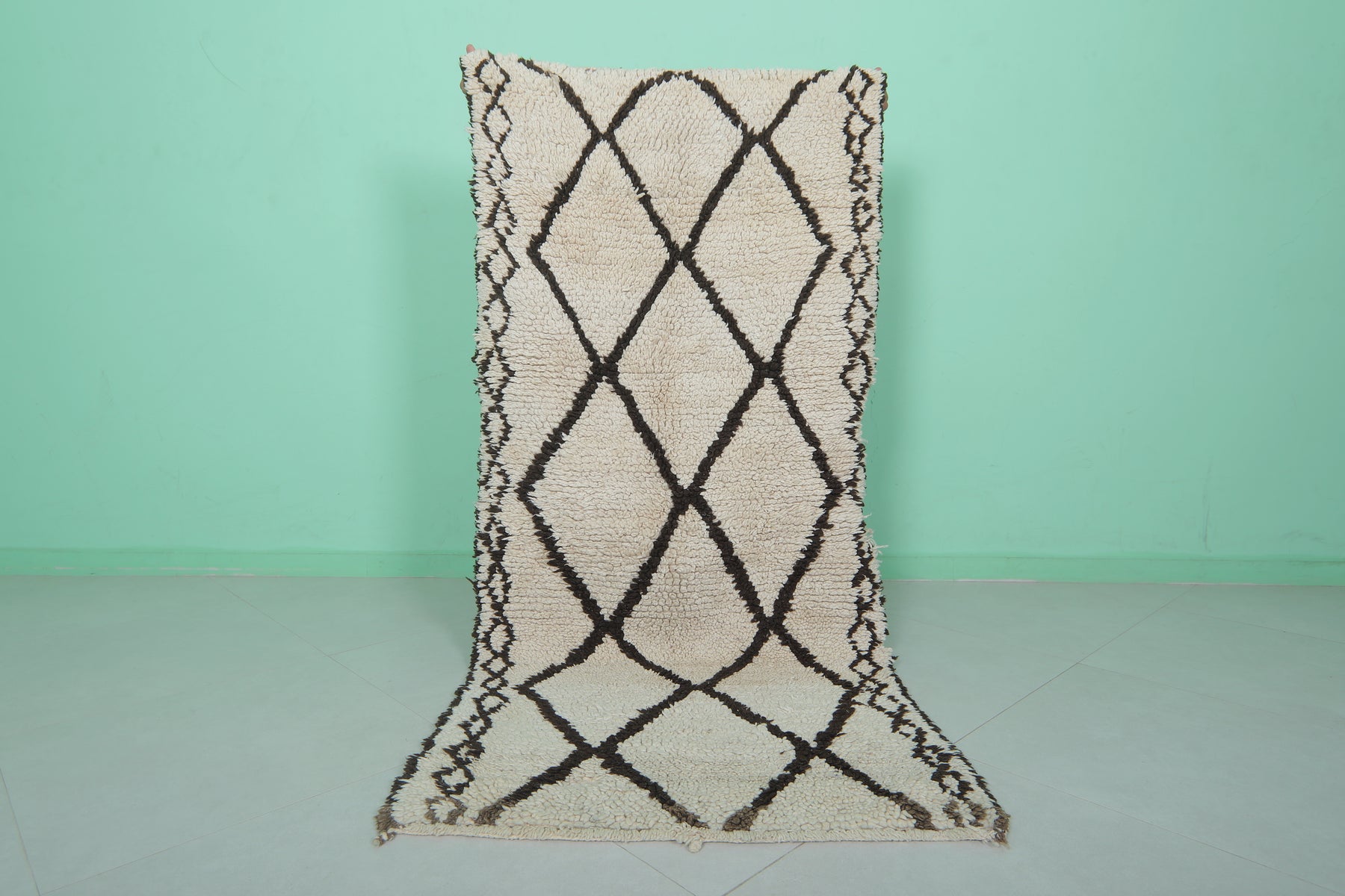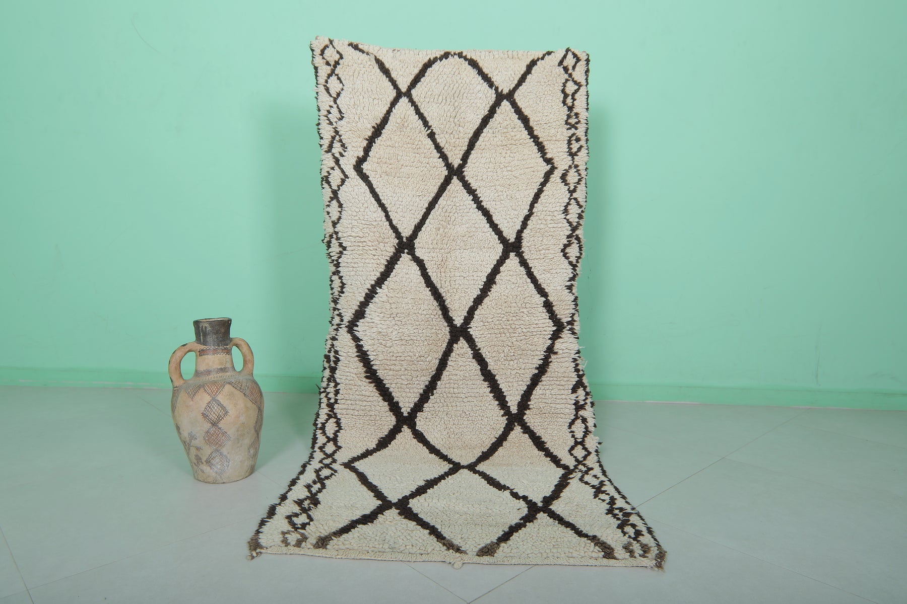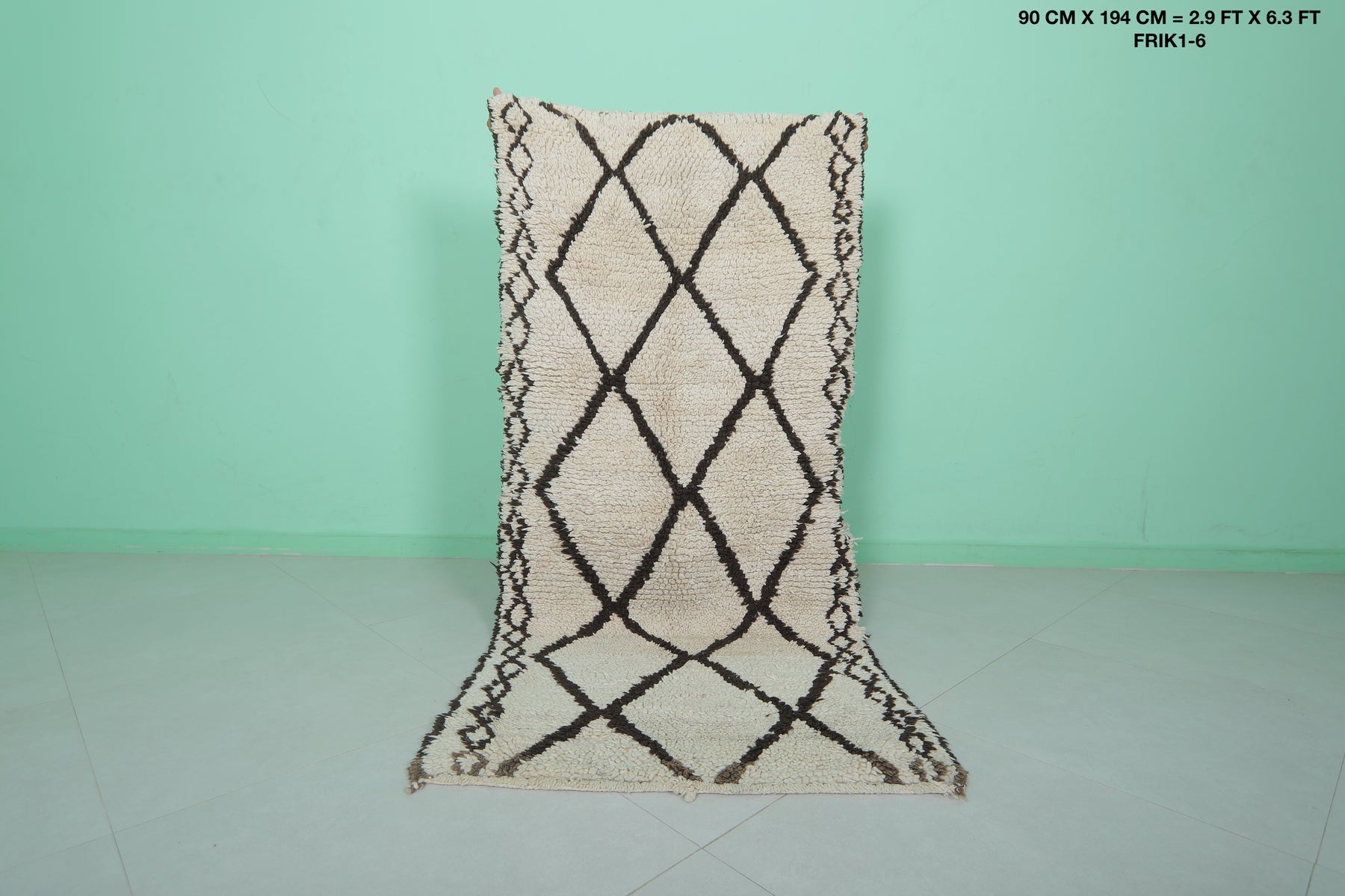 - Classic Beni Ourain diamond pattern in black on a neutral base.