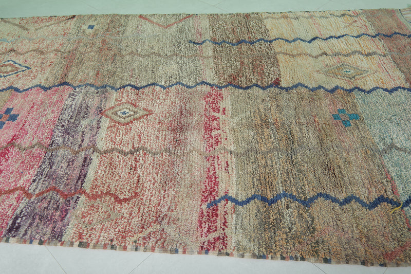 This 5.8 x 9.1 feet handmade Moroccan Berber rug features an elegant blend of soft pastel hues and intricate tribal motifs, combining traditional craftsmanship with a refined vintage aesthetic. Handwoven from high-quality wool, it offers a plush, soft, and durable texture that enhances any space. Perfect for living rooms, bedrooms, or creative interiors, this unique rug adds warmth, character, and an artistic touch while complementing both bohemian and modern décor styles.