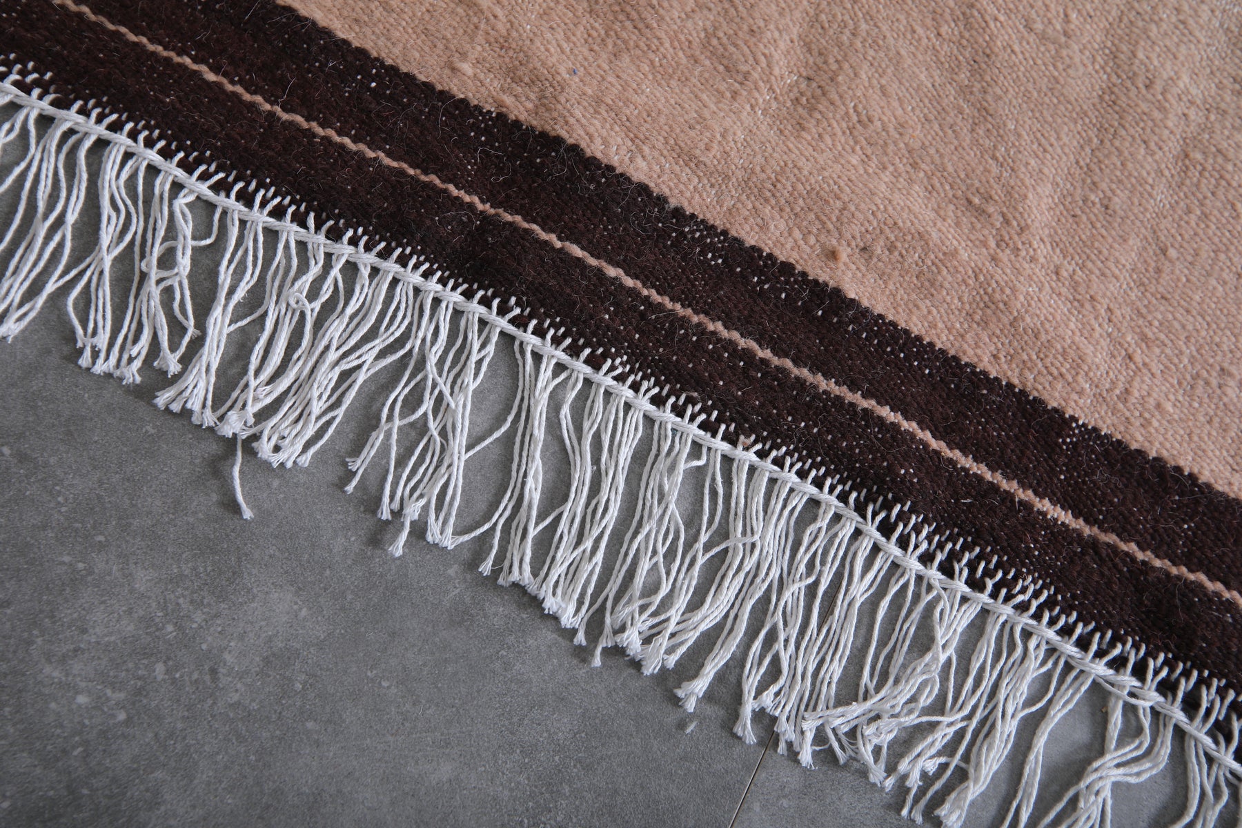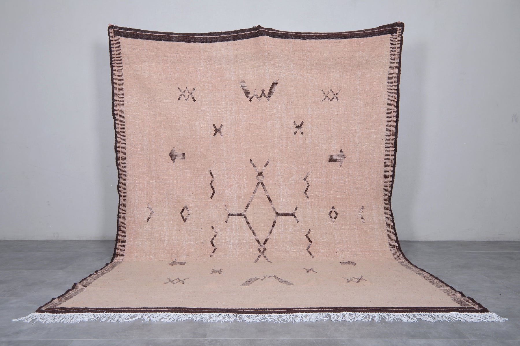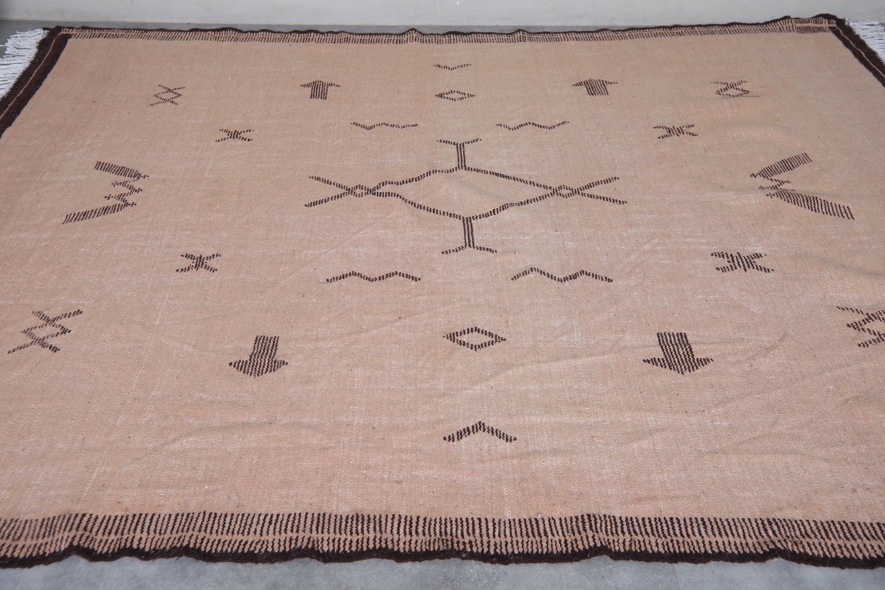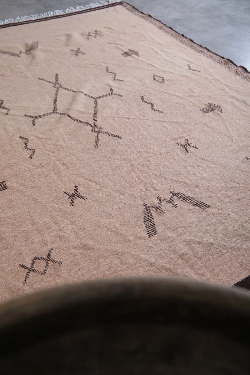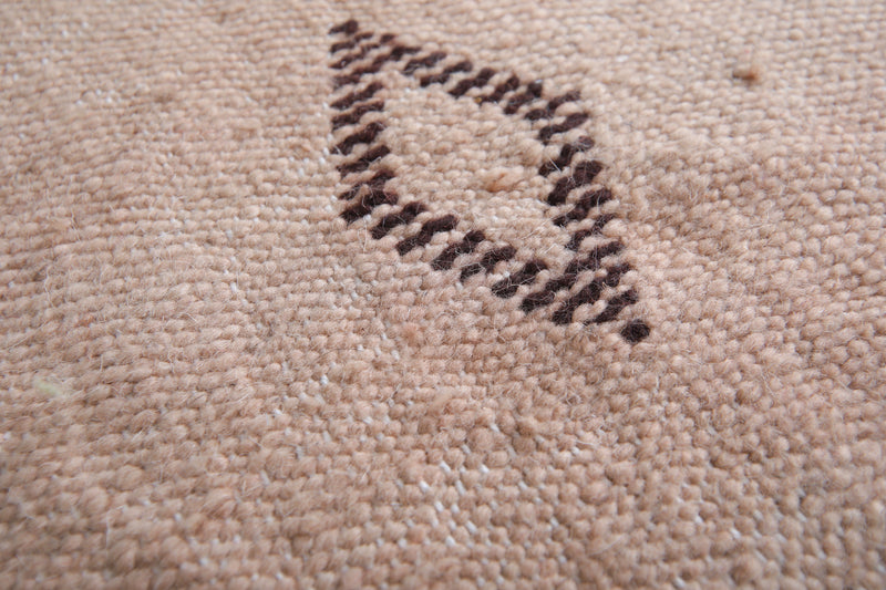 Elevate your space with this handcrafted pink Moroccan flatwoven rug, adorned with traditional brown geometric motifs. Woven from high-quality natural wool, this rug blends authentic Berber artistry with minimalist charm. Its soft pink hue and earthy brown patterns add a subtle warmth and cultural depth to modern interiors. Perfect for living rooms, bedrooms, or creative spaces, this lightweight kilim-style rug offers both texture and timeless style. A unique piece that reflects the soul of Moroccan craftsmanship, it’s an ideal choice for those seeking bohemian elegance with a touch of tradition.