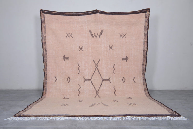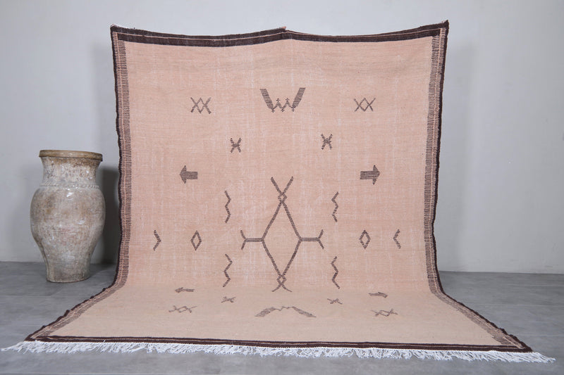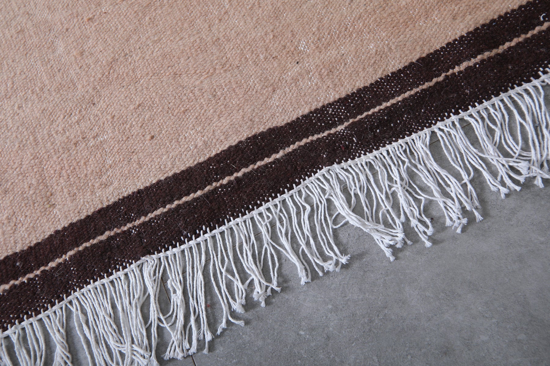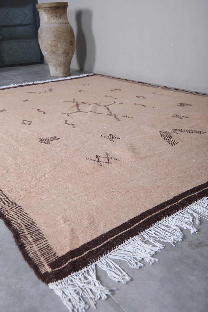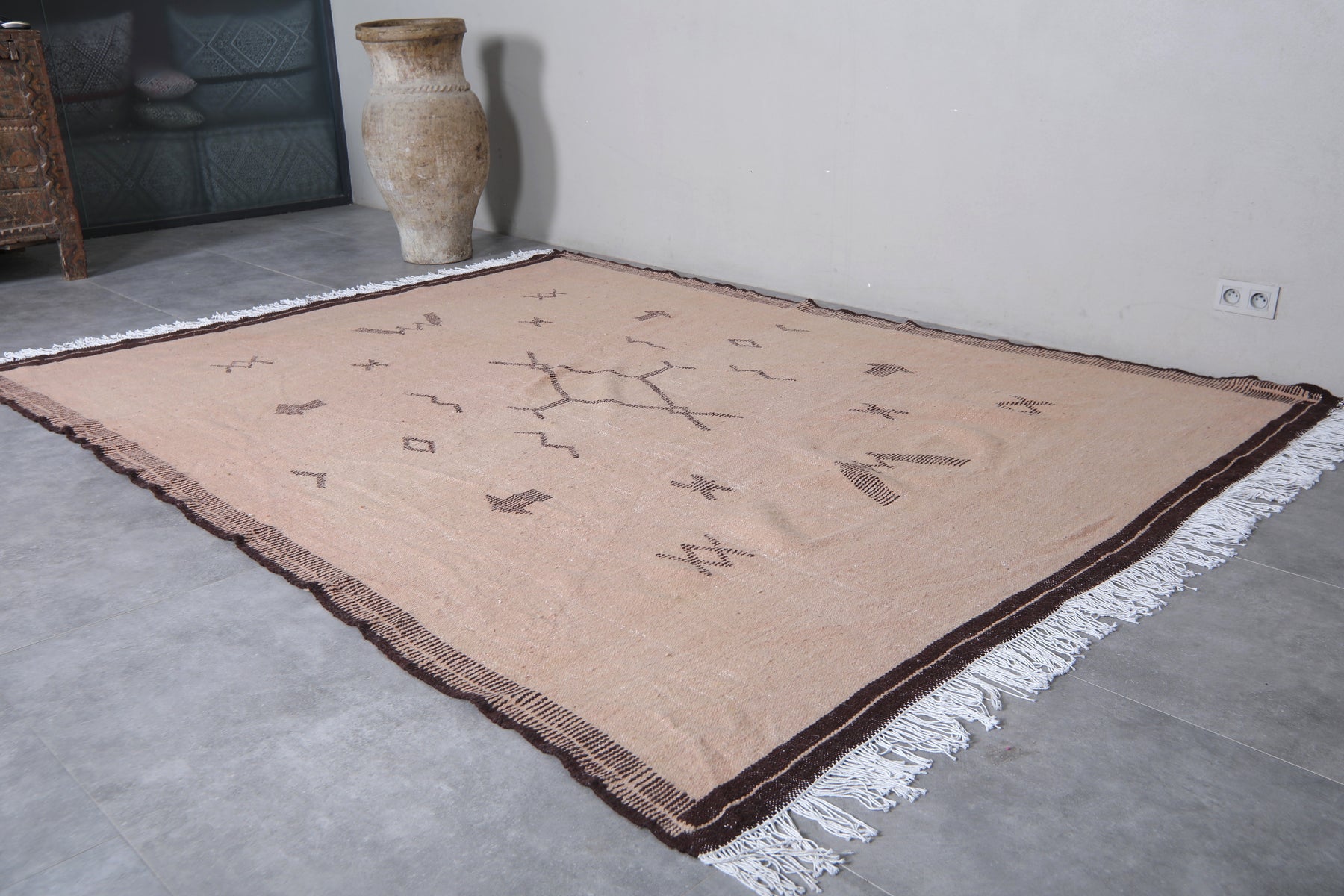 Elevate your space with this handcrafted pink Moroccan flatwoven rug, adorned with traditional brown geometric motifs. Woven from high-quality natural wool, this rug blends authentic Berber artistry with minimalist charm. Its soft pink hue and earthy brown patterns add a subtle warmth and cultural depth to modern interiors. Perfect for living rooms, bedrooms, or creative spaces, this lightweight kilim-style rug offers both texture and timeless style. A unique piece that reflects the soul of Moroccan craftsmanship, it’s an ideal choice for those seeking bohemian elegance with a touch of tradition.
