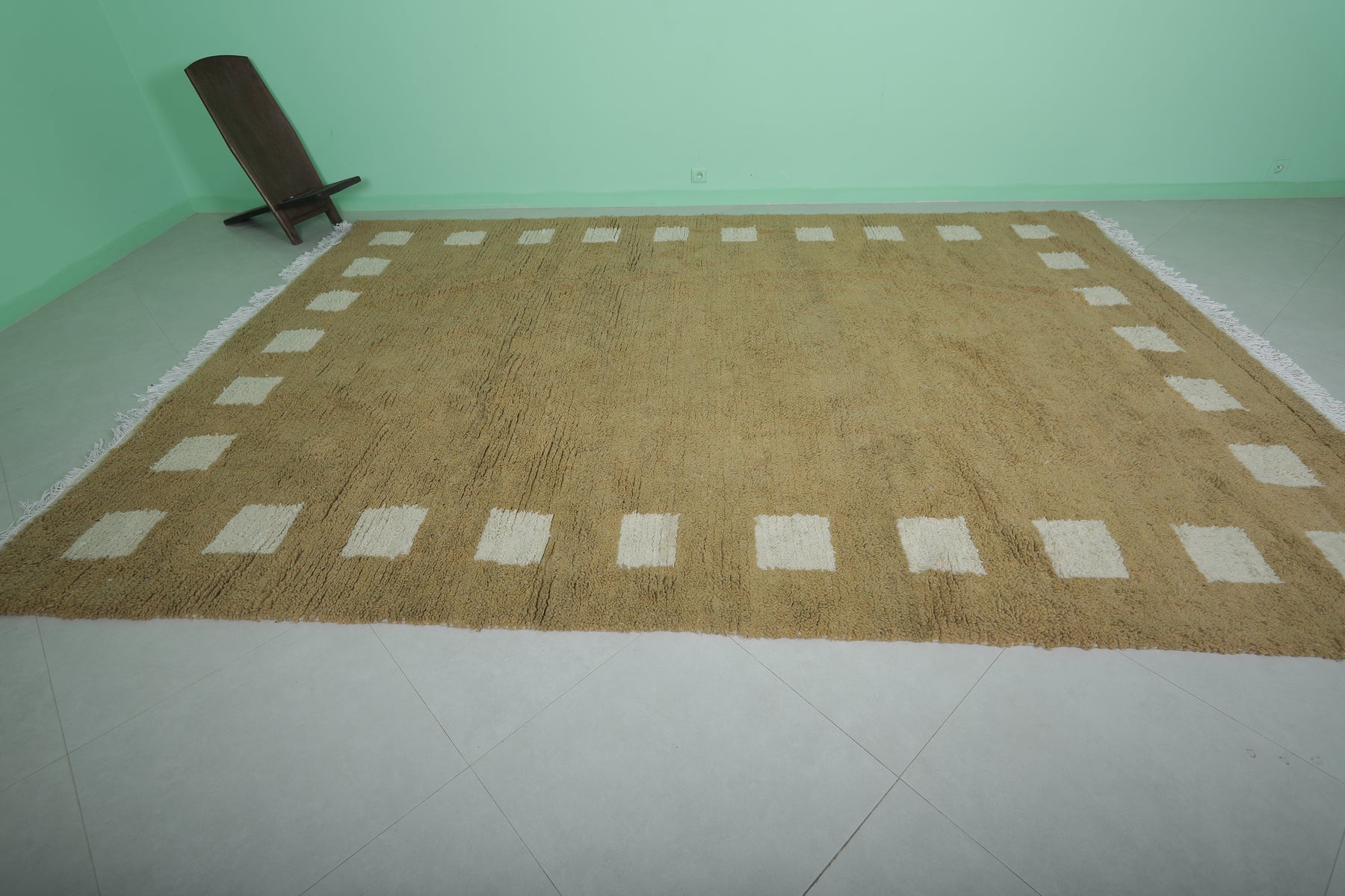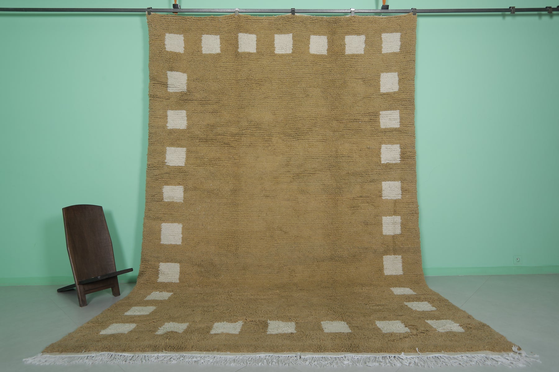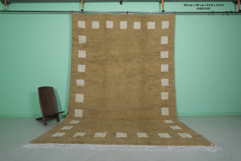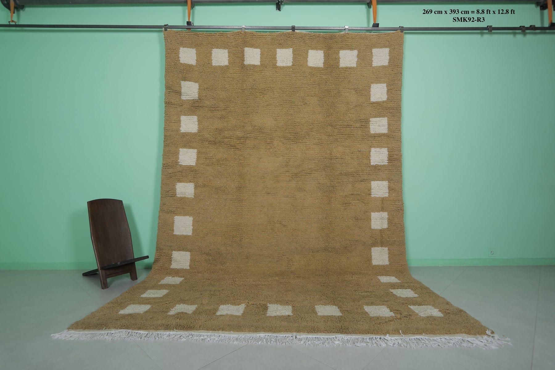 Elevate your interior with this stunning handmade Moroccan rug, measuring 8.8 x 12.8 feet (269 CM x 393 CM). Crafted by skilled artisans, this rug features a unique bordered square pattern in neutral tones, adding sophistication and warmth to your living space. Made from high-quality wool, it offers a plush texture and exceptional durability, perfect for larger areas like living rooms, dining rooms, or offices. The timeless design blends seamlessly with contemporary, bohemian, or classic decor styles. Invest in this luxurious, handwoven Moroccan masterpiece for a touch of elegance and authenticity in your home.