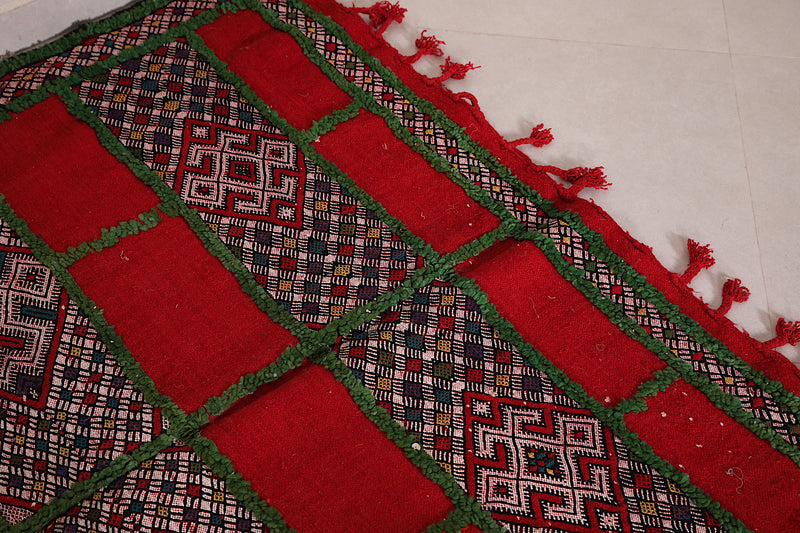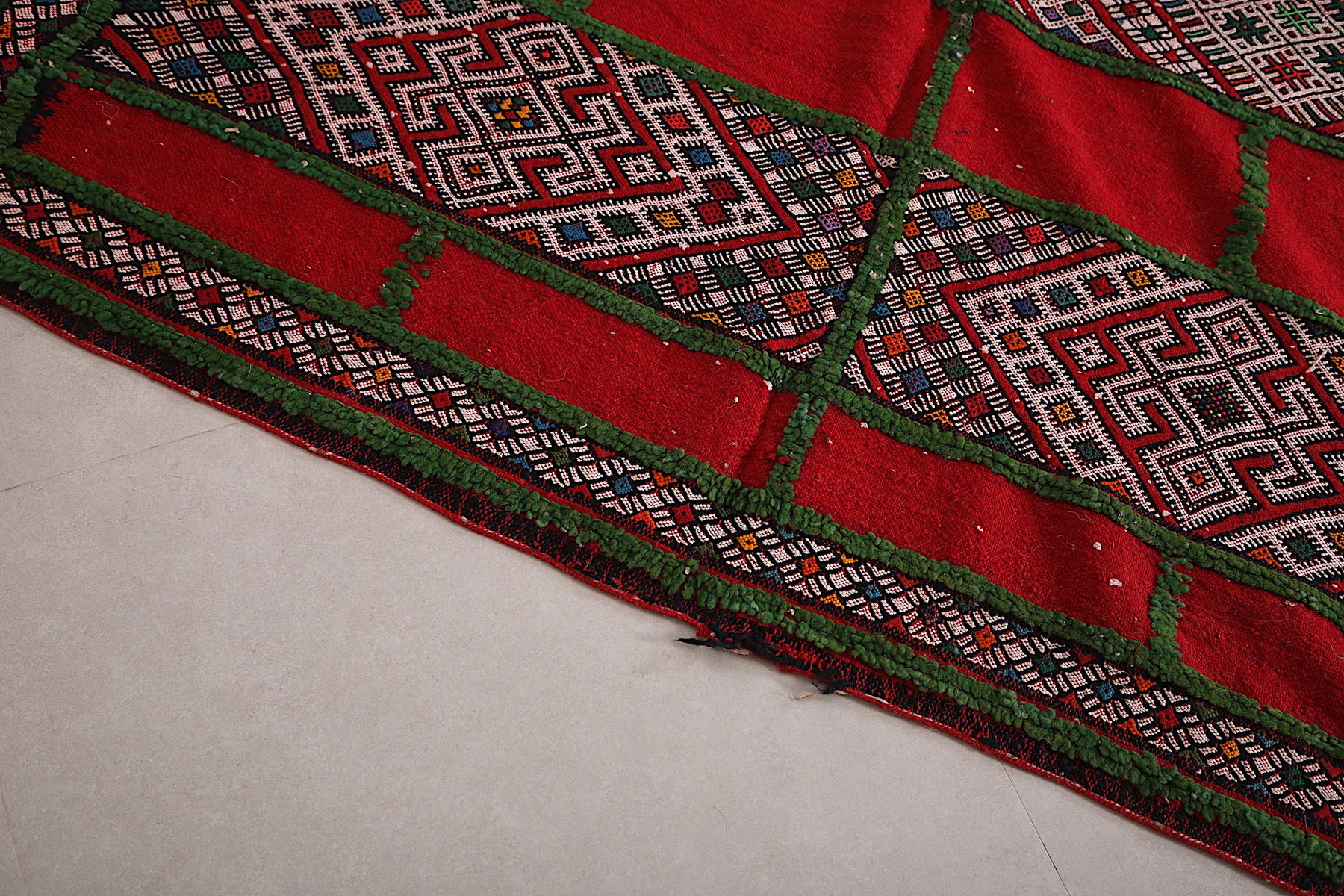Add bold personality to your space with this Handmade Moroccan Runner Rug, measuring 4.6 x 10.6 feet. Handwoven in Morocco, this vintage Berber carpet features intricate geometric motifs and a striking red and green color scheme. Its long, narrow shape and traditional design make it ideal for hallways, large entryways, or open living areas craving a pop of cultural flair.