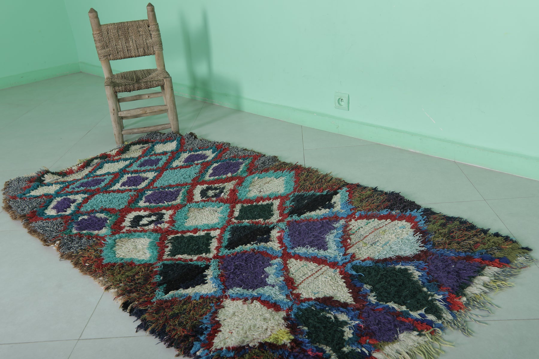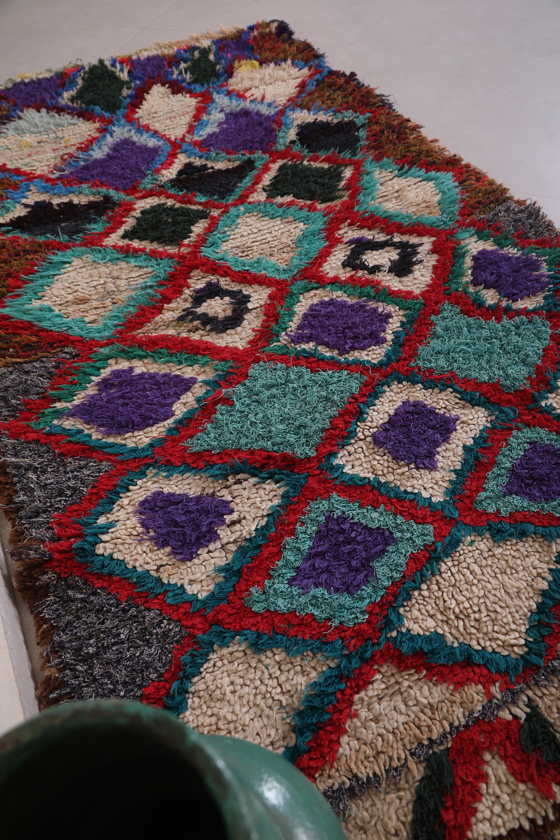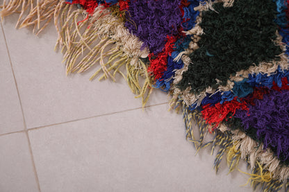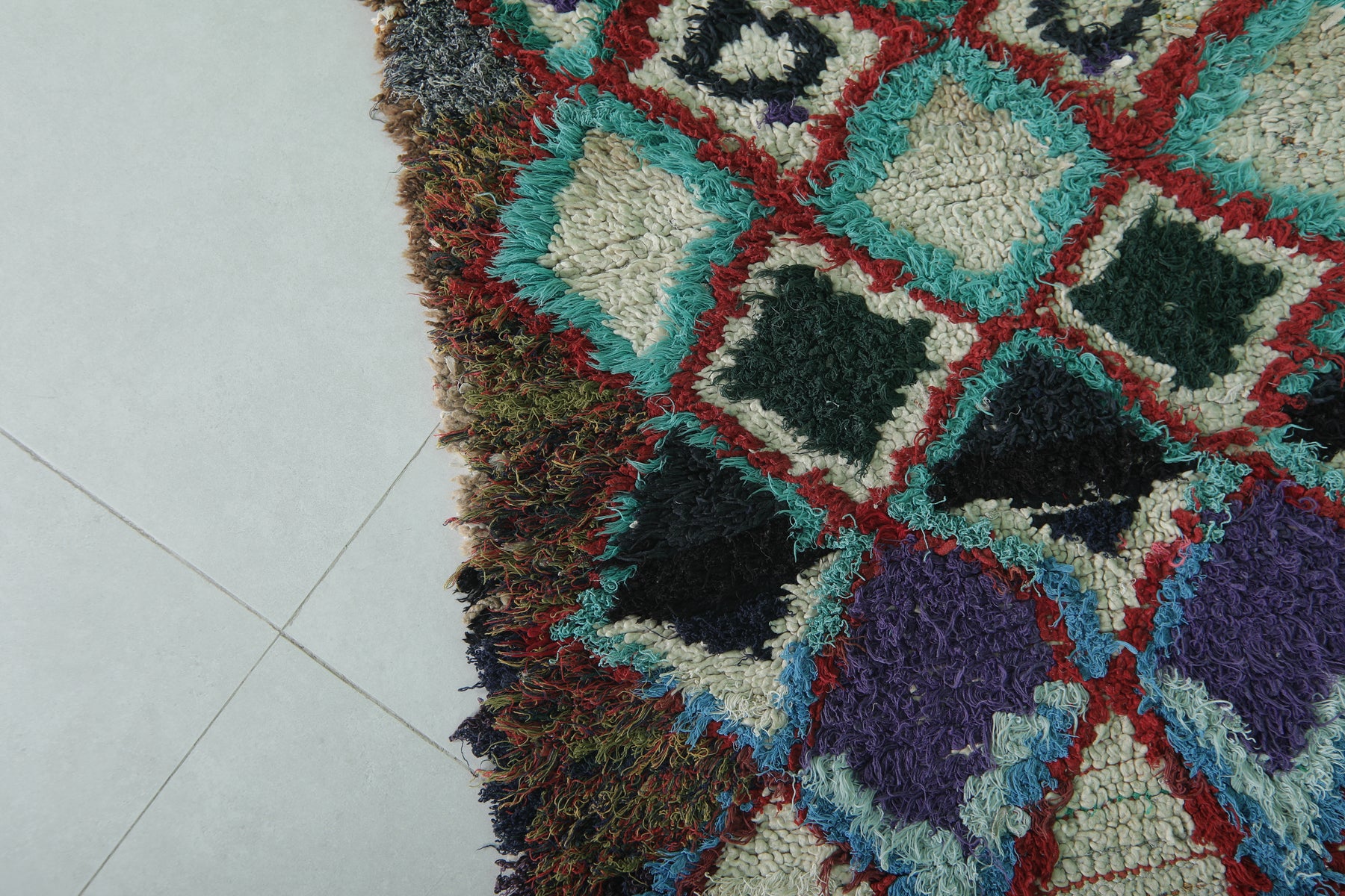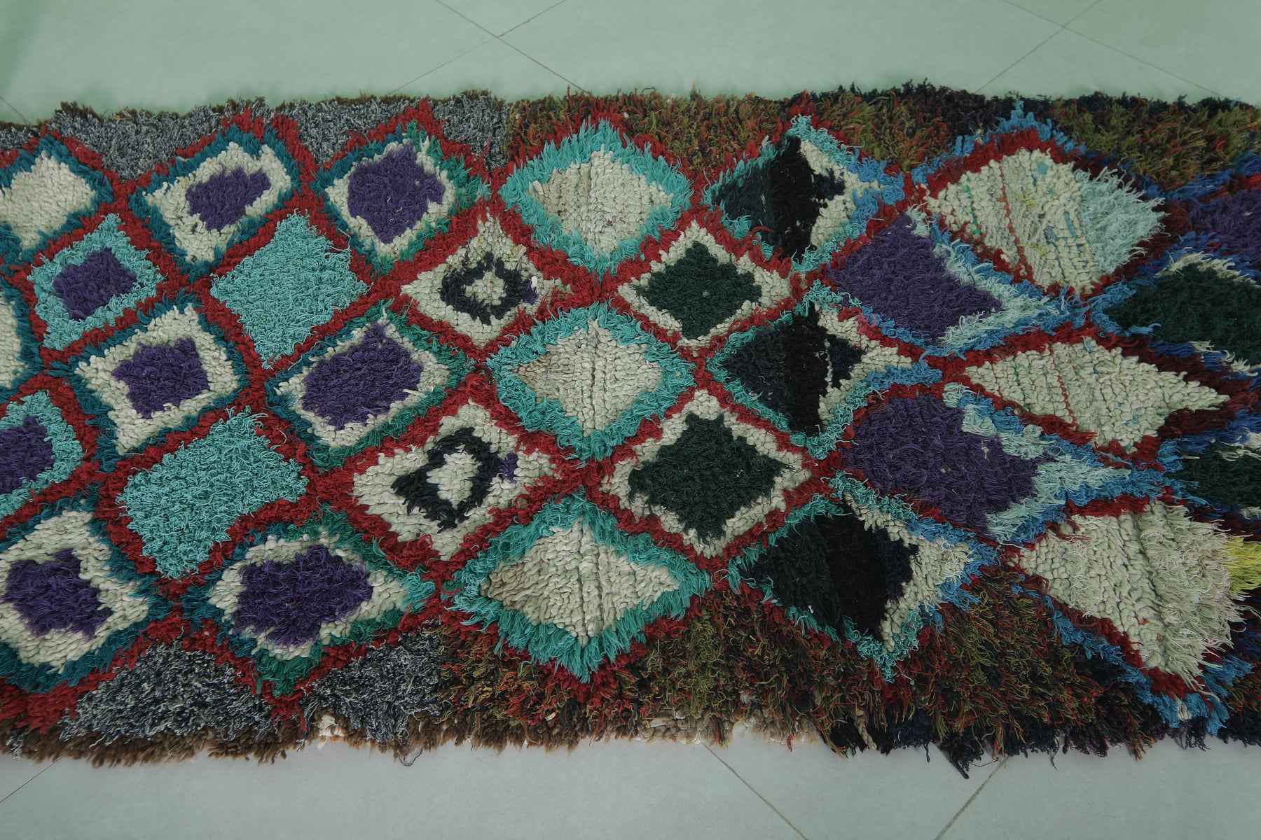 Celebrate tradition and bold design with this Vintage Handmade Moroccan Berber Runner Rug, sized at 3.1 x 6 feet. Handwoven by skilled artisans in Morocco, this one-of-a-kind rug features a captivating diamond grid in a lively mix of purples, blacks, reds, and creams. The shaggy texture adds inviting warmth, while the vivid geometric patterns offer a dynamic focal point. Perfect for hallways, studios, or boho-inspired interiors, this rug brings authentic Berber charm into your space.