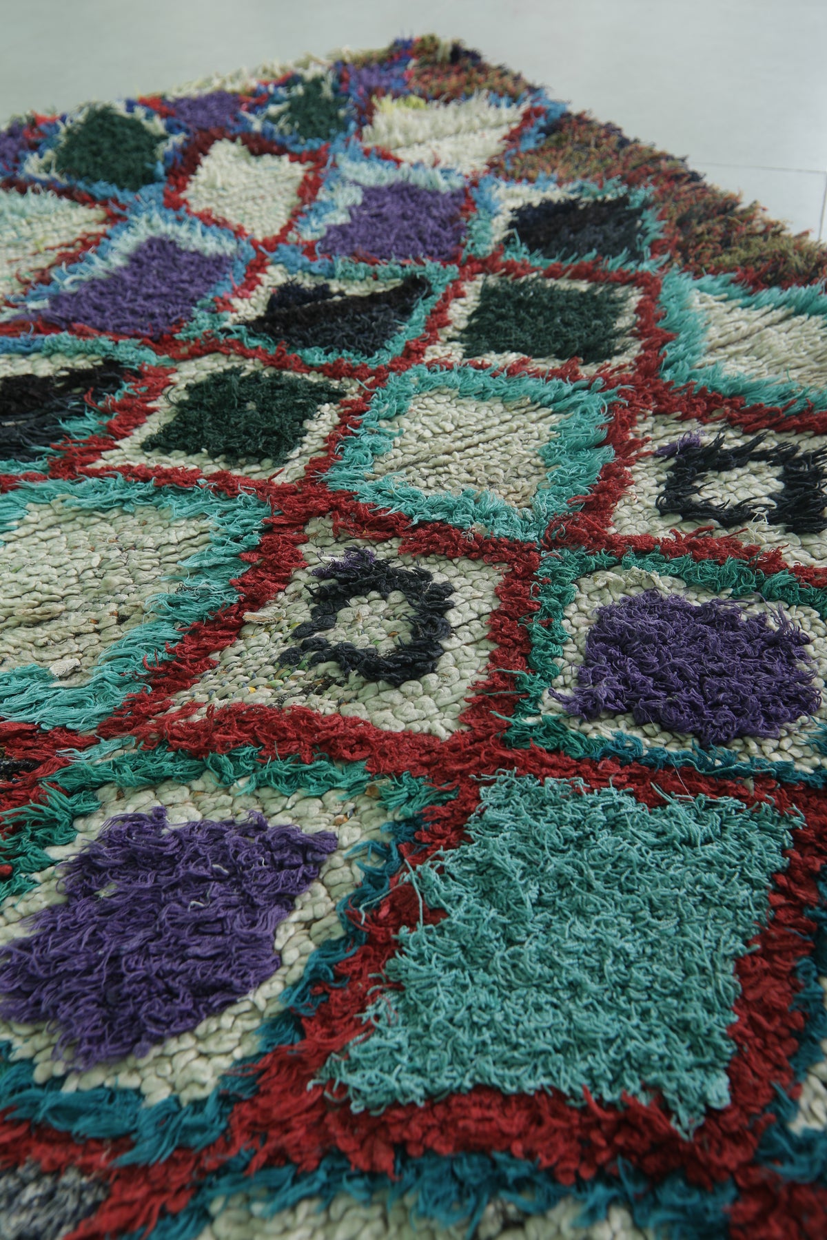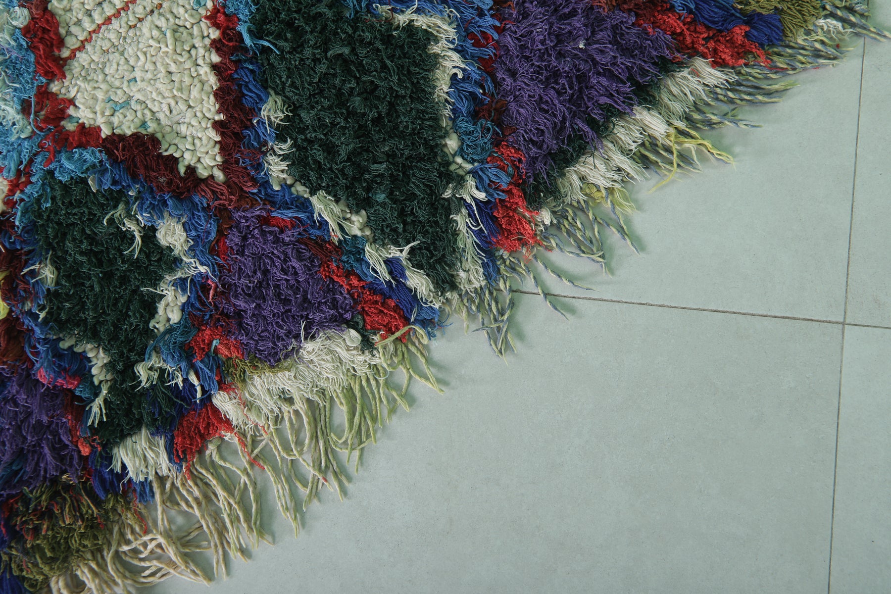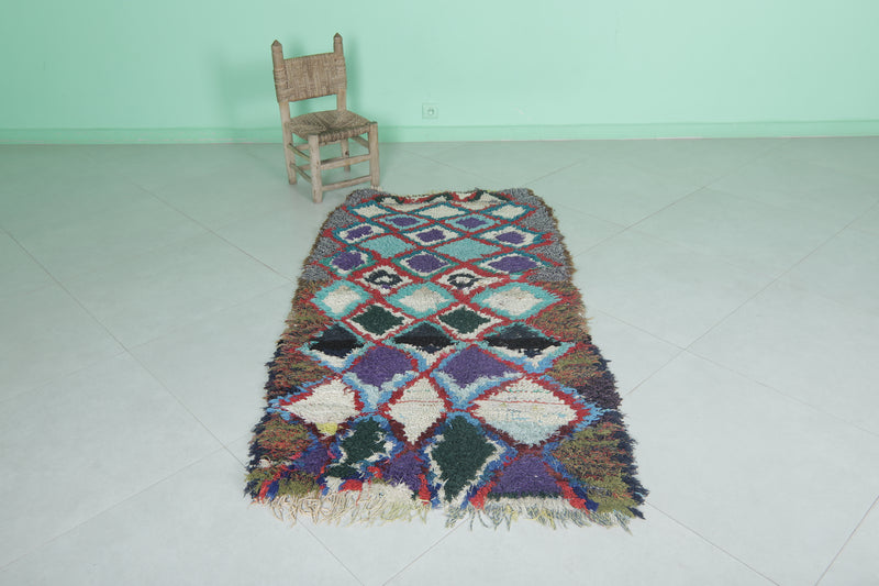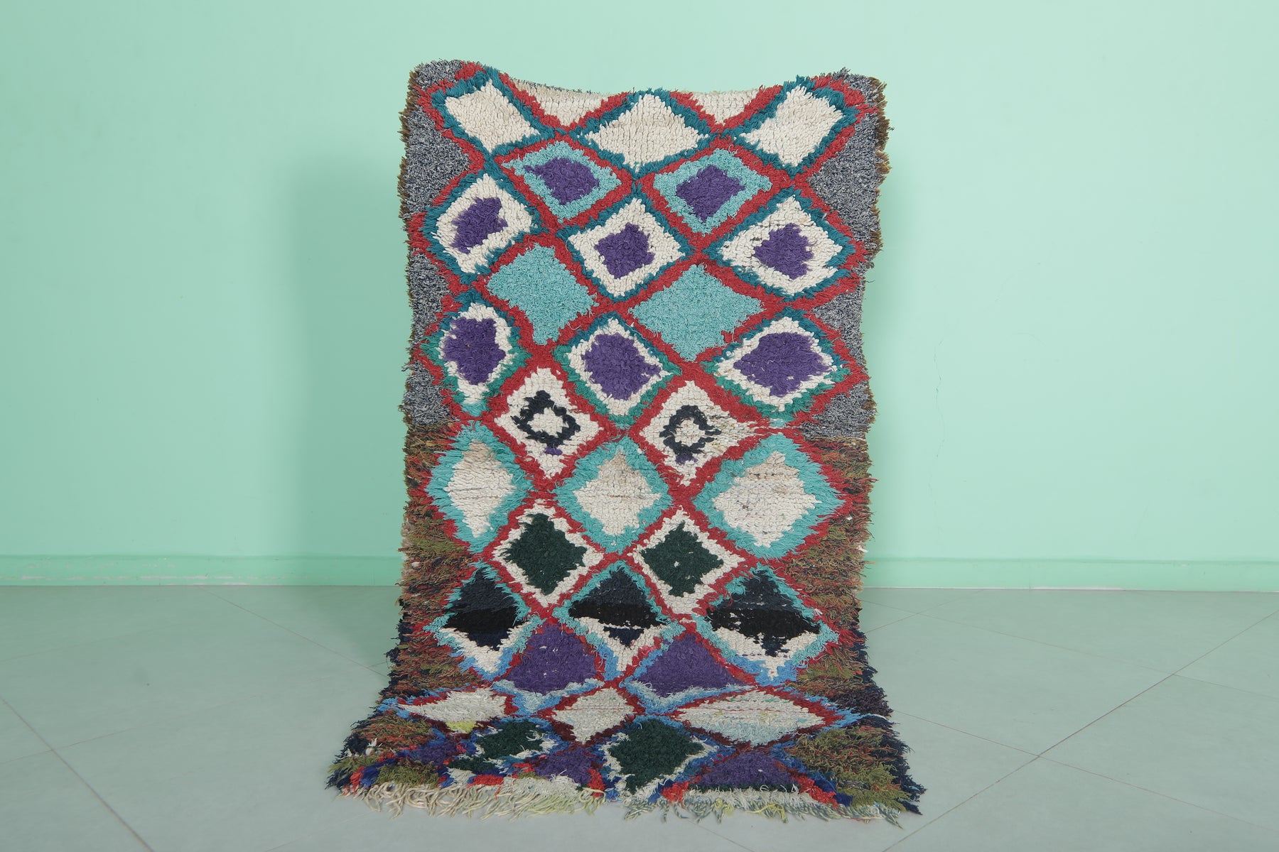 Celebrate tradition and bold design with this Vintage Handmade Moroccan Berber Runner Rug, sized at 3.1 x 6 feet. Handwoven by skilled artisans in Morocco, this one-of-a-kind rug features a captivating diamond grid in a lively mix of purples, blacks, reds, and creams. The shaggy texture adds inviting warmth, while the vivid geometric patterns offer a dynamic focal point. Perfect for hallways, studios, or boho-inspired interiors, this rug brings authentic Berber charm into your space.