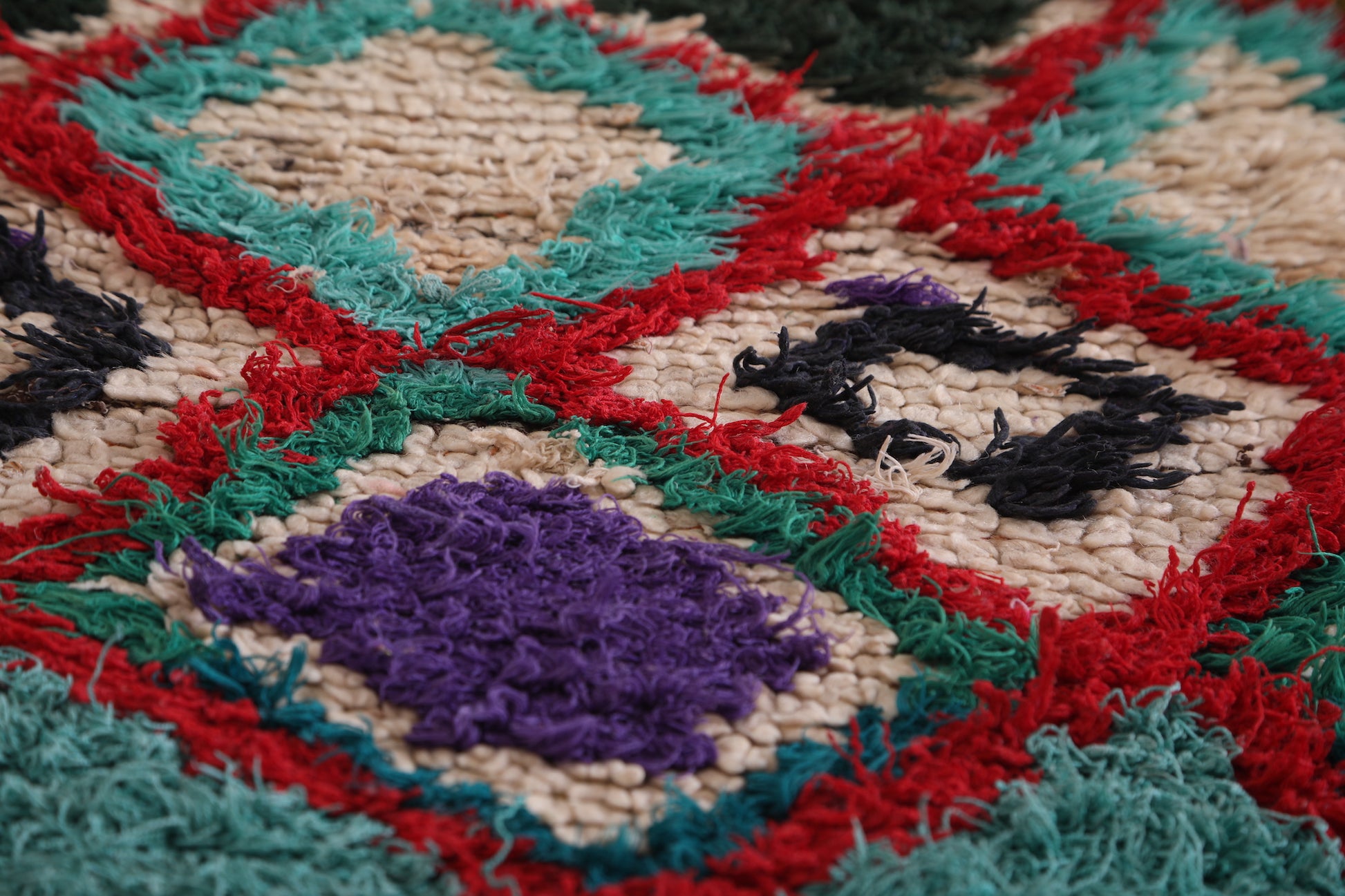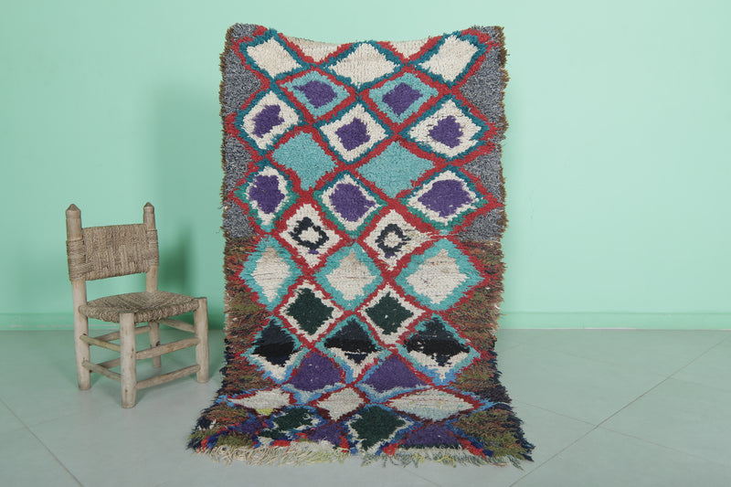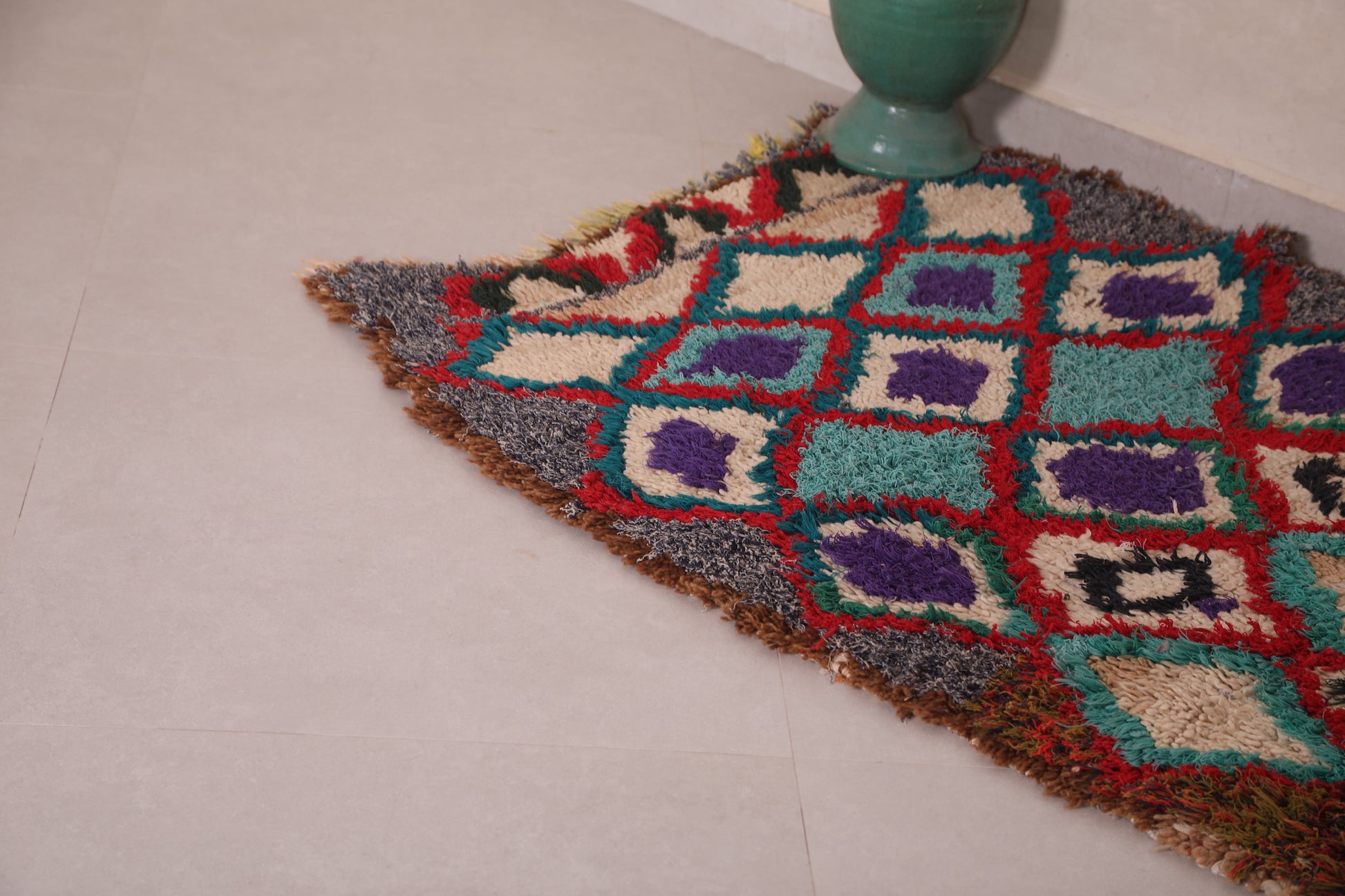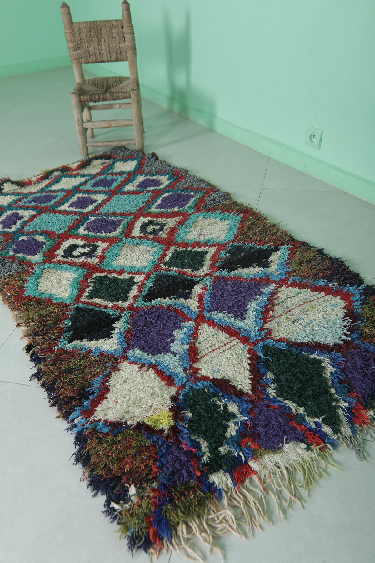 Celebrate tradition and bold design with this Vintage Handmade Moroccan Berber Runner Rug, sized at 3.1 x 6 feet. Handwoven by skilled artisans in Morocco, this one-of-a-kind rug features a captivating diamond grid in a lively mix of purples, blacks, reds, and creams. The shaggy texture adds inviting warmth, while the vivid geometric patterns offer a dynamic focal point. Perfect for hallways, studios, or boho-inspired interiors, this rug brings authentic Berber charm into your space.