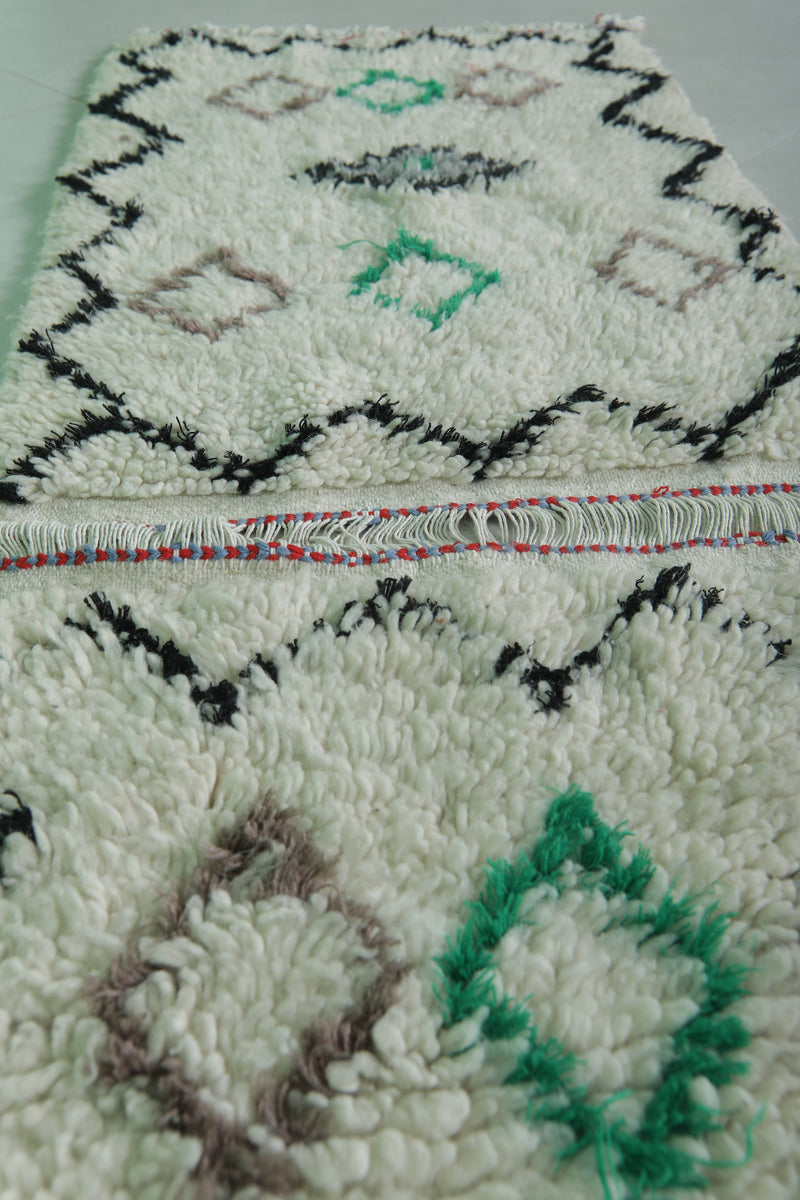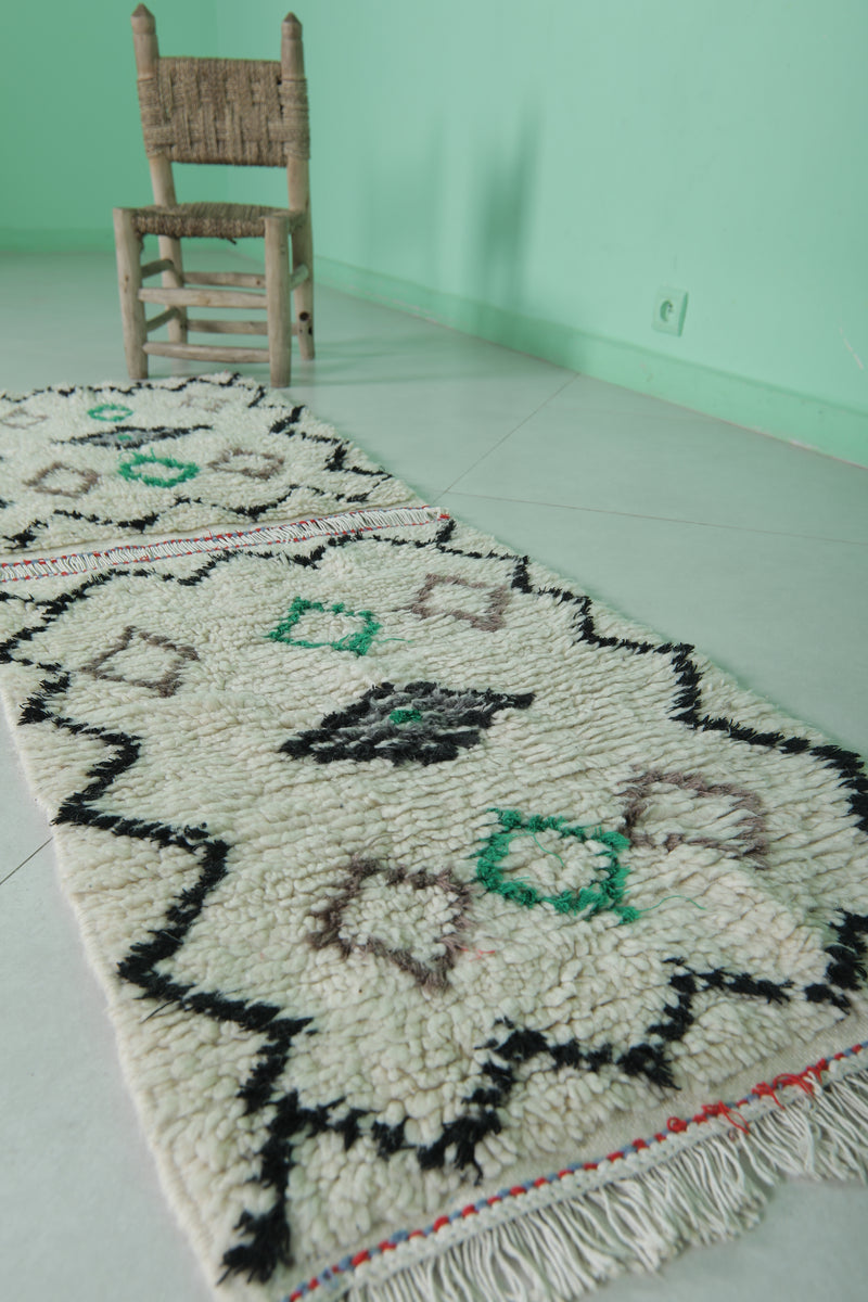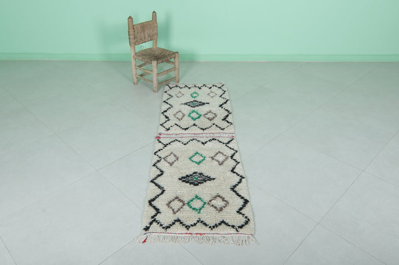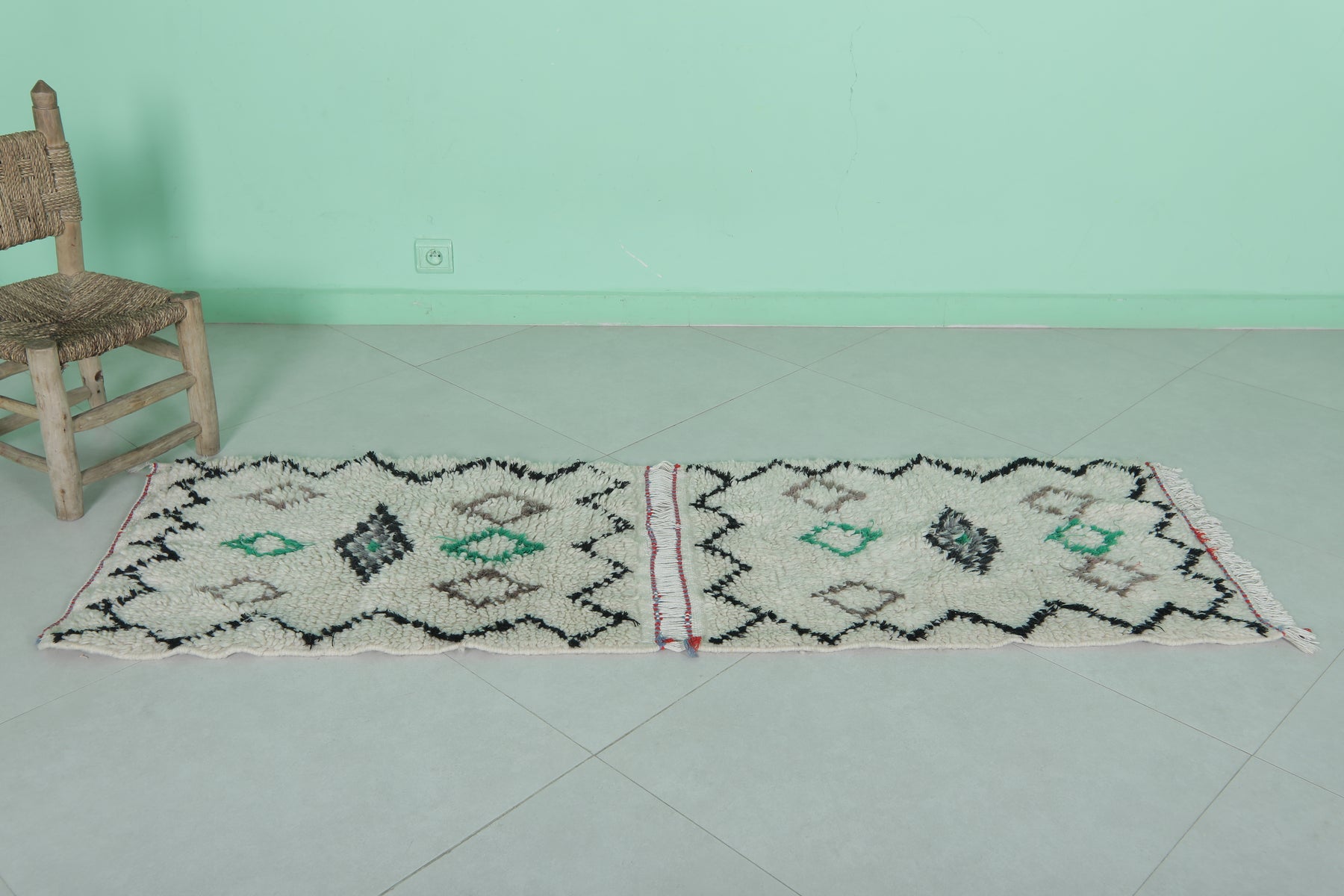 Add Moroccan charm to your home with this Handmade White Berber Runner Rug, sized at 1.9 x 5.9 feet. Handwoven in Morocco, this soft and stylish rug features bold black and green tribal motifs set against a crisp white background. Perfect for hallways, bedrooms, or entryways, it brings warmth, heritage, and minimalistic flair into any space.