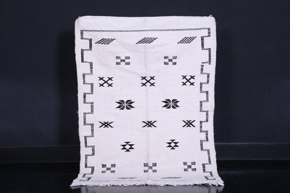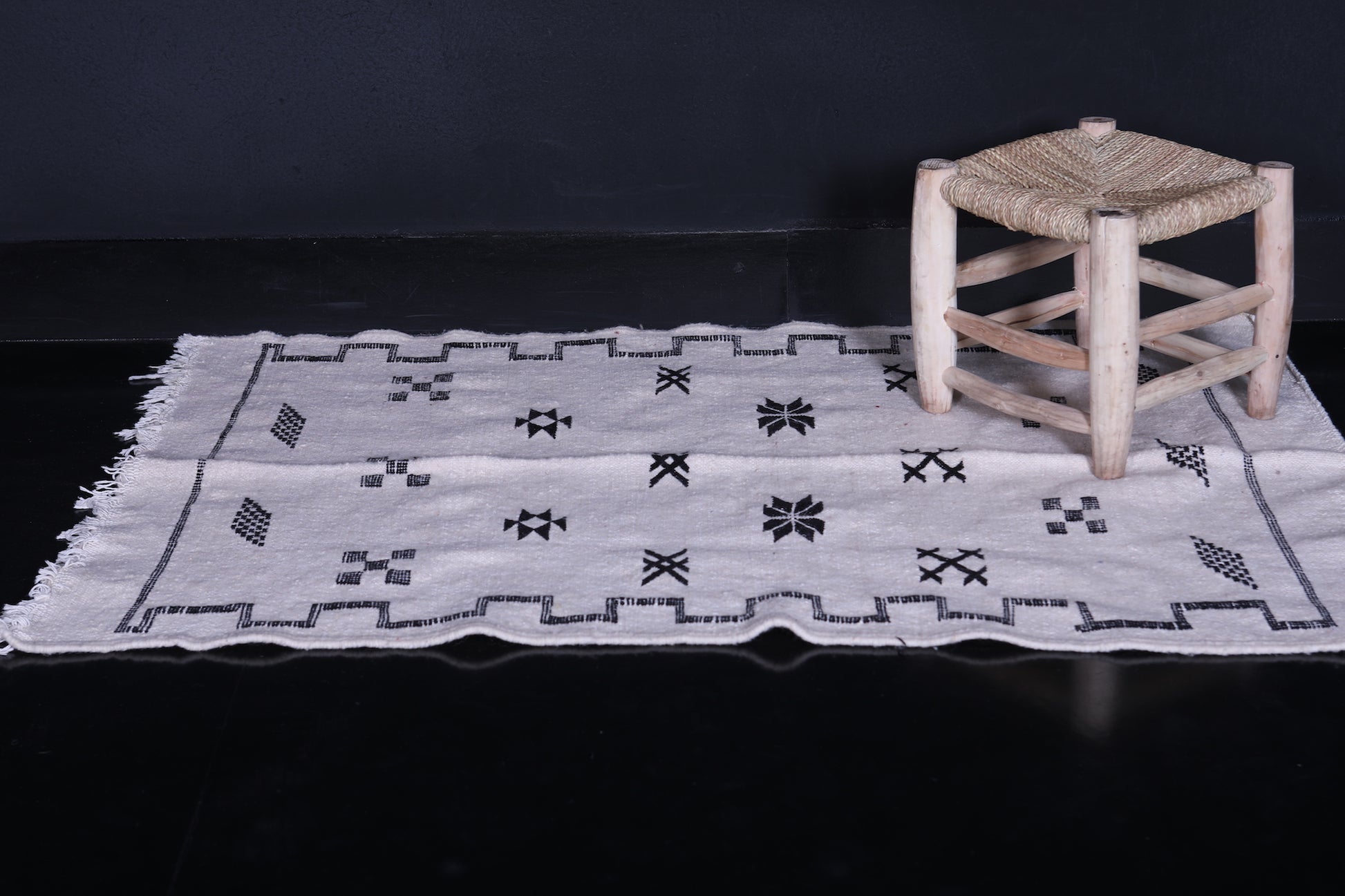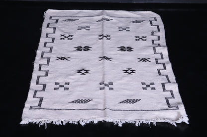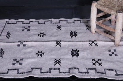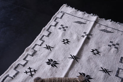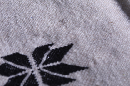 This 3.2 x 4.7 feet black-and-white Moroccan Kilim rug combines minimalist design with traditional Berber artistry. Its monochrome palette and bold geometric patterns create a timeless aesthetic that complements modern, Scandinavian, or boho-chic interiors—ideal for compact spaces like entryways, bedrooms, or reading nooks.