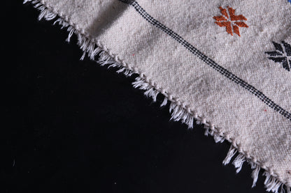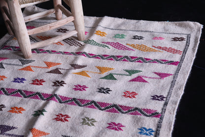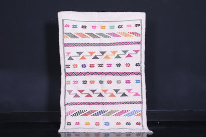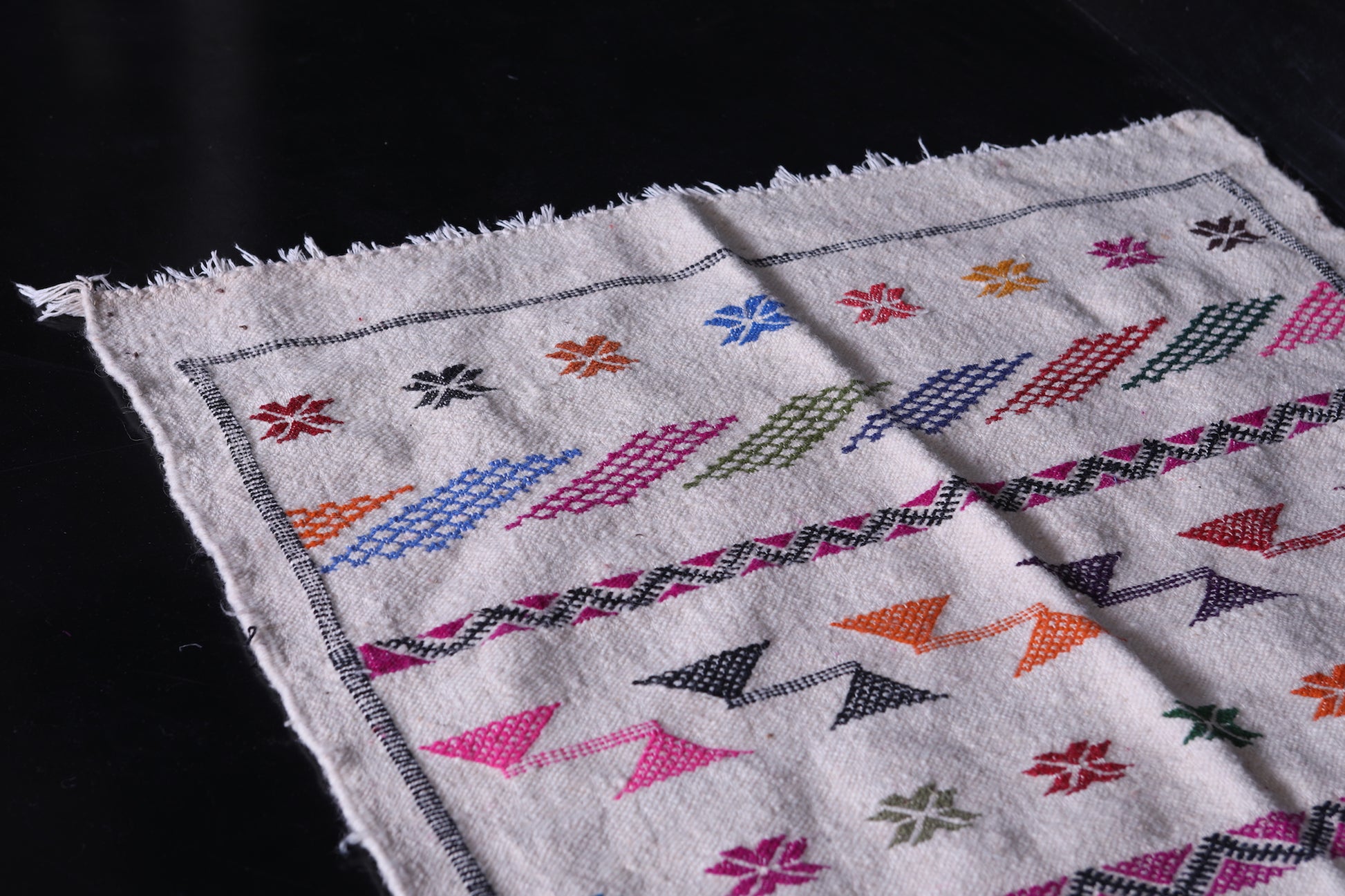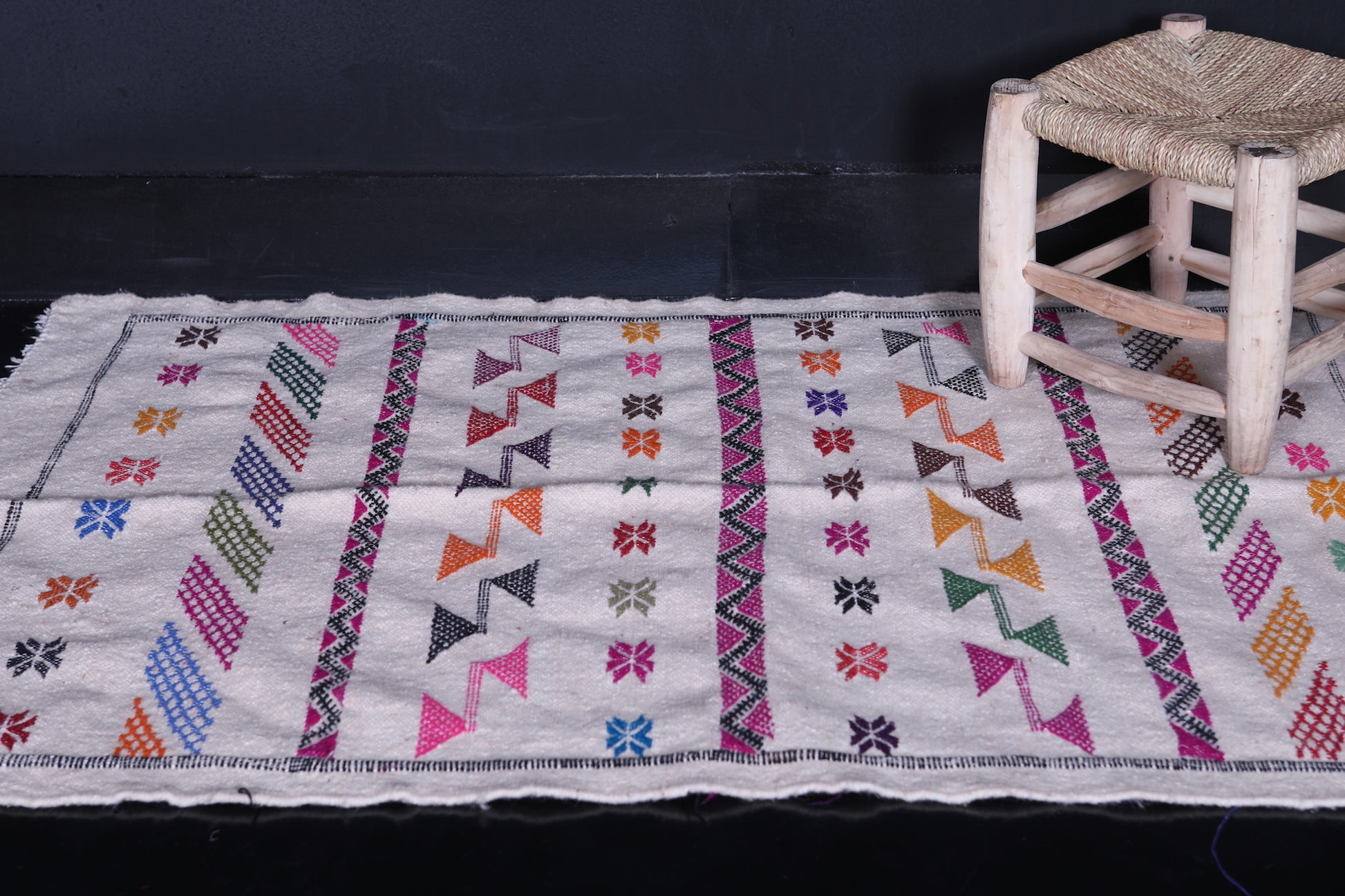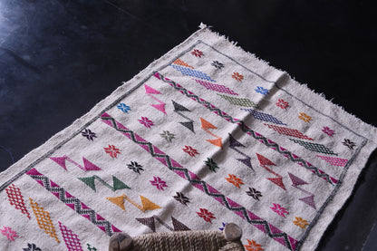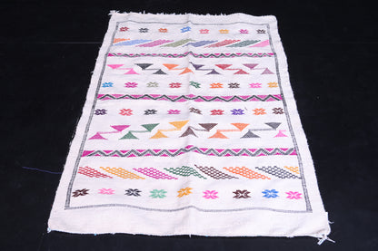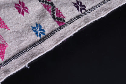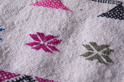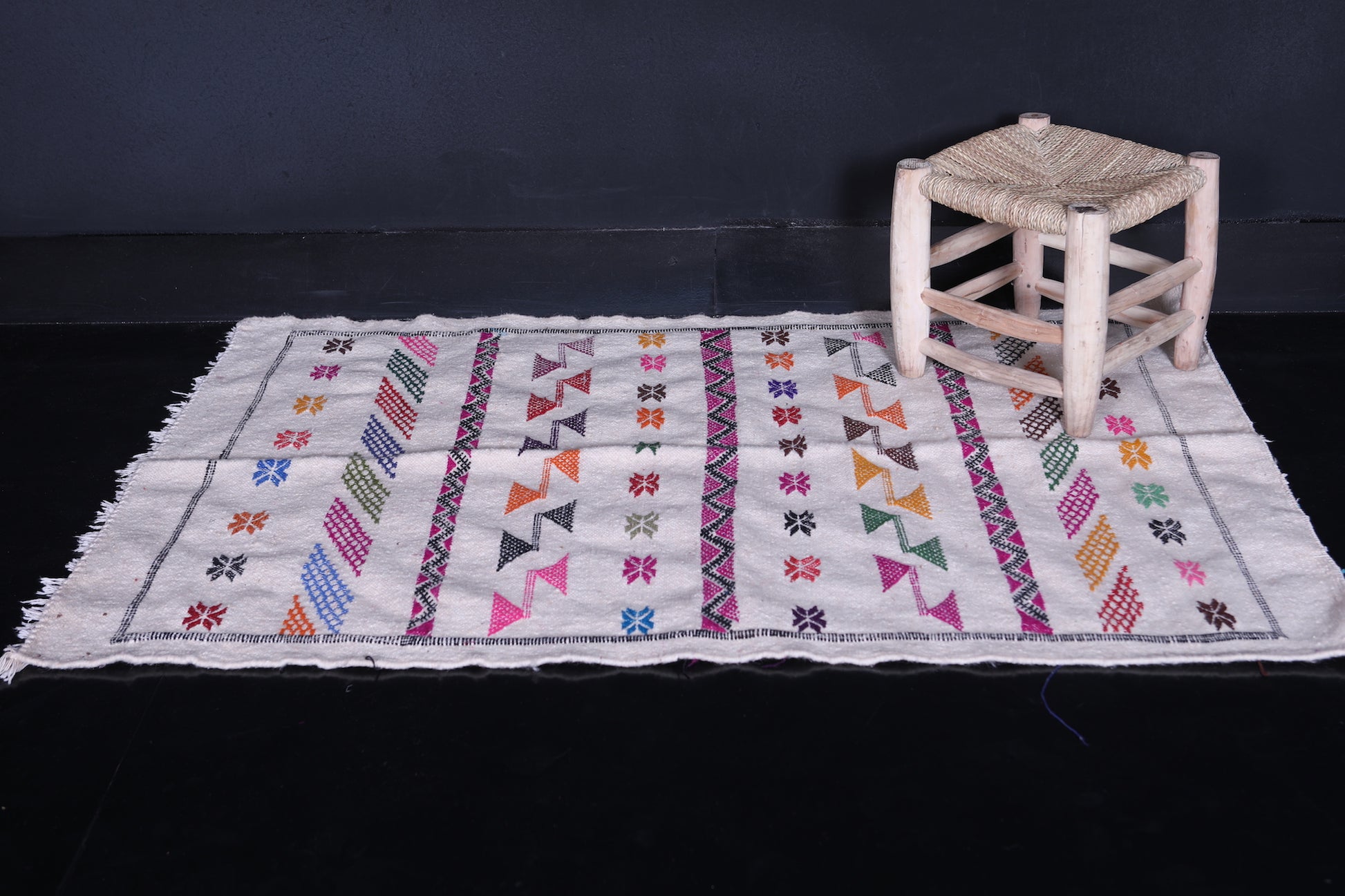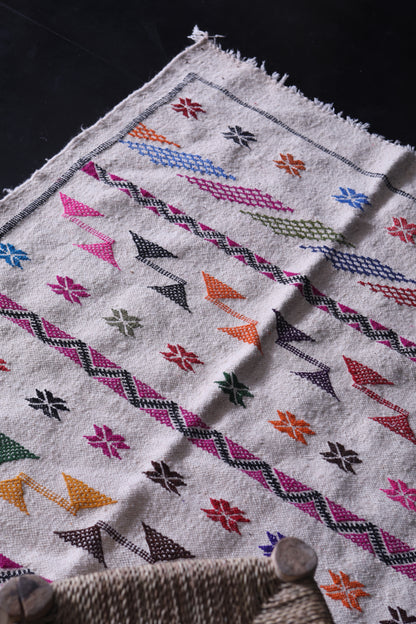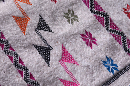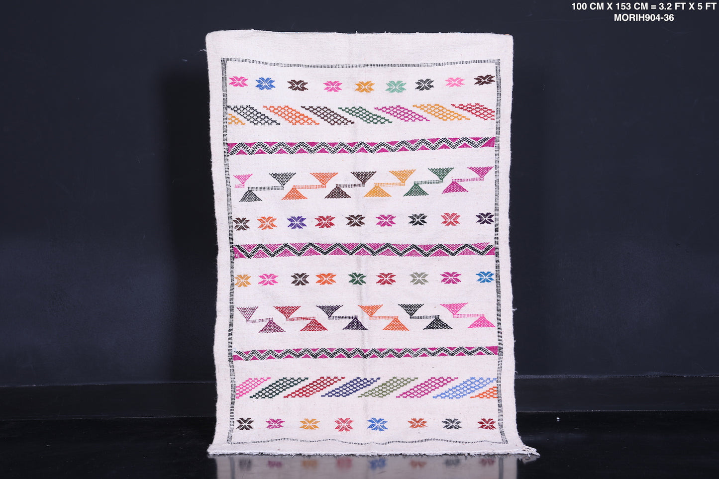 This 3.2 x 5 feet handwoven Kilim rug brings Moroccan tradition to life through its colorful geometric patterns and soft ivory base. Each rug is a unique piece of art, crafted with care using age-old techniques that blend aesthetic charm and functional elegance. Perfect for living rooms, bedrooms, or even as a statement wall hanging, this piece adds warmth and texture to any modern, bohemian, or eclectic space.