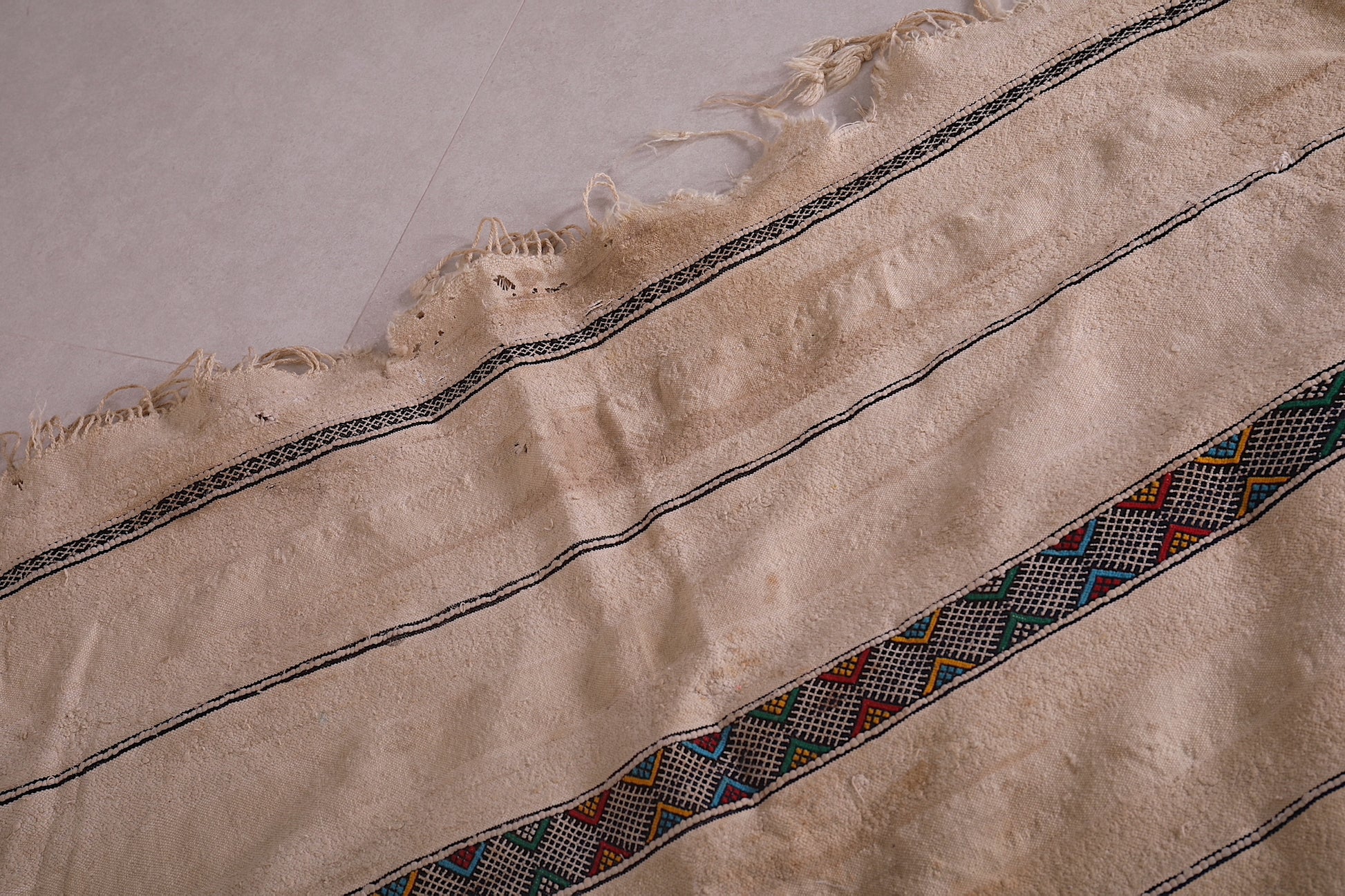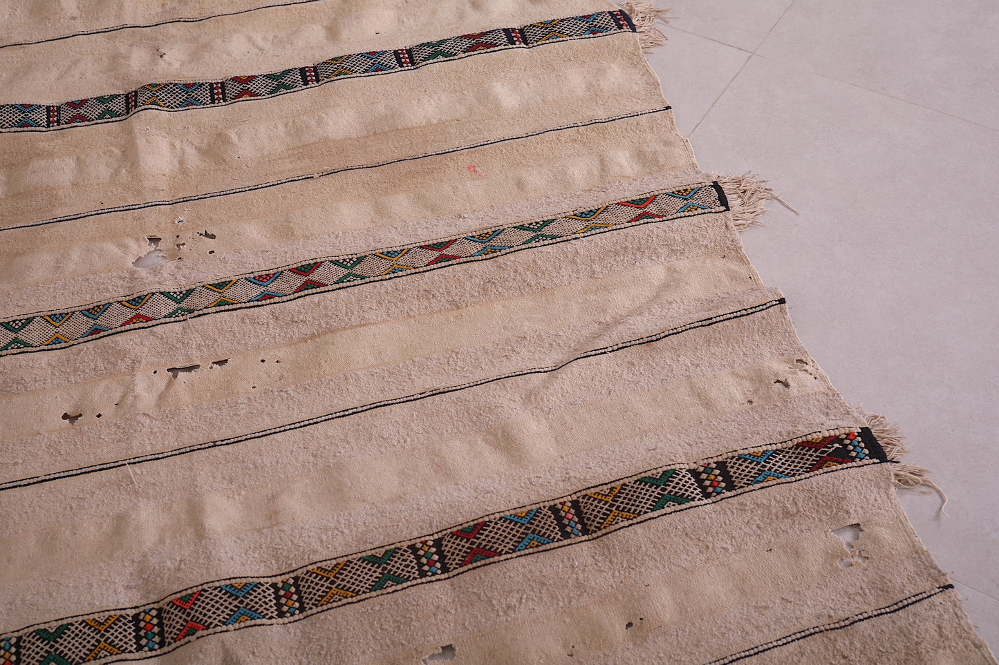 This 3.8 x 7.2 feet Handwoven Kilim Vintage Moroccan Rug showcases intricate Berber patterns with multicolored accents, blending traditional Moroccan artistry with timeless charm. Handwoven from premium natural fibers, it offers durability, lightweight flexibility, and a cozy aesthetic, making it ideal for living rooms, bedrooms, or entryways.