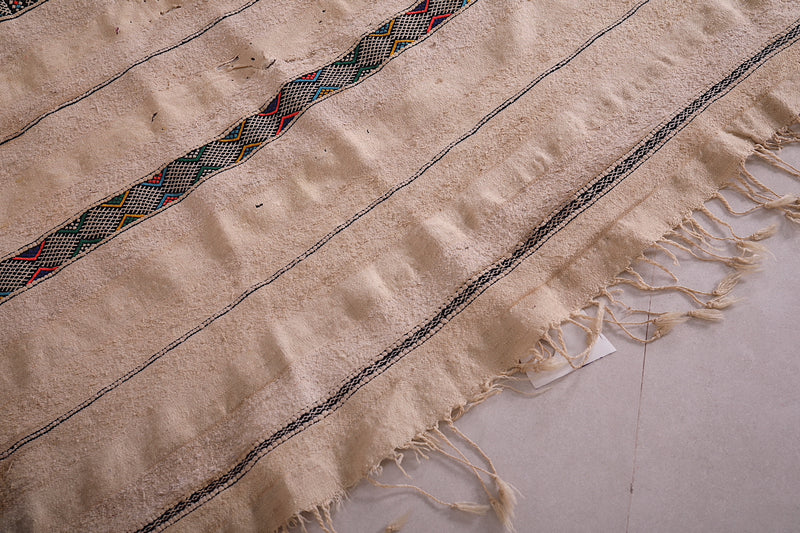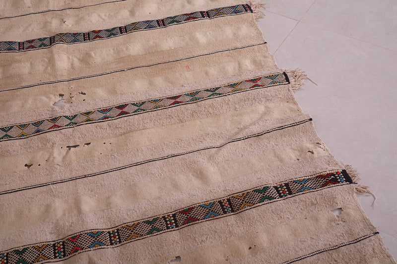 This 3.8 x 7.2 feet Handwoven Kilim Vintage Moroccan Rug showcases intricate Berber patterns with multicolored accents, blending traditional Moroccan artistry with timeless charm. Handwoven from premium natural fibers, it offers durability, lightweight flexibility, and a cozy aesthetic, making it ideal for living rooms, bedrooms, or entryways.