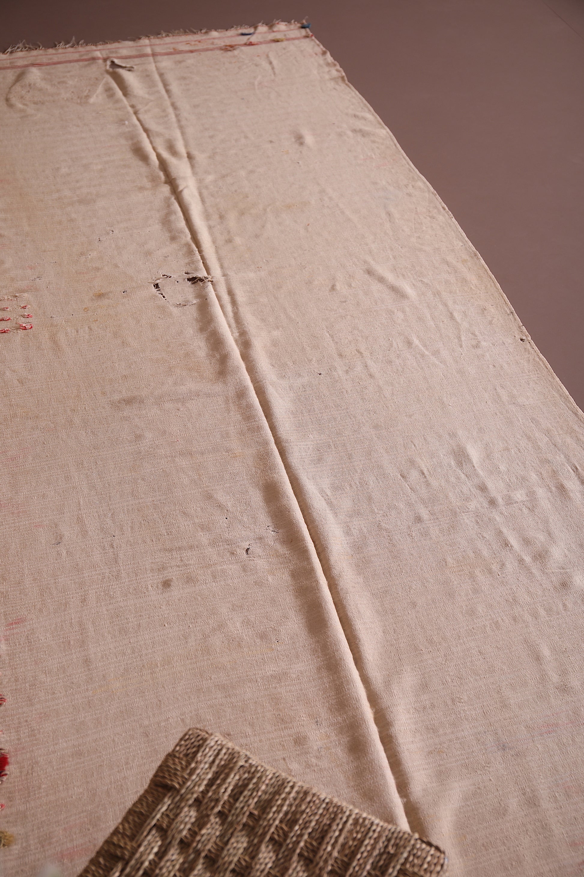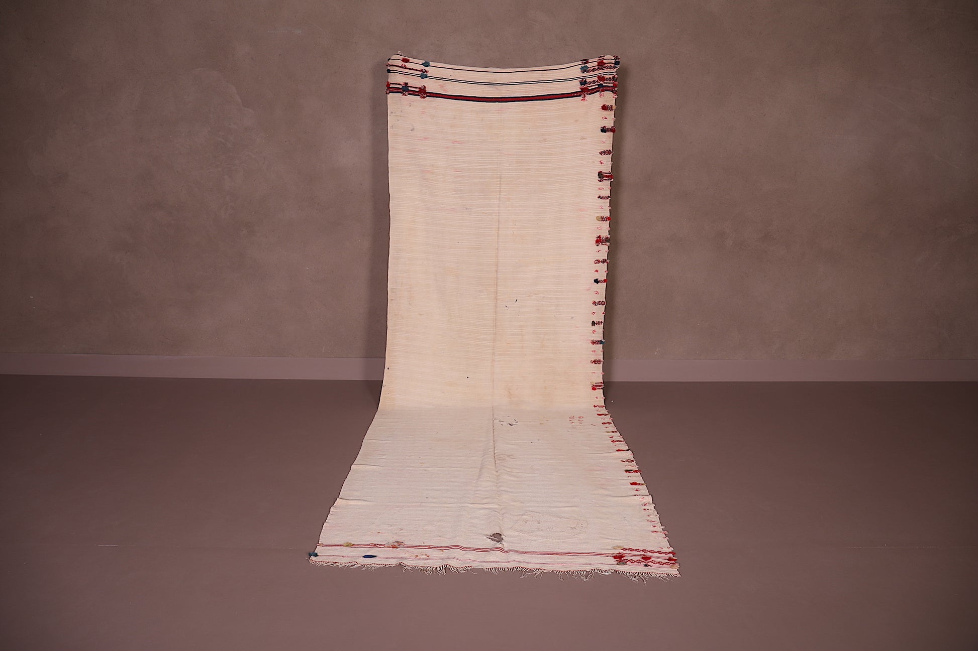 This 3.9 x 11.1 feet Handwoven Kilim Moroccan Runner Rug showcases a soft neutral base with intricate embroidery on the edges and subtle patterns, blending traditional Moroccan craftsmanship with timeless elegance. Handwoven from premium natural fibers, it offers durability, lightweight flexibility, and a refined aesthetic, making it ideal for hallways, entryways, or dining spaces.