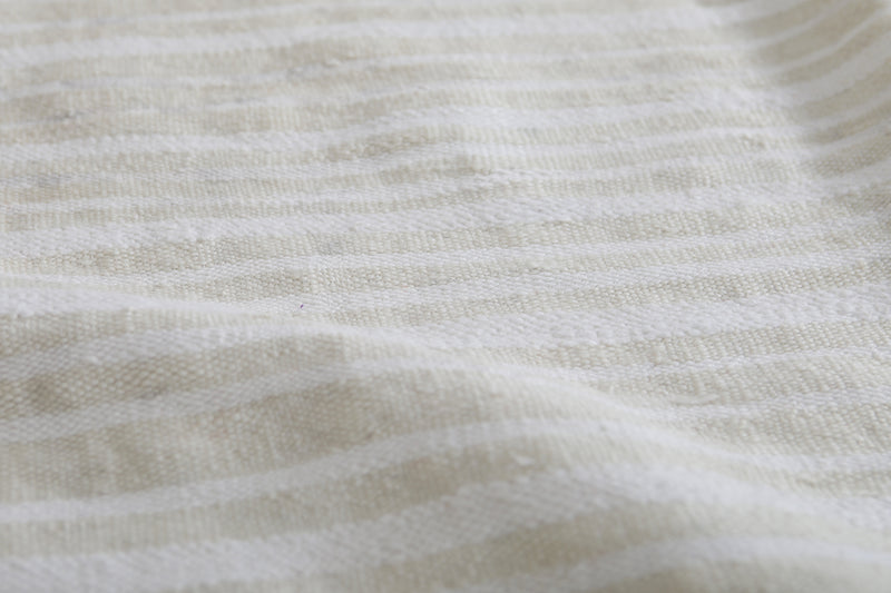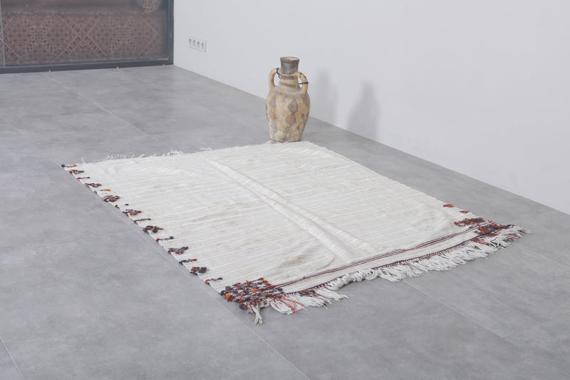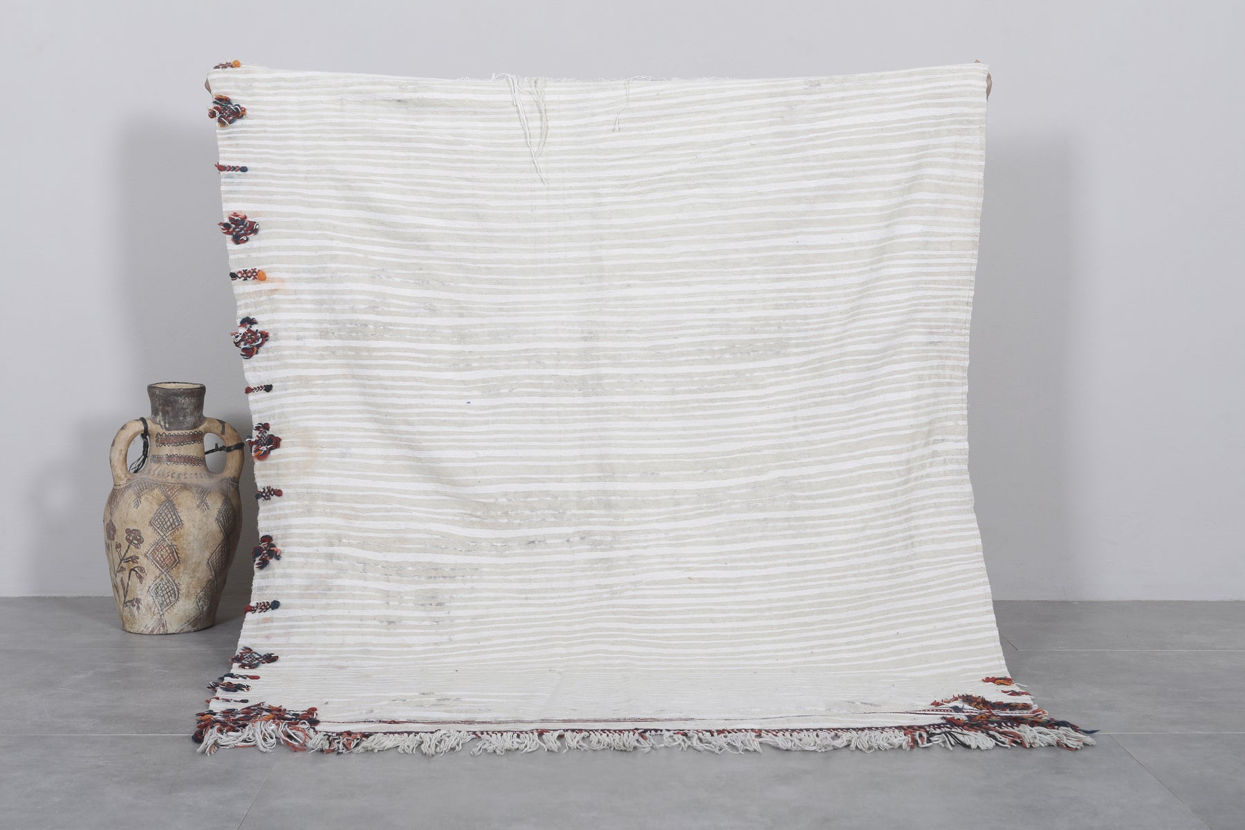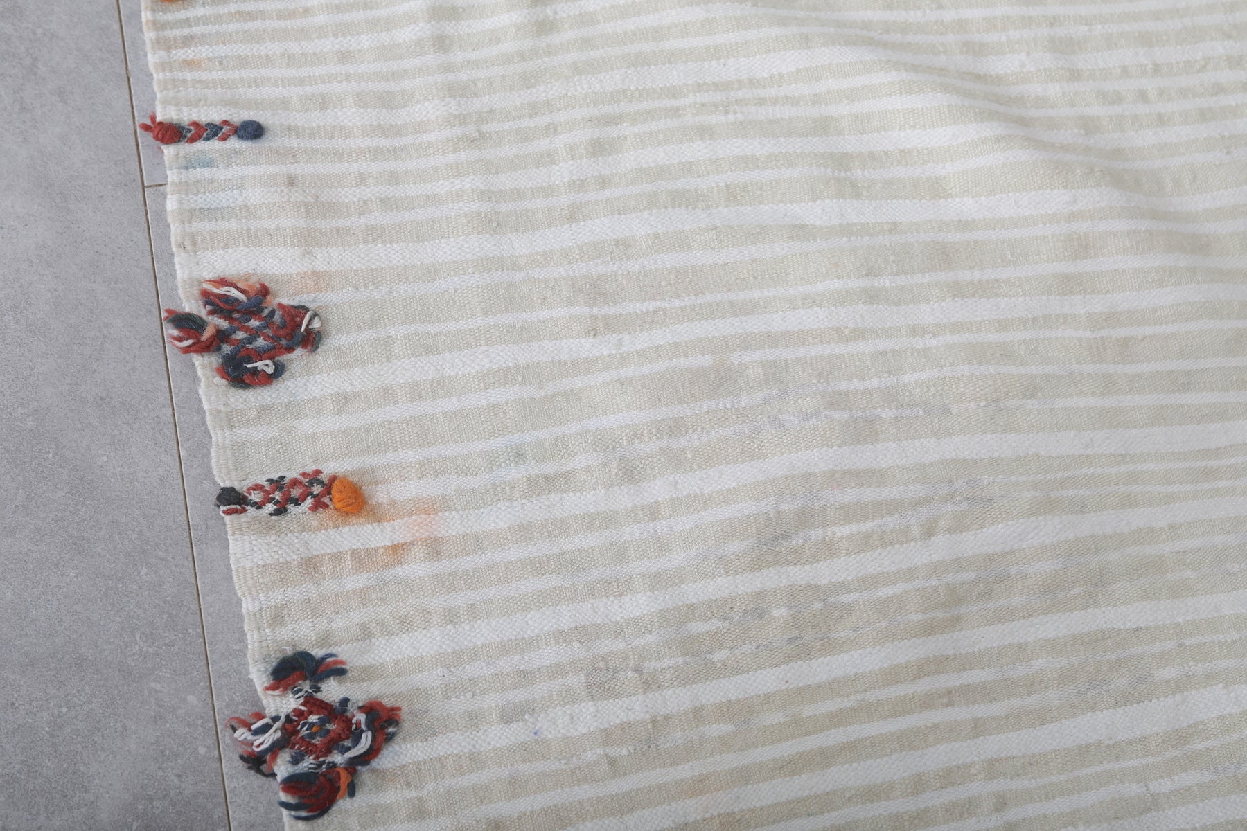This 4.1 x 4.8 feet handwoven Kilim rug showcases a soft ivory base with subtle horizontal stripes and delicate multicolored tassels, offering a blend of tradition and modern charm. Its lightweight yet durable design makes it perfect for living rooms, bedrooms, or cozy reading nooks.