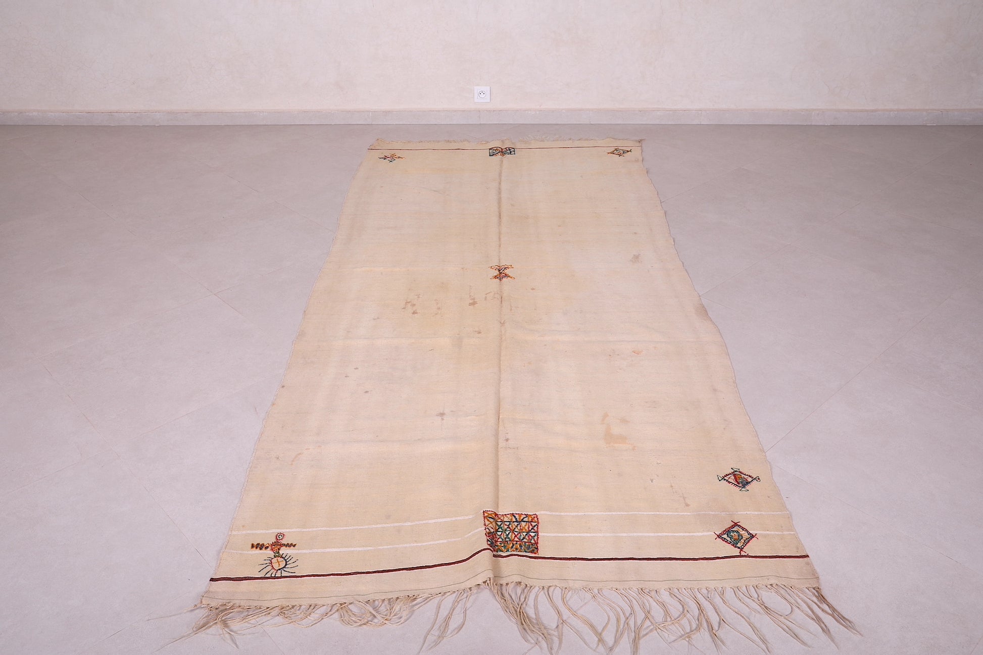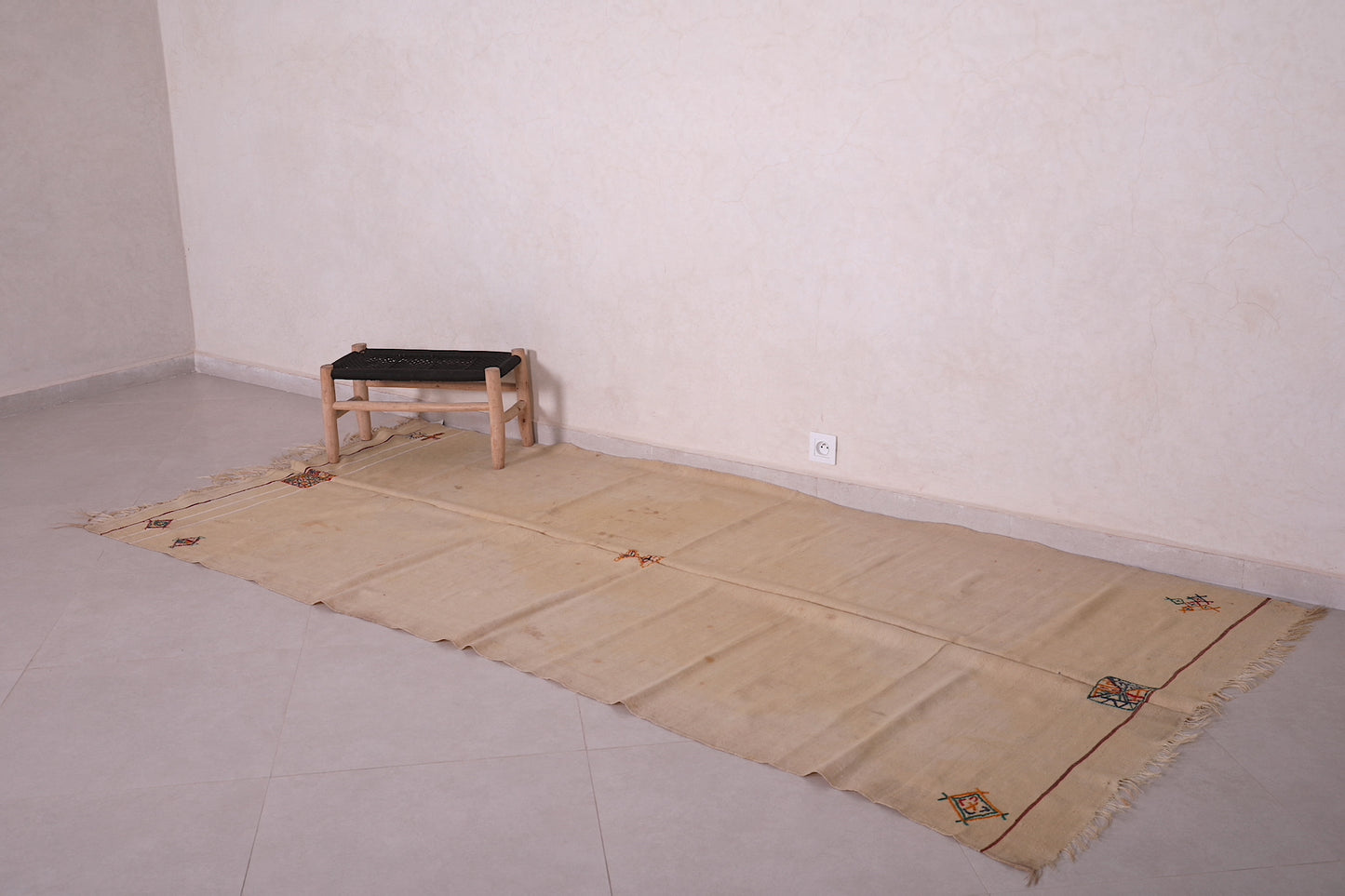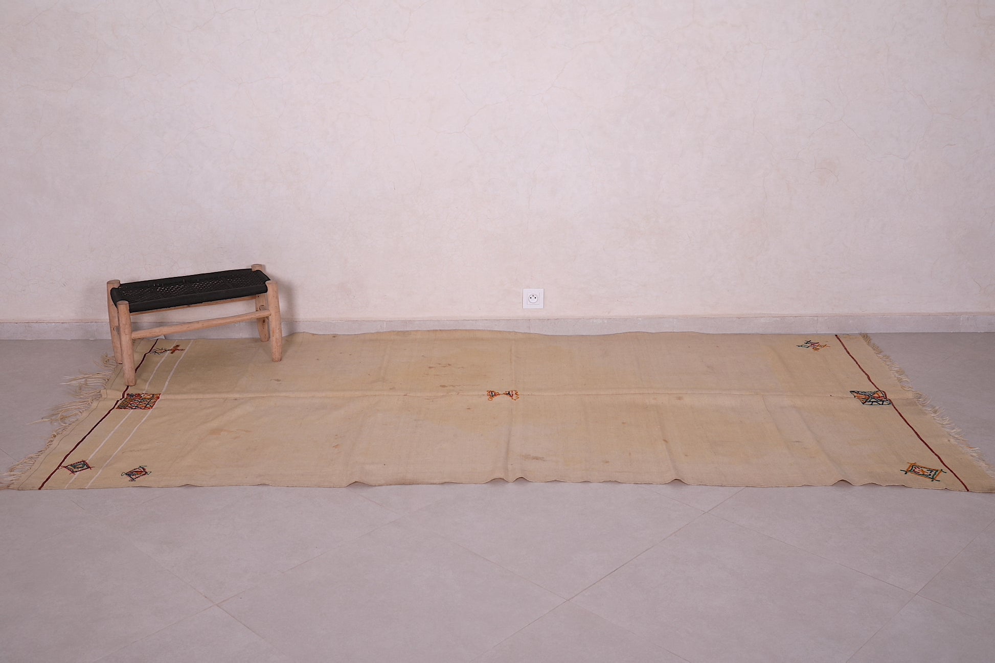 This 4.3 x 9.5 feet Handwoven Kilim Moroccan Artisan Rug showcases a minimalist beige base with delicate Moroccan embroidery, blending authentic Berber patterns with timeless craftsmanship. Handwoven from premium natural fibers, it offers durability, lightweight flexibility, and a refined aesthetic, making it ideal for bedrooms, living rooms, or hallways.