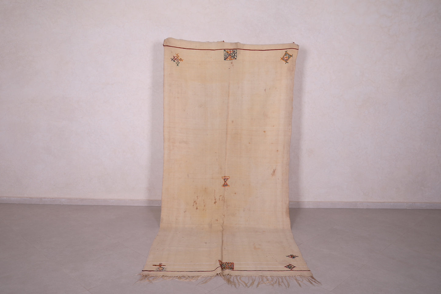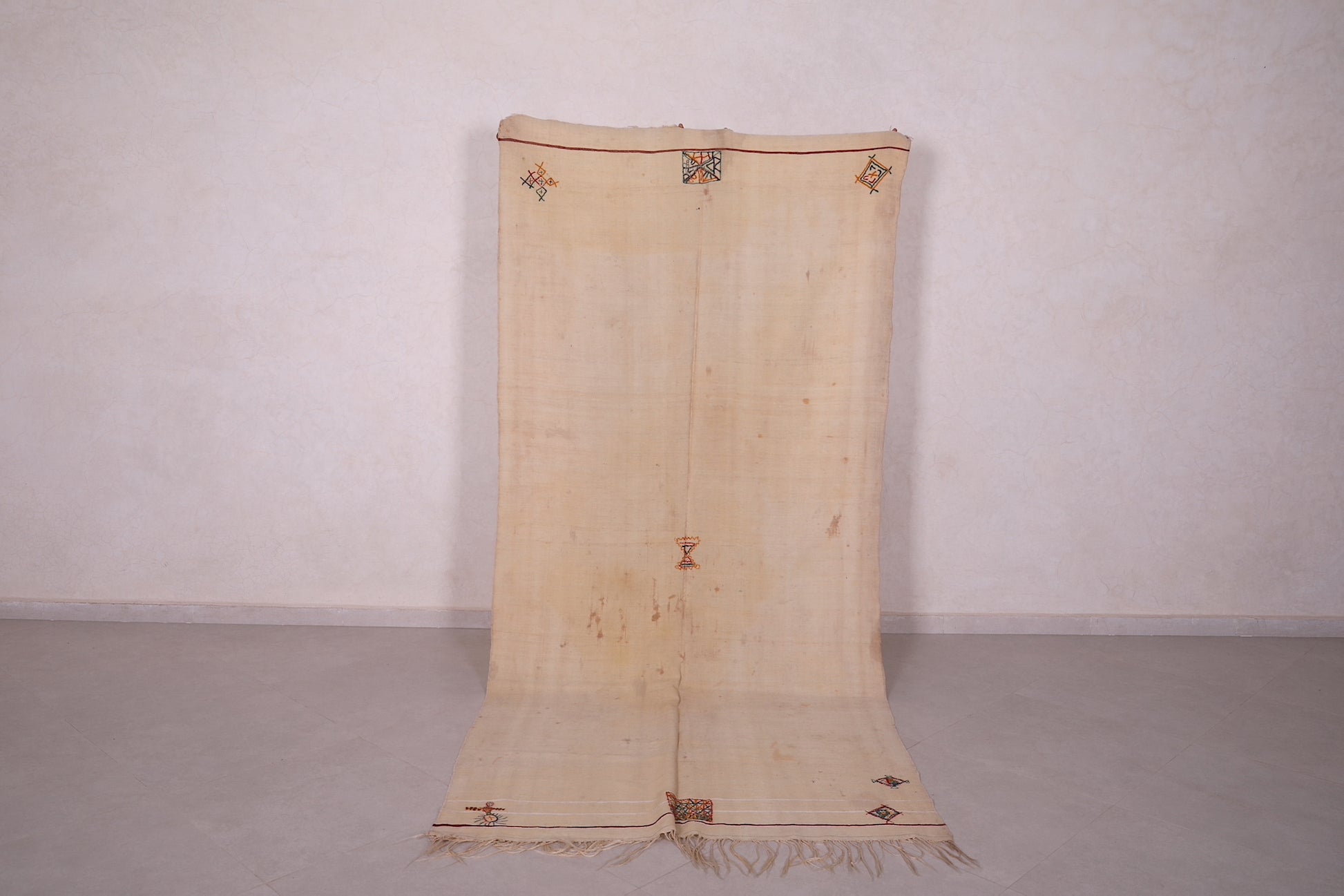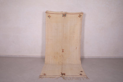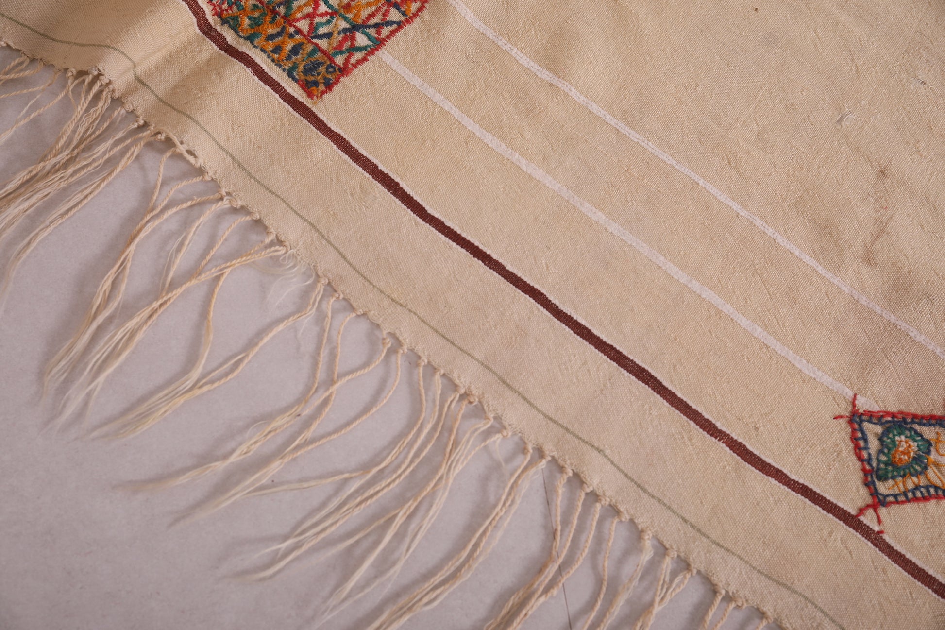 This 4.3 x 9.5 feet Handwoven Kilim Moroccan Artisan Rug showcases a minimalist beige base with delicate Moroccan embroidery, blending authentic Berber patterns with timeless craftsmanship. Handwoven from premium natural fibers, it offers durability, lightweight flexibility, and a refined aesthetic, making it ideal for bedrooms, living rooms, or hallways.