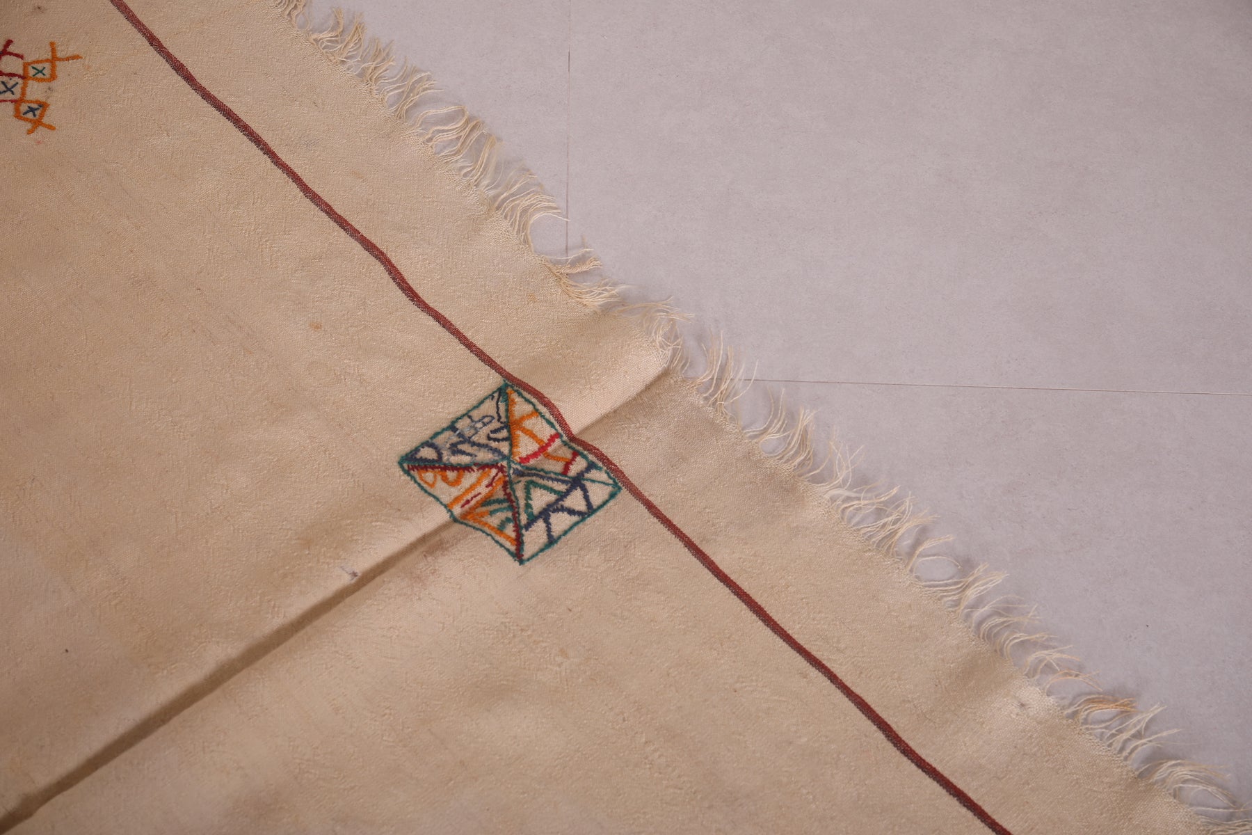 This 4.3 x 9.5 feet Handwoven Kilim Moroccan Artisan Rug showcases a minimalist beige base with delicate Moroccan embroidery, blending authentic Berber patterns with timeless craftsmanship. Handwoven from premium natural fibers, it offers durability, lightweight flexibility, and a refined aesthetic, making it ideal for bedrooms, living rooms, or hallways.