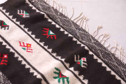 This 4.4 FT x 4.6 FT handwoven Kilim rug celebrates traditional Berber artistry with its bold black and white bands, accented by vibrant red and green tribal motifs. A unique statement piece, this rug blends cultural authenticity with contemporary charm—perfect for cozy interiors or eclectic home offices.