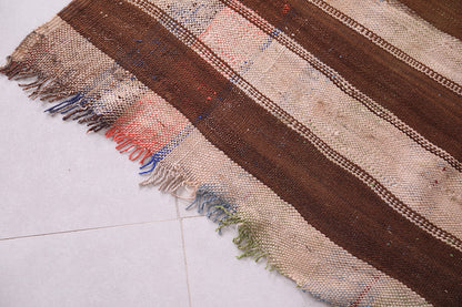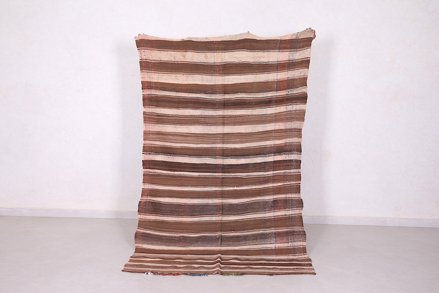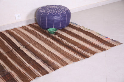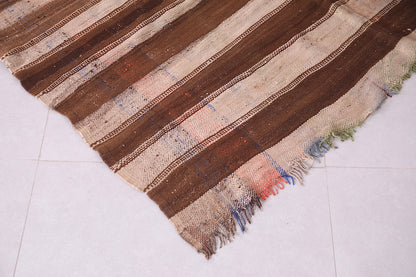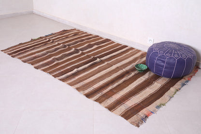 This 4.5 FT x 7.5 FT handwoven Kilim rug features classic brown and beige striping that reflects traditional Moroccan style. Made from durable natural fibers, it offers a perfect balance of rustic charm and modern functionality—ideal for living rooms, bedrooms, or cozy reading corners.