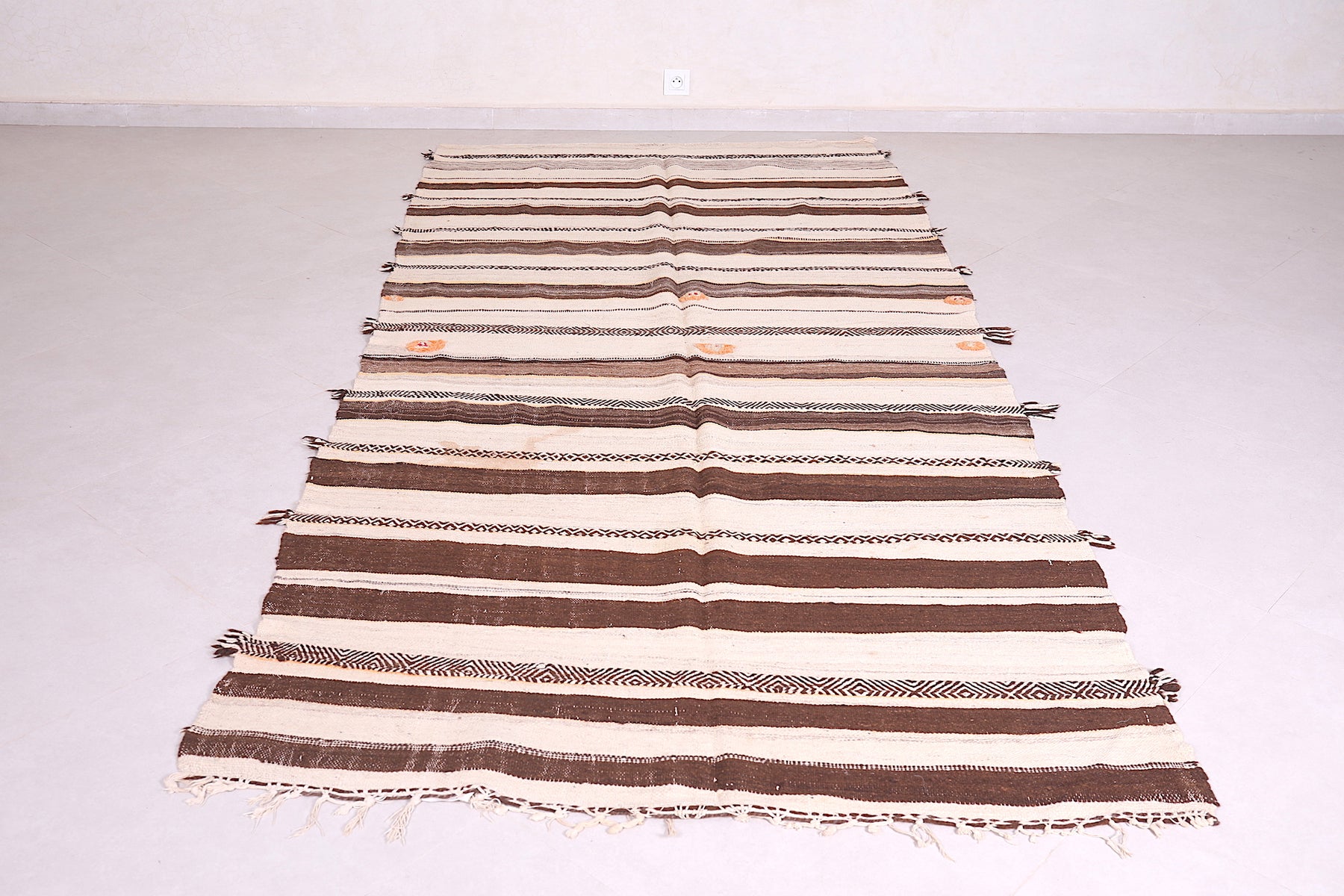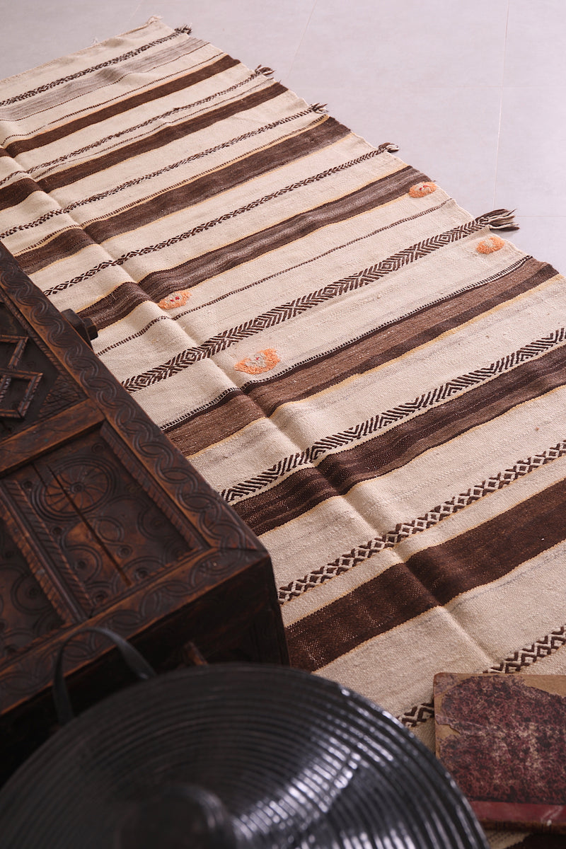 This 4.6 FT x 10 FT handwoven Kilim rug showcases a warm blend of natural beige and brown stripes, enhanced by delicate accents that reflect traditional Moroccan artistry. Its generous size and flatweave construction make it a versatile, lightweight piece ideal for large spaces, hallways, or living areas.