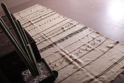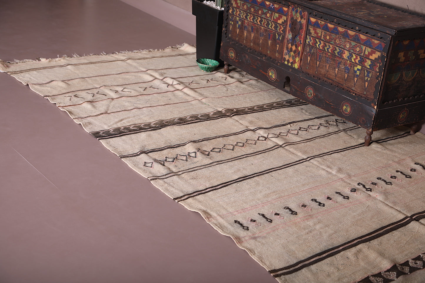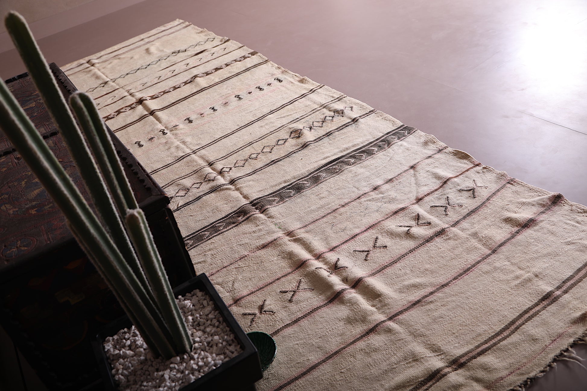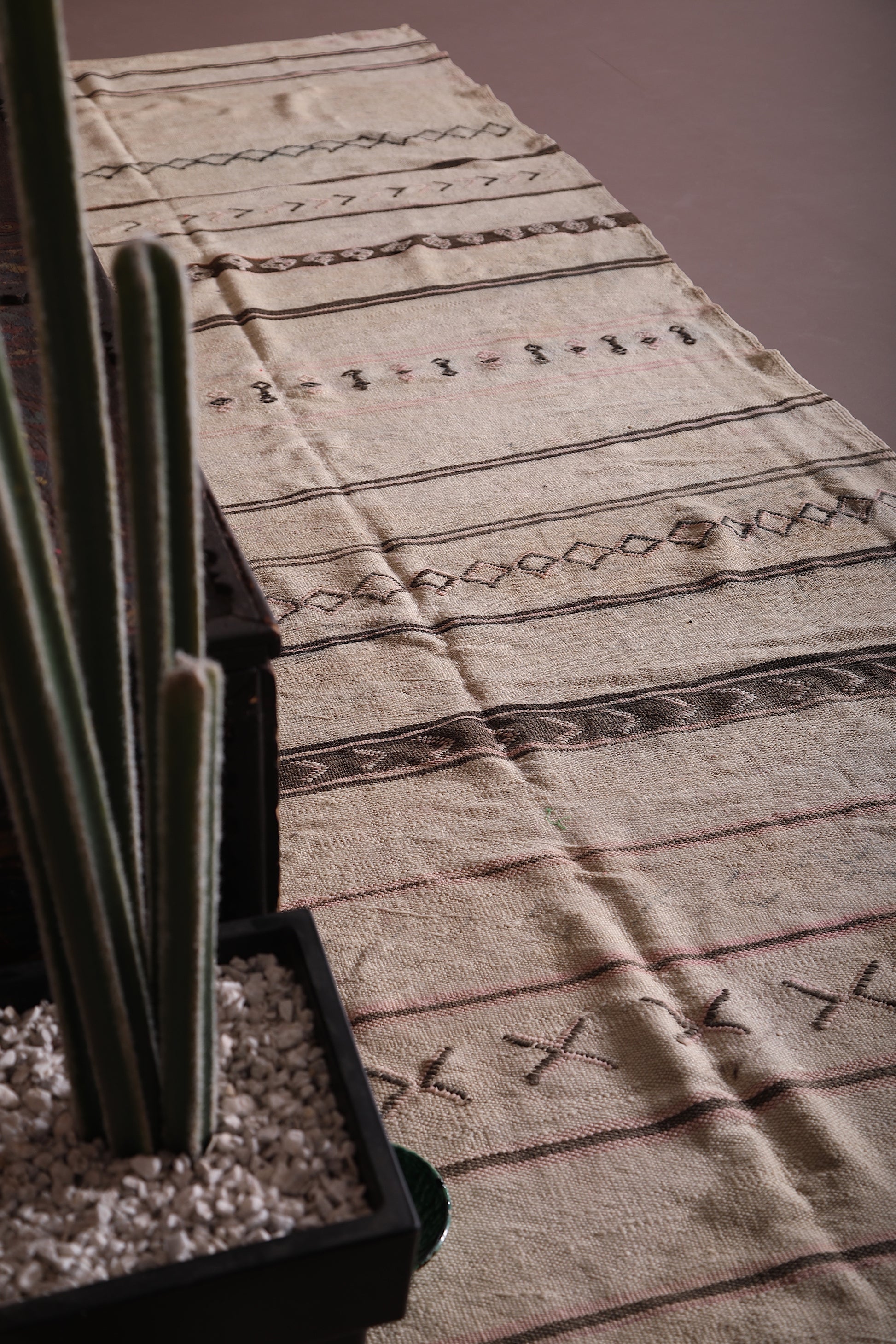 This 5.2 x 12.5 feet Handwoven Moroccan Kilim Rug features a minimalist geometric design on a neutral beige backdrop, creating a sophisticated and timeless appeal. Crafted by skilled Moroccan artisans, this rug is ideal for hallways, large dining areas, or spacious living rooms.
