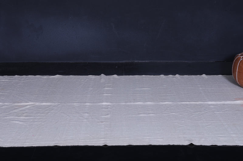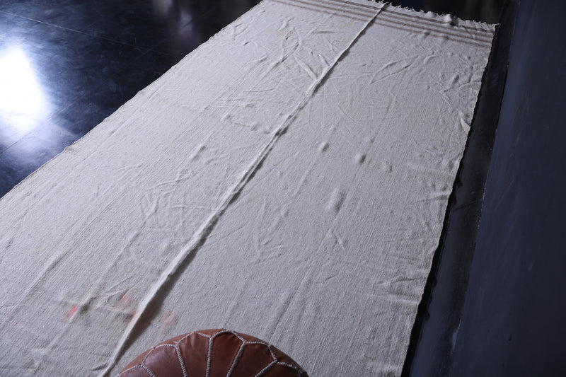 This 5.5 FT x 12.6 FT handwoven Kilim rug exudes refined simplicity with its soft neutral tones and delicate horizontal stripes. Expertly crafted by Moroccan artisans, it blends elegance with everyday functionality—perfect for hallways, bedrooms, or spacious interiors seeking a calming, minimalist touch.