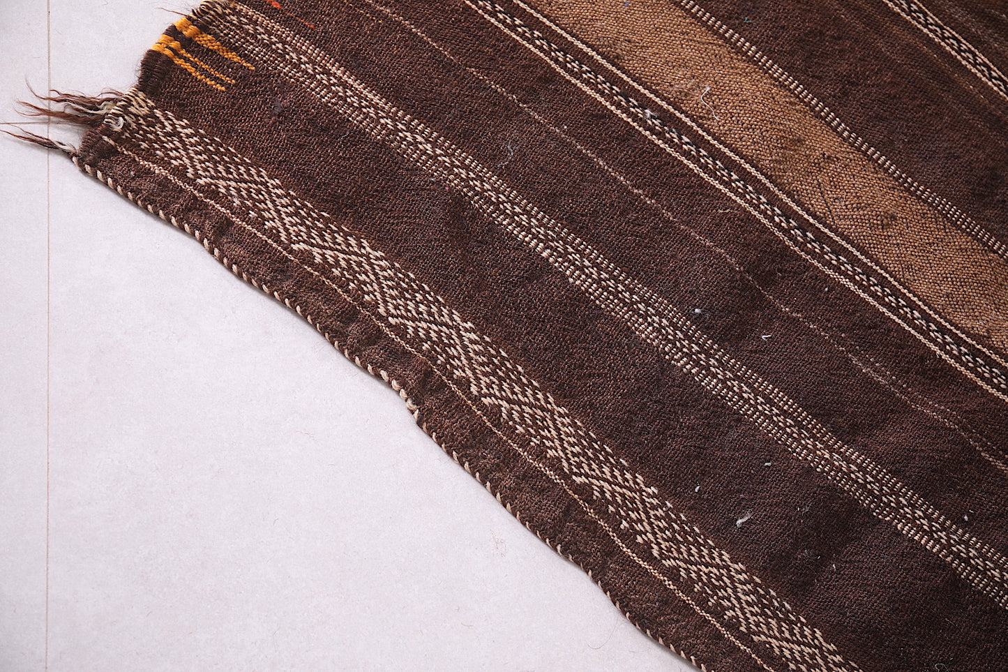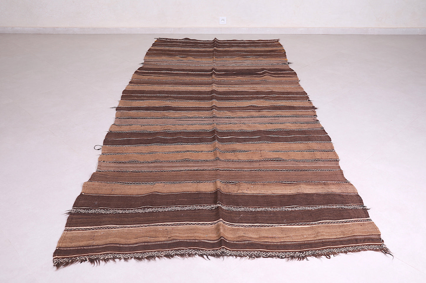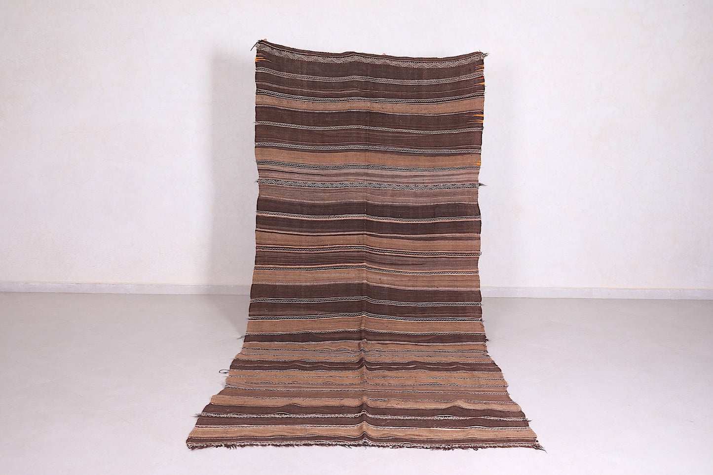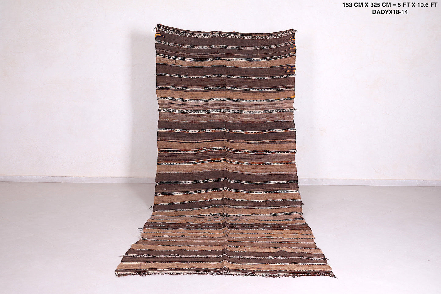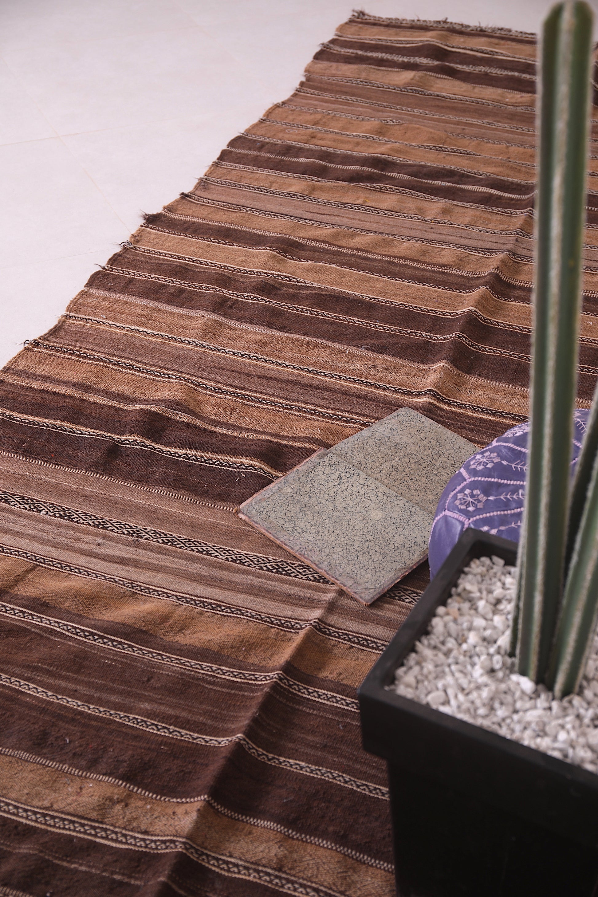 This 5 FT x 10.6 FT handwoven Kilim rug brings a warm, earthy palette to your space with its rich brown tones and traditional striped patterns. Expertly crafted by Moroccan artisans, it combines timeless design with everyday durability—perfect for large rooms, hallways, or layered rustic settings.