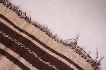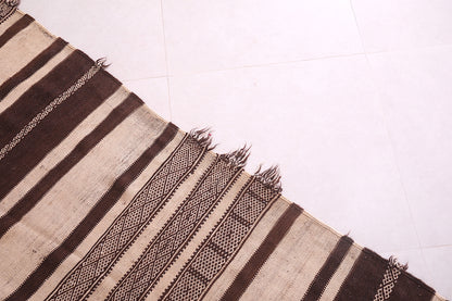 This 4.3 FT x 11.1 FT handwoven Kilim rug makes a bold, earthy statement with its black and cream striped design. Expertly crafted using traditional Moroccan techniques, it offers a rustic yet refined aesthetic perfect for long hallways or narrow spaces.