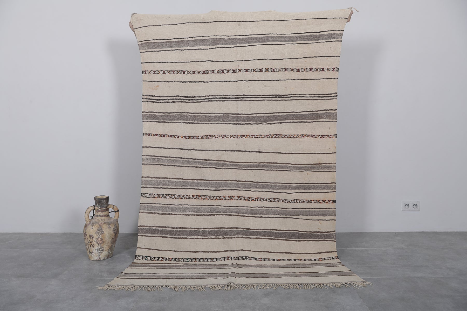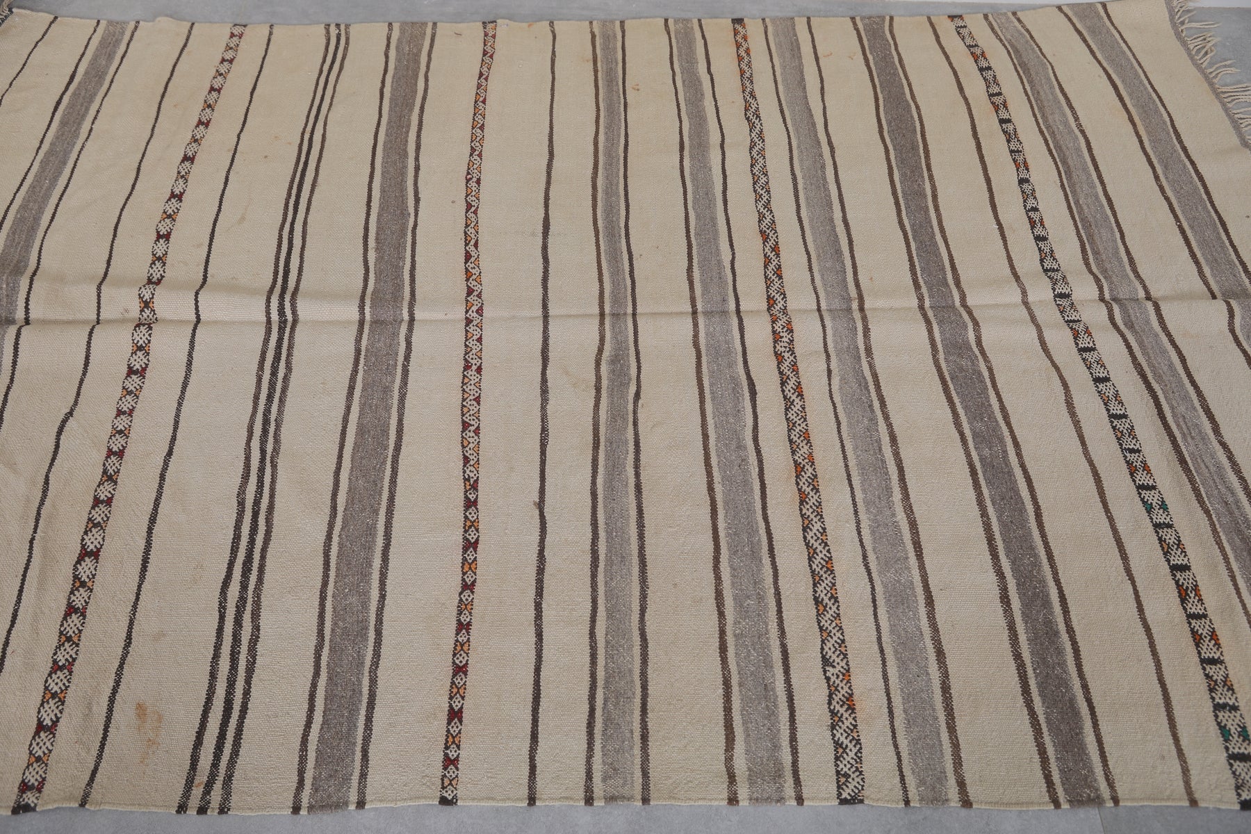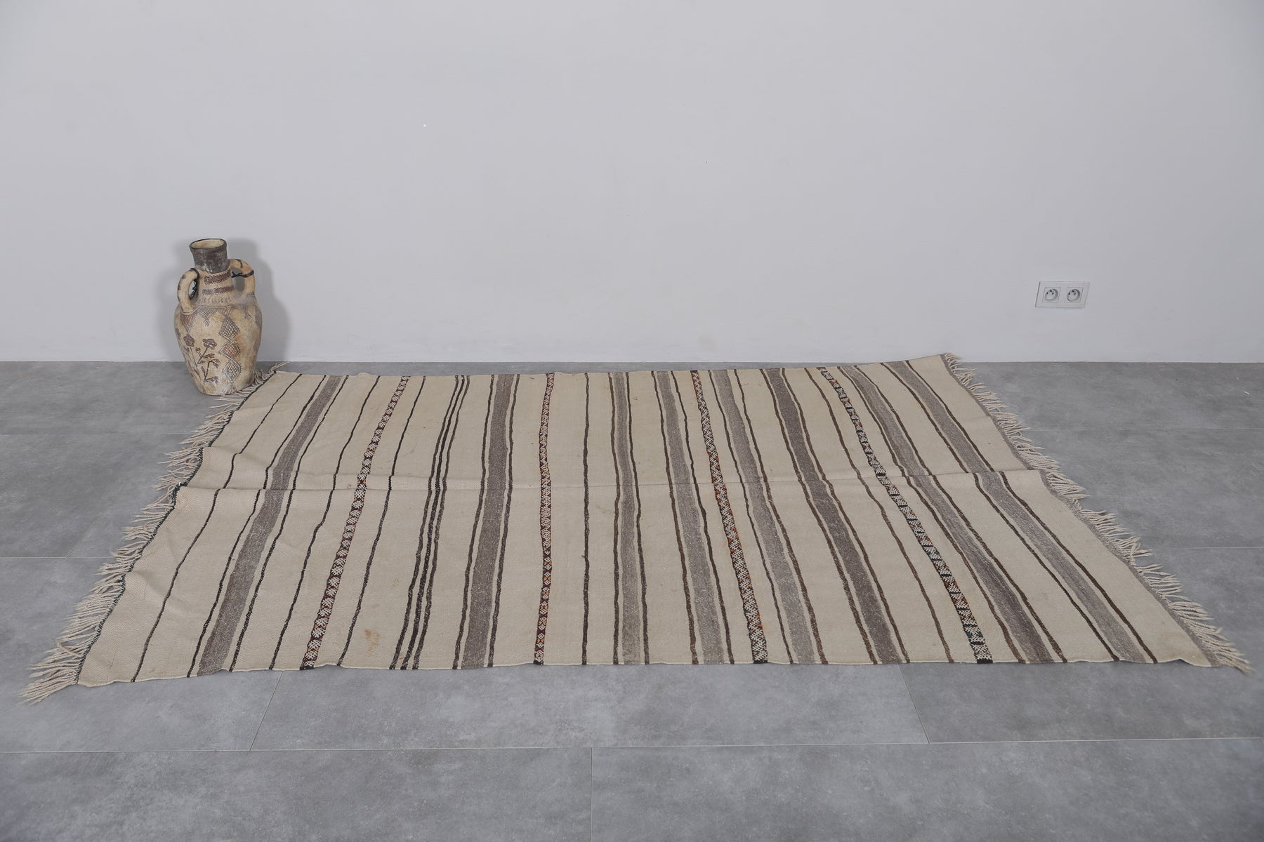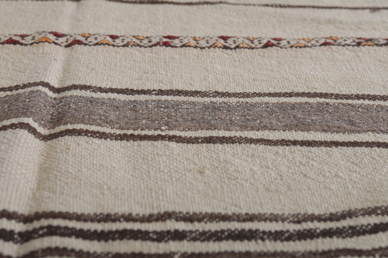 Elevate your home decor with this exquisite handwoven kilim rug, sized at 4.5 FT x 7.1 FT. Crafted by skilled Moroccan artisans, its soft neutral tones and intricate stripe patterns bring an elegant yet understated charm to any space. Made from high-quality natural fibers, this lightweight and durable rug is perfect for living rooms, bedrooms, or cozy nooks. The timeless design complements a variety of interiors, blending traditional craftsmanship with contemporary aesthetics. Transform your living area with this unique piece of Moroccan heritage.