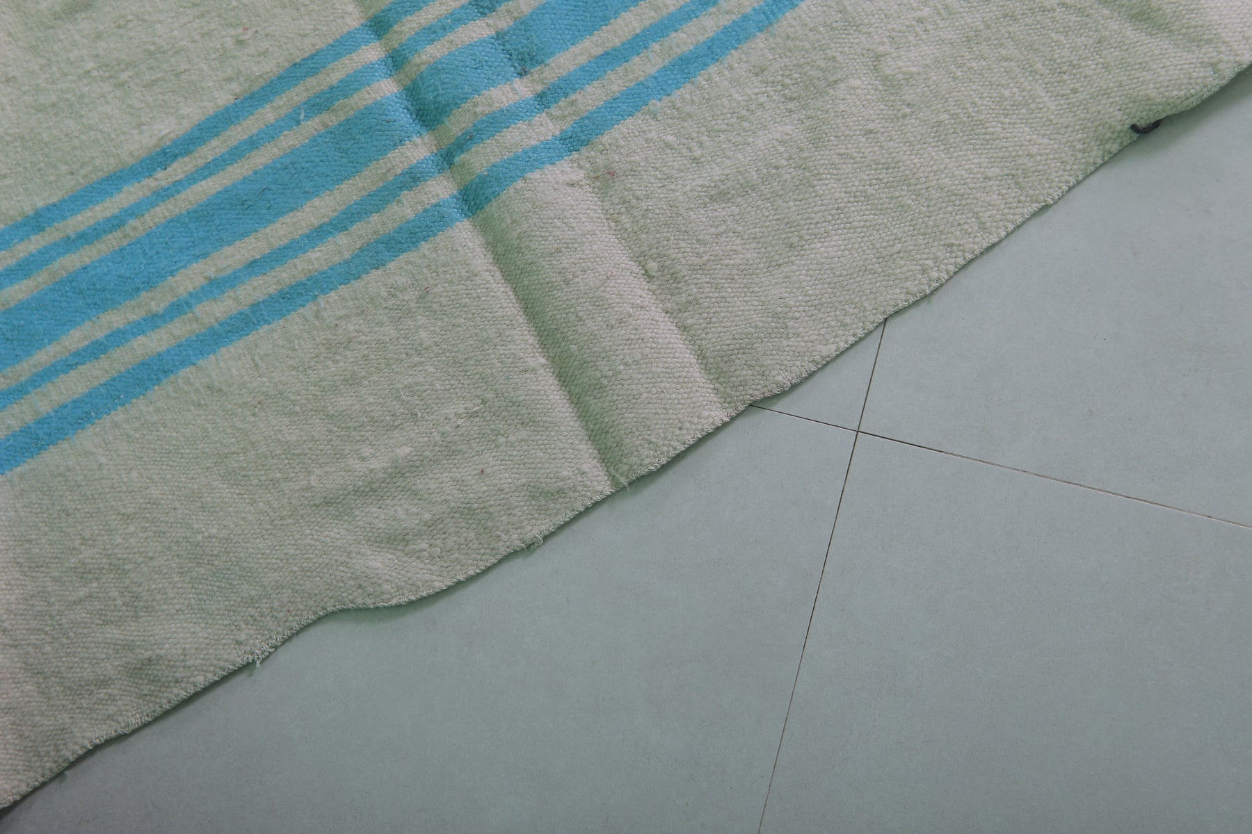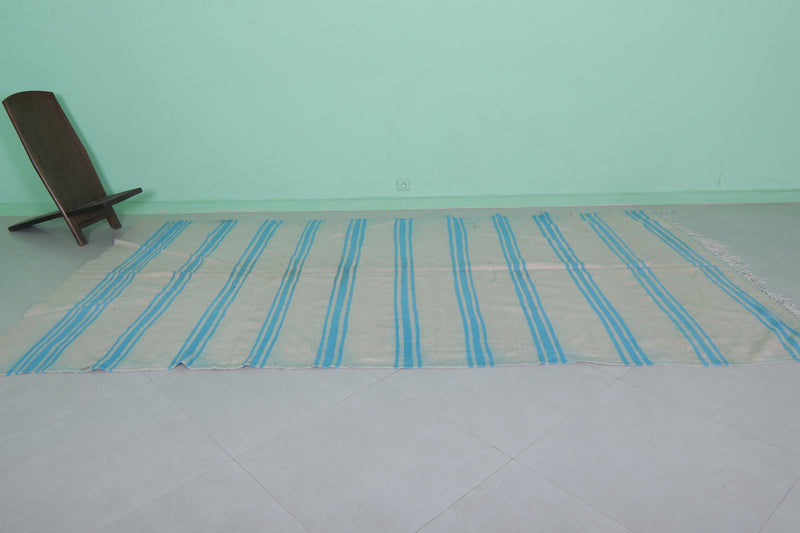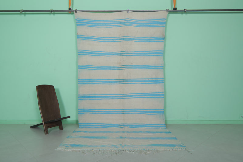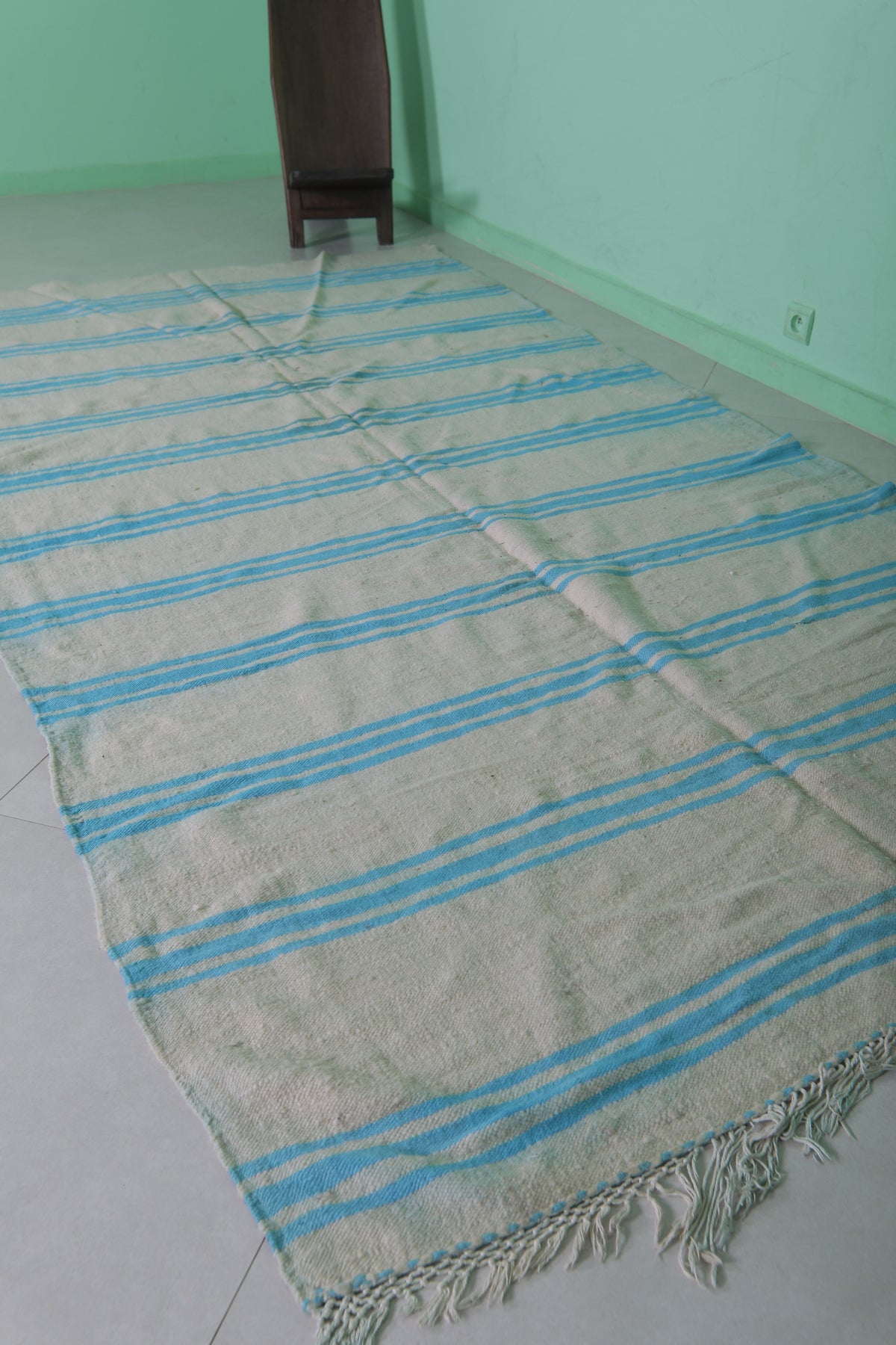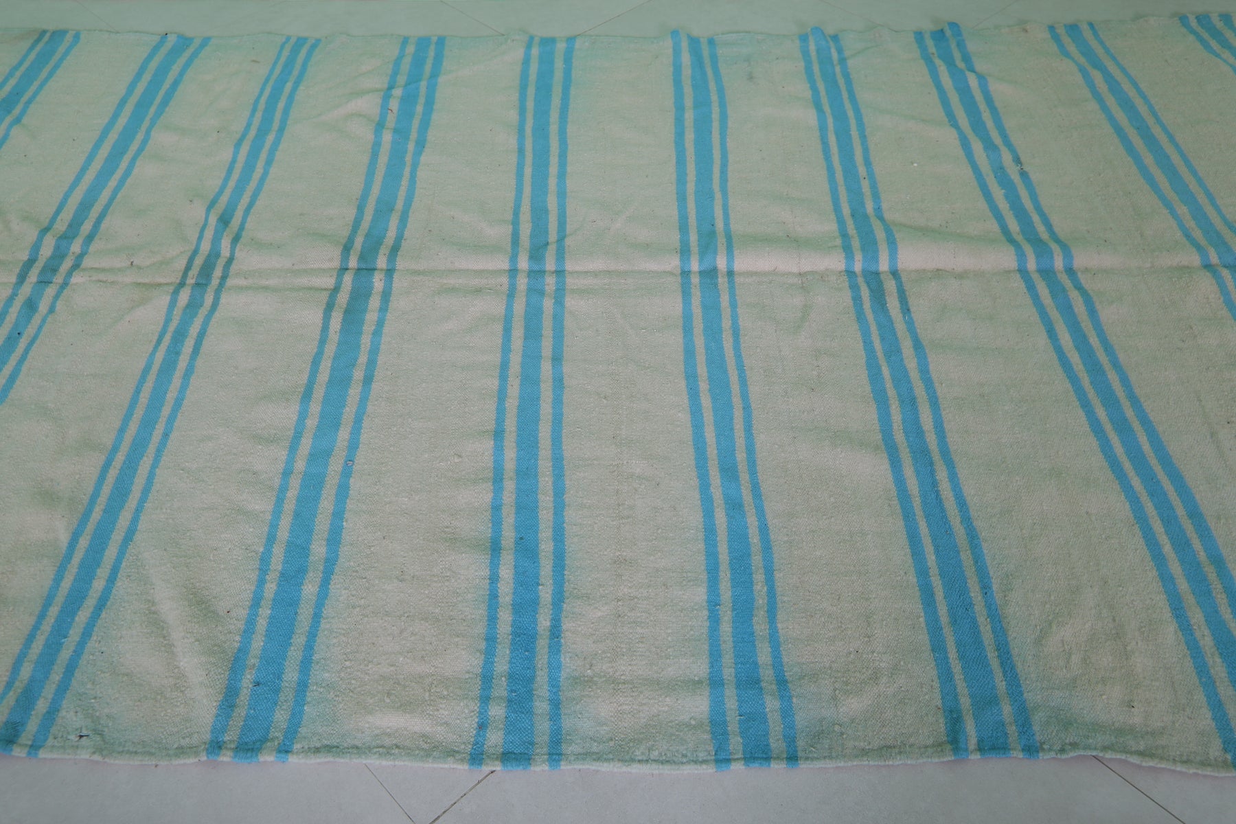 This 5.5 x 10.7 feet handwoven Kilim rug features soft blue stripes on a neutral base, blending timeless craftsmanship with understated elegance. Crafted from high-quality wool, it offers durability, lightweight comfort, and versatility, making it ideal for living rooms, bedrooms, or workspaces.
