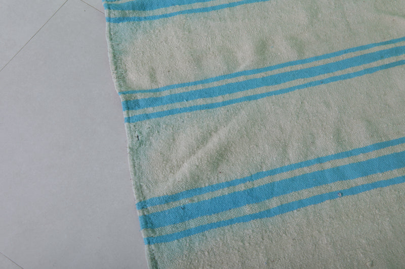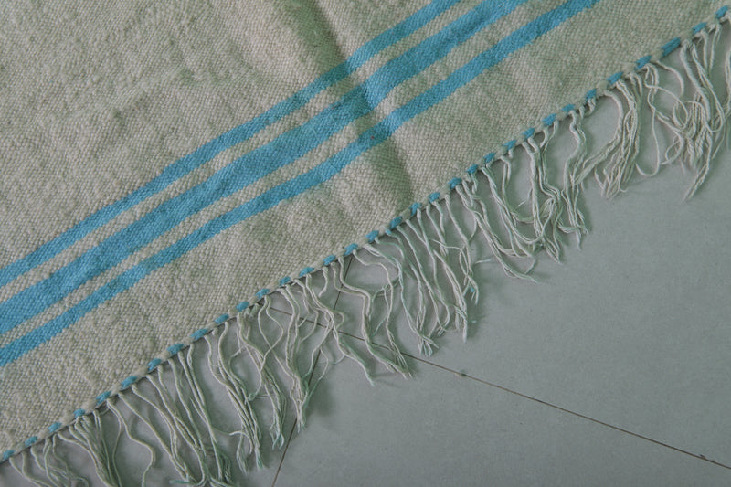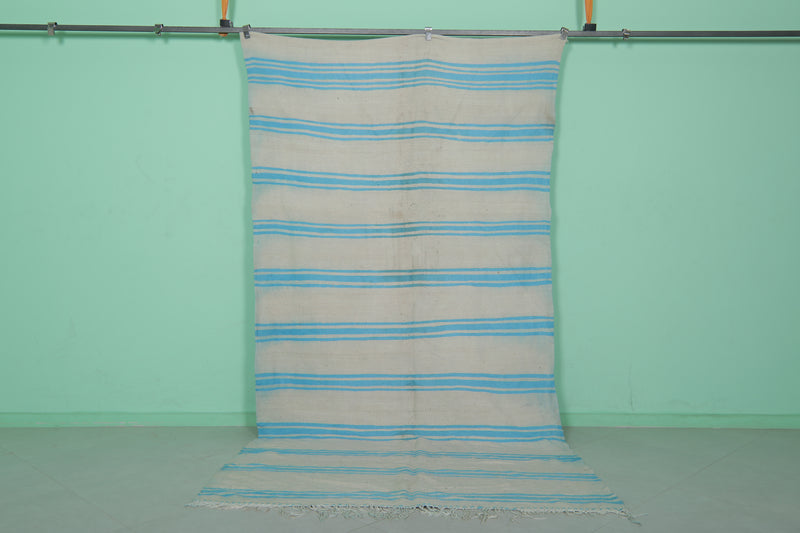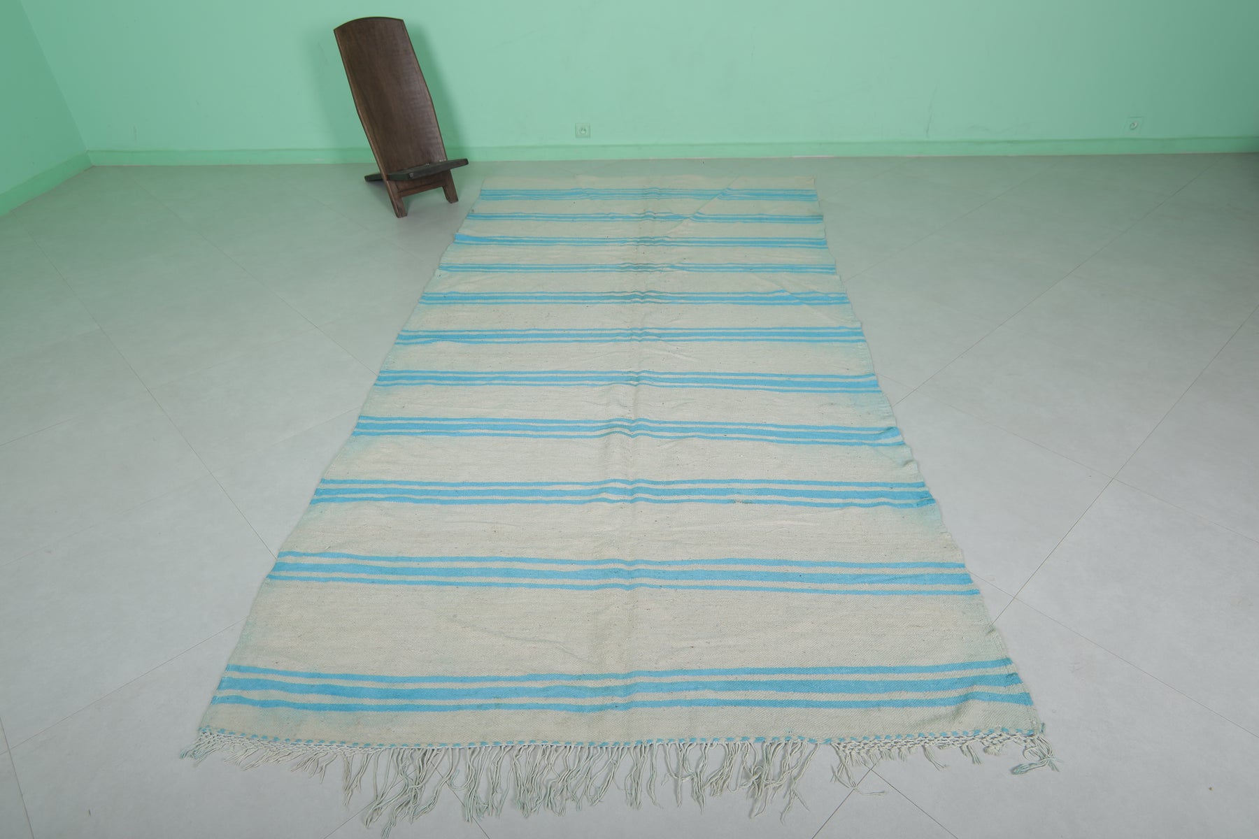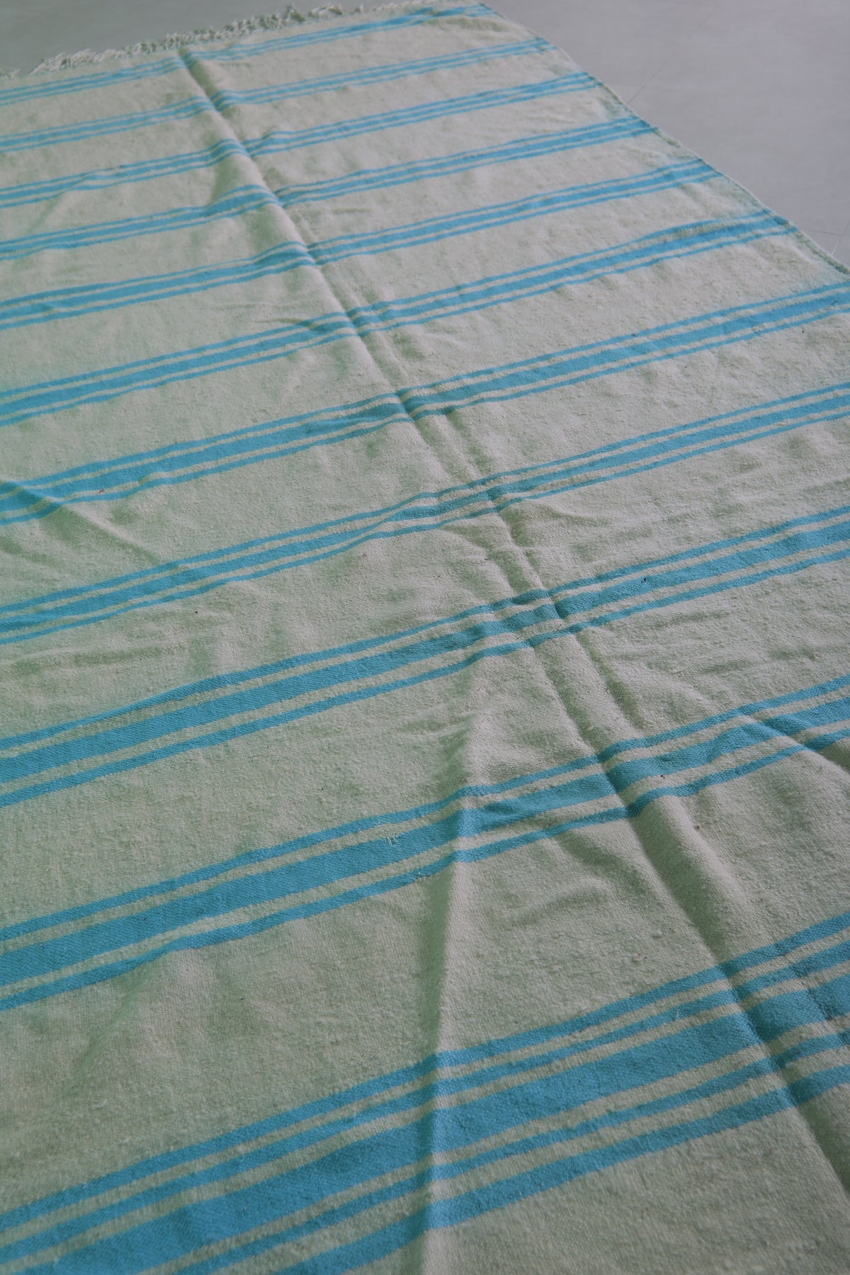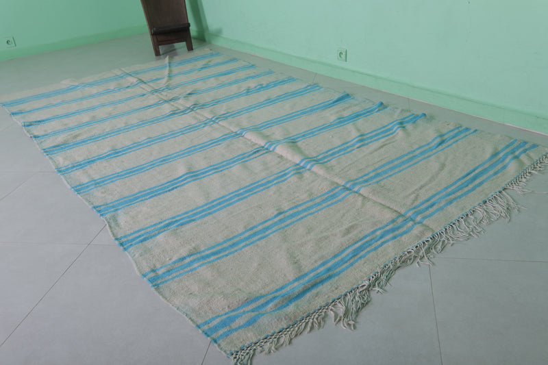 This 5.5 x 10.7 feet handwoven Kilim rug features soft blue stripes on a neutral base, blending timeless craftsmanship with understated elegance. Crafted from high-quality wool, it offers durability, lightweight comfort, and versatility, making it ideal for living rooms, bedrooms, or workspaces.