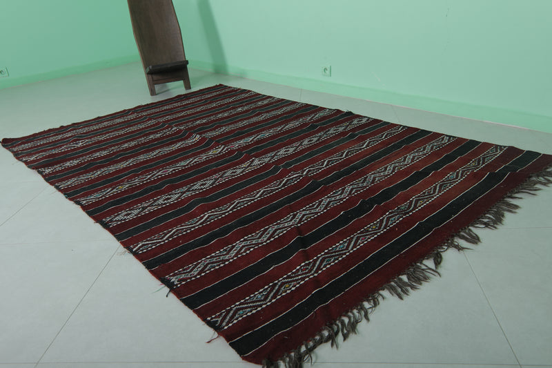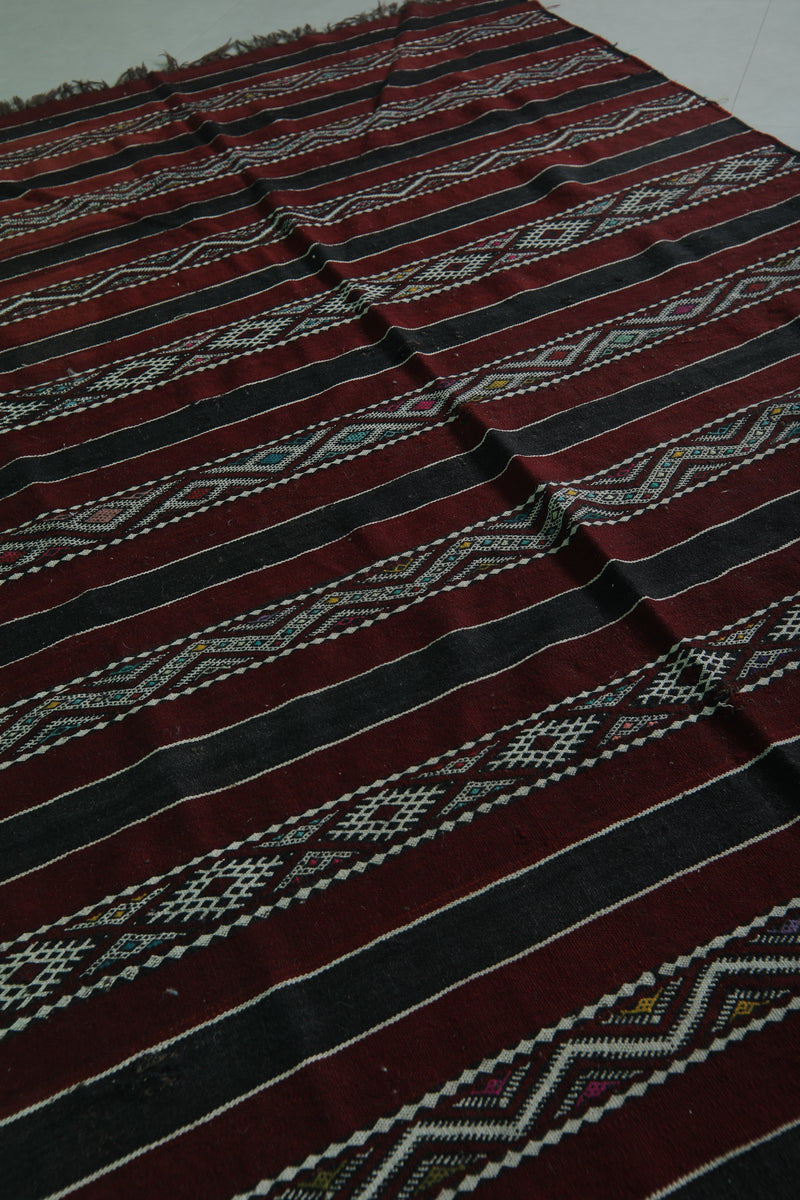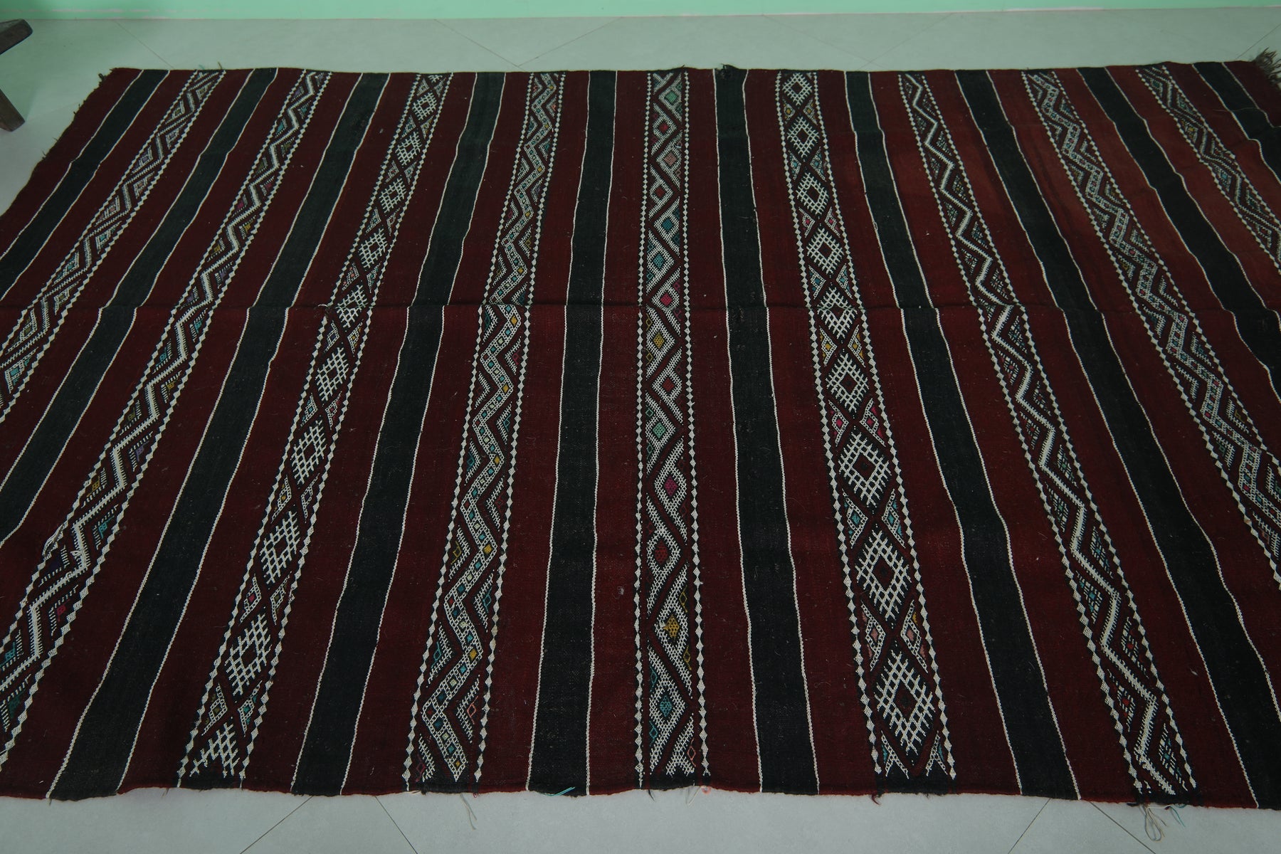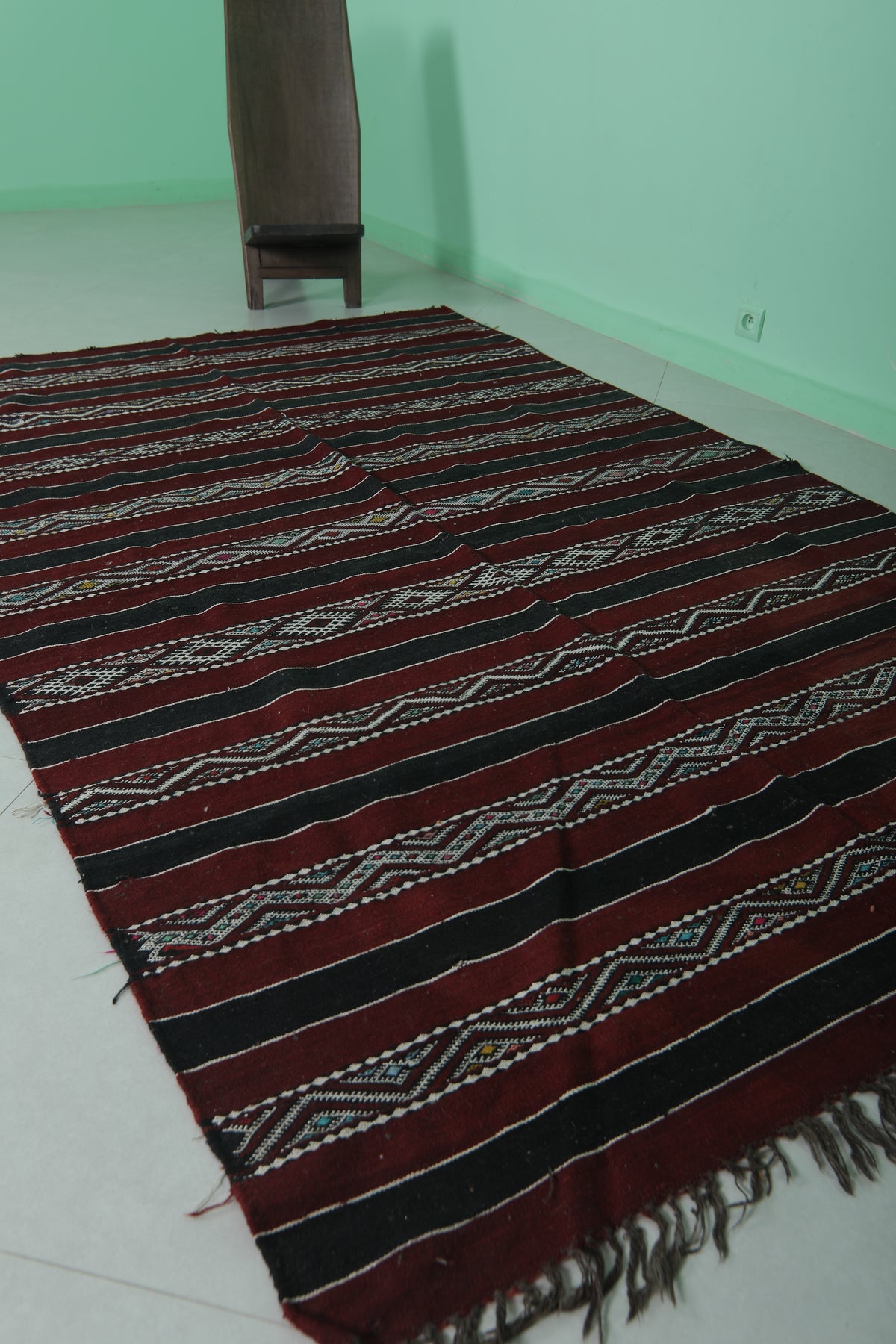 This 5.5 FT x 8.8 FT Handwoven Kilim Rug is a stunning piece of Moroccan Berber artistry. Featuring intricate geometric patterns in deep, rich tones, it offers timeless elegance and cultural flair to any interior setting.