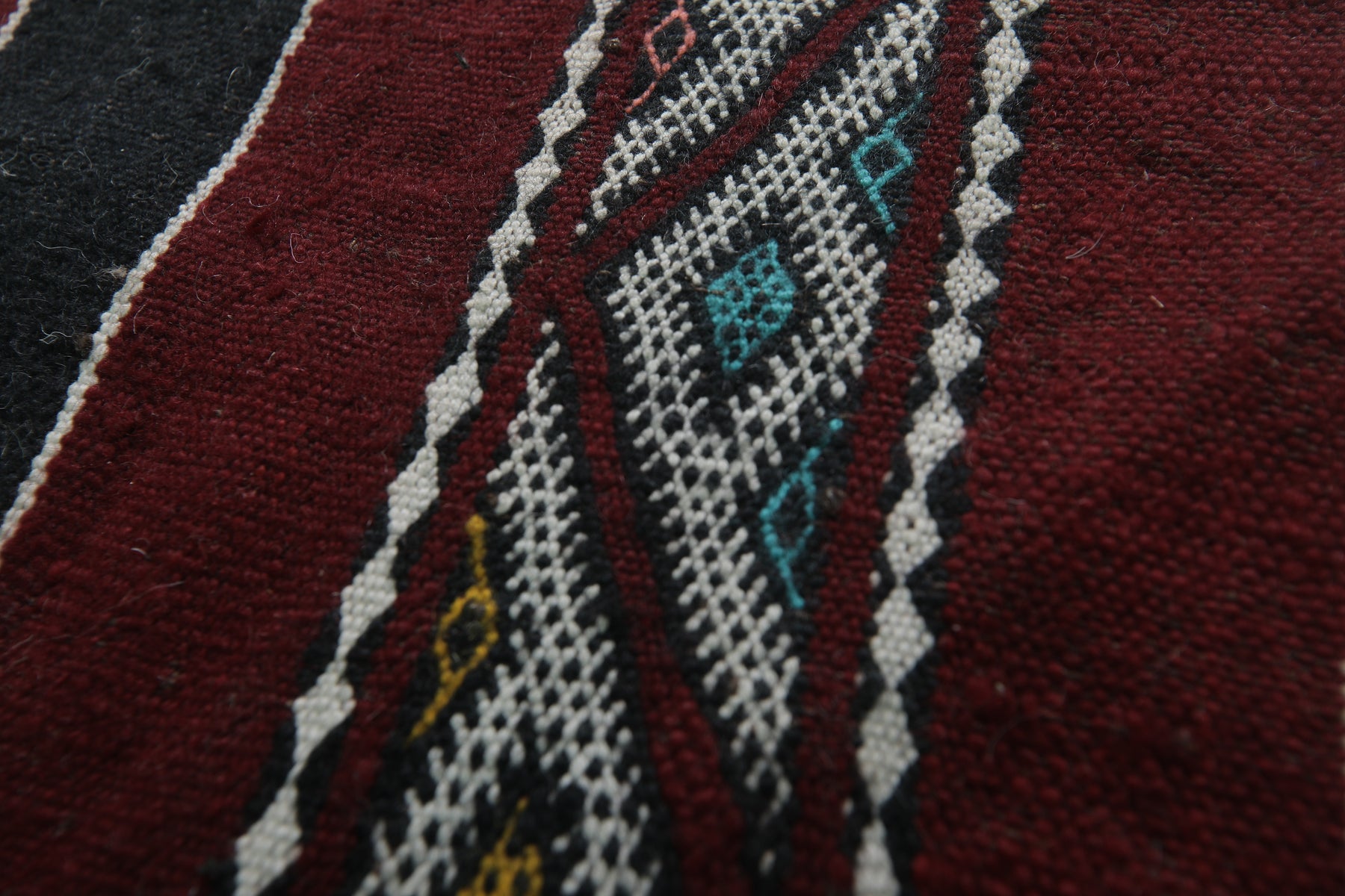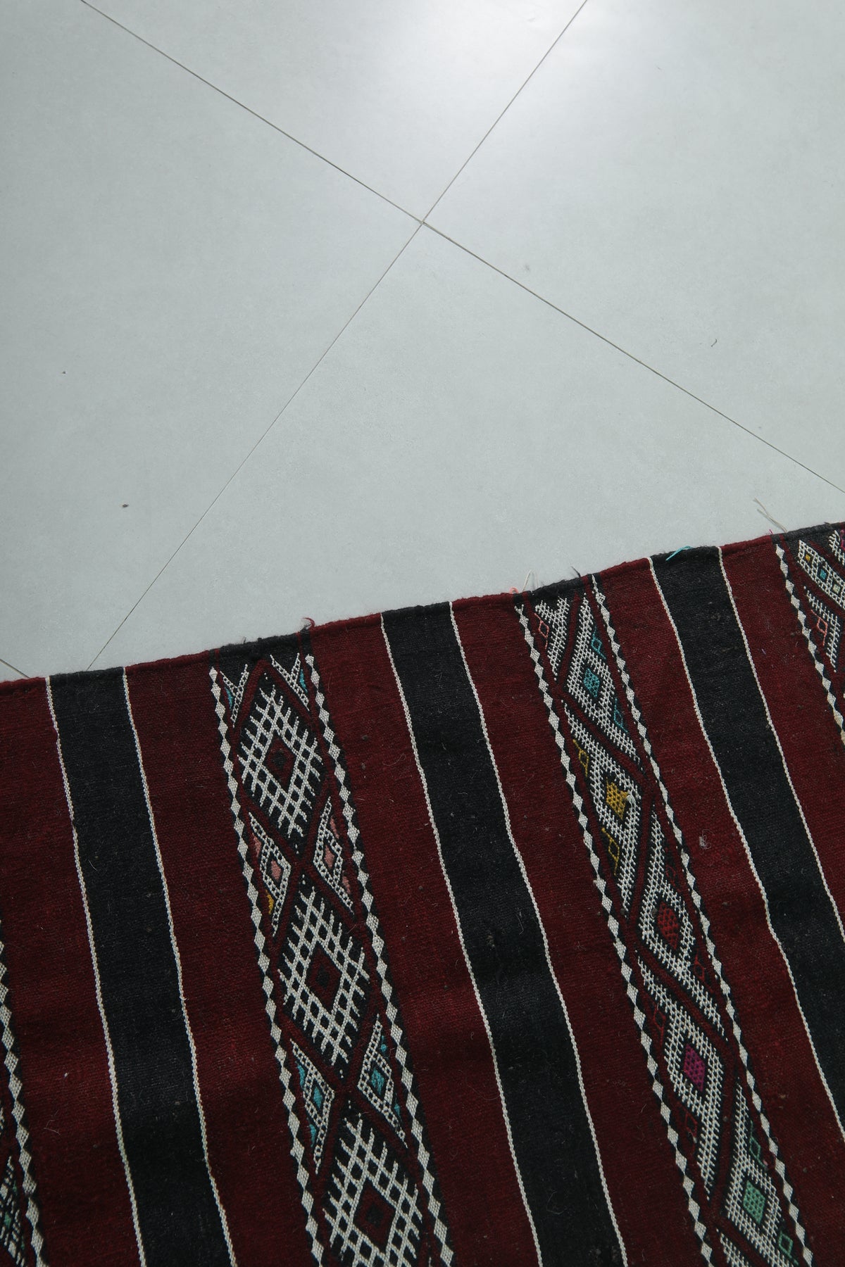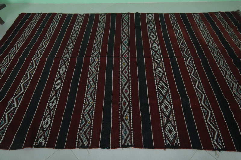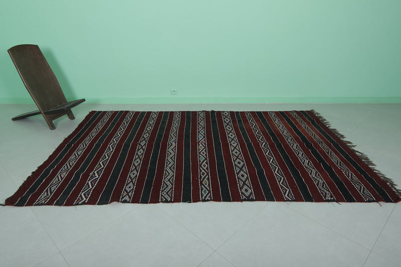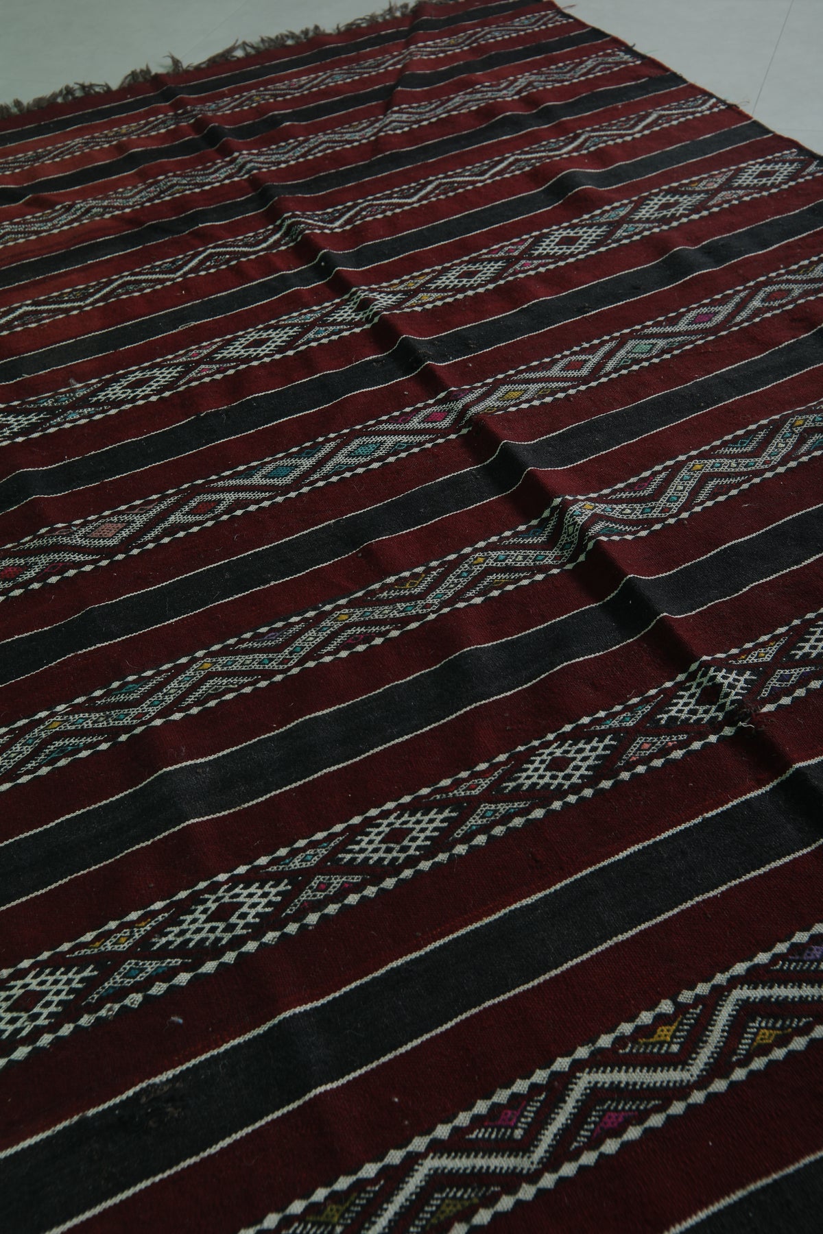 This 5.5 FT x 8.8 FT Handwoven Kilim Rug is a stunning piece of Moroccan Berber artistry. Featuring intricate geometric patterns in deep, rich tones, it offers timeless elegance and cultural flair to any interior setting.