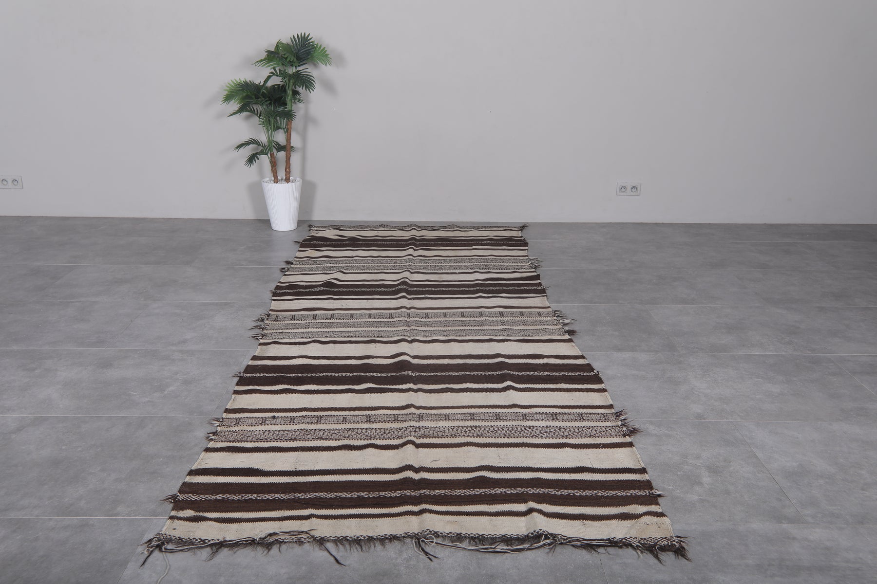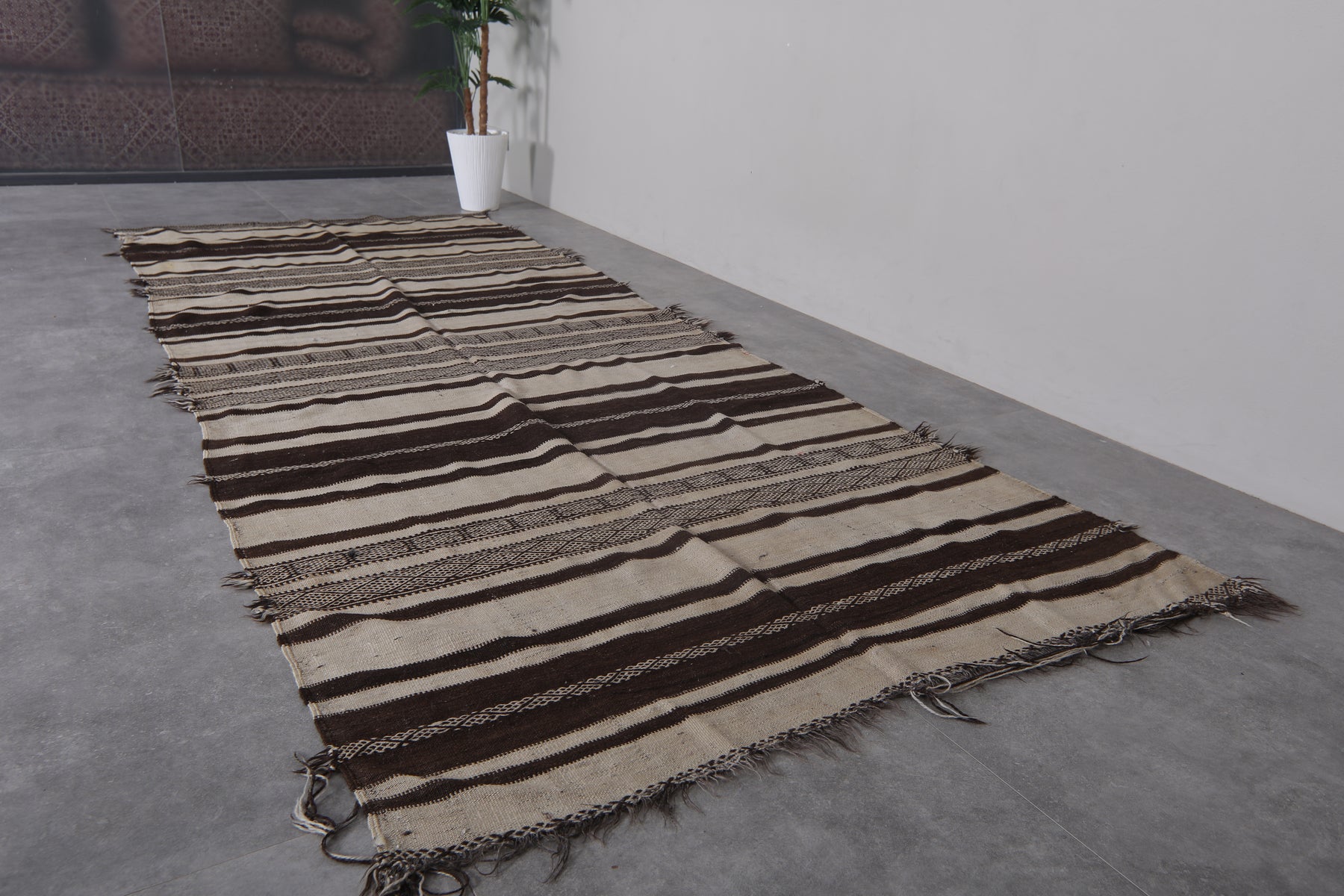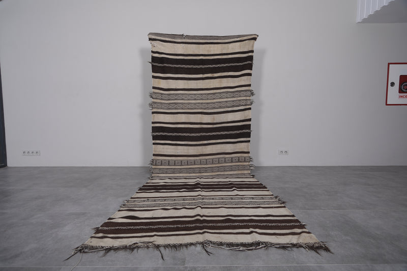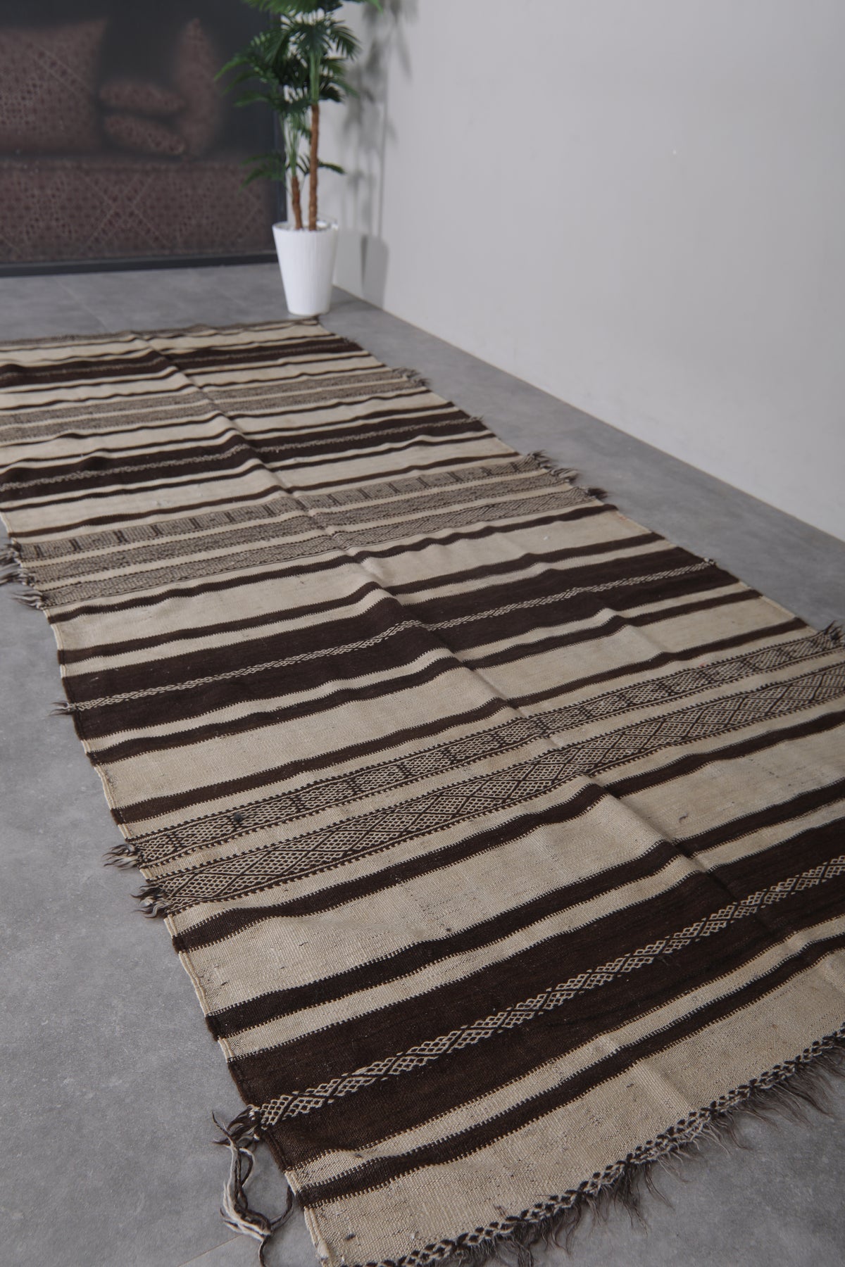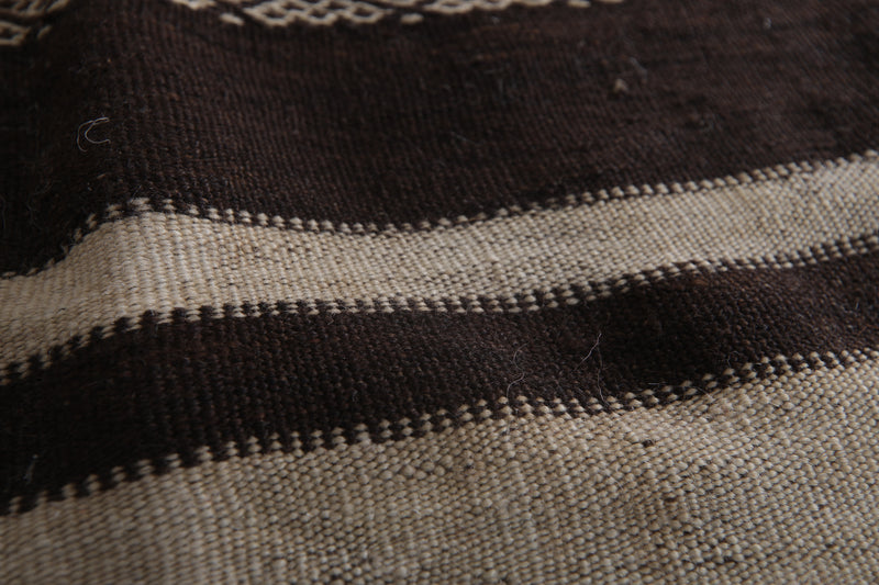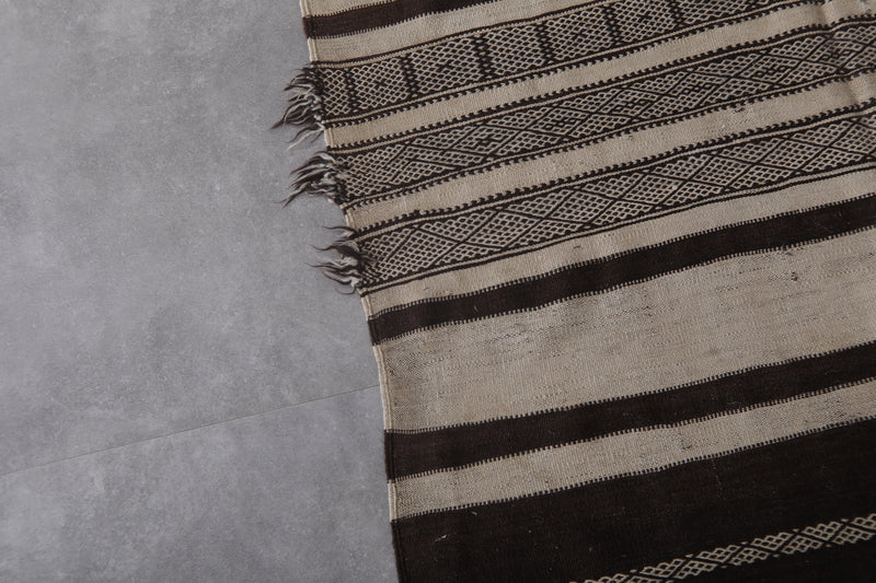 This 4.3 FT x 11.1 FT handwoven Kilim rug makes a bold, earthy statement with its black and cream striped design. Expertly crafted using traditional Moroccan techniques, it offers a rustic yet refined aesthetic perfect for long hallways or narrow spaces.