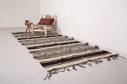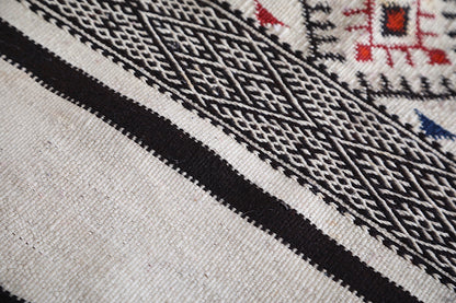 This 4.7 FT x 11.1 FT Handwoven Large Kilim Rug showcases traditional Moroccan design in a bold black and white palette. Its generous size and striking patterns bring artisanal beauty and balance to expansive interiors.