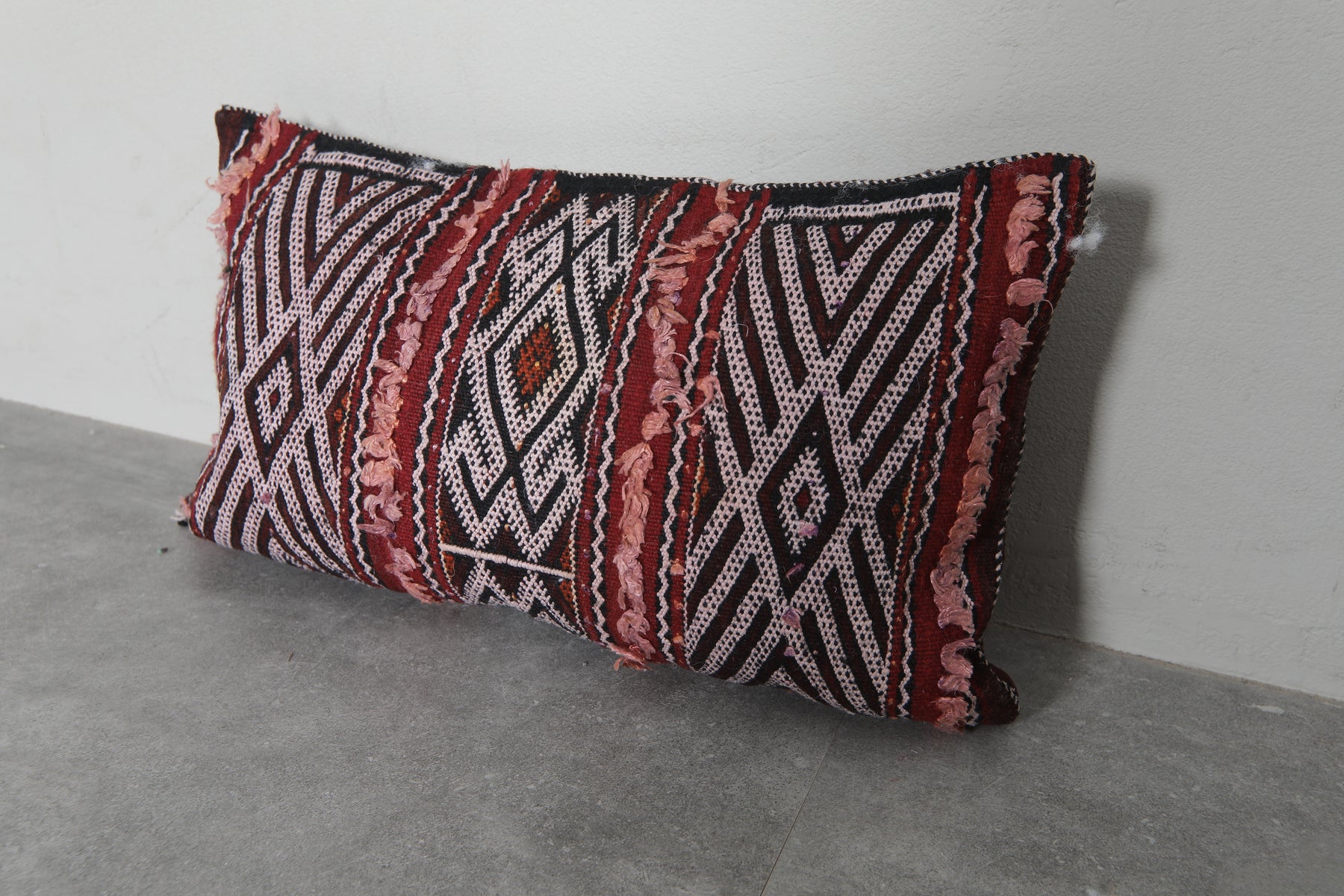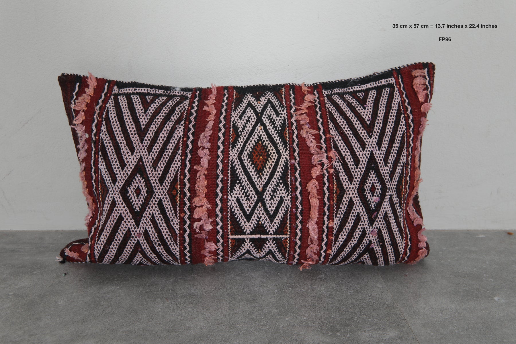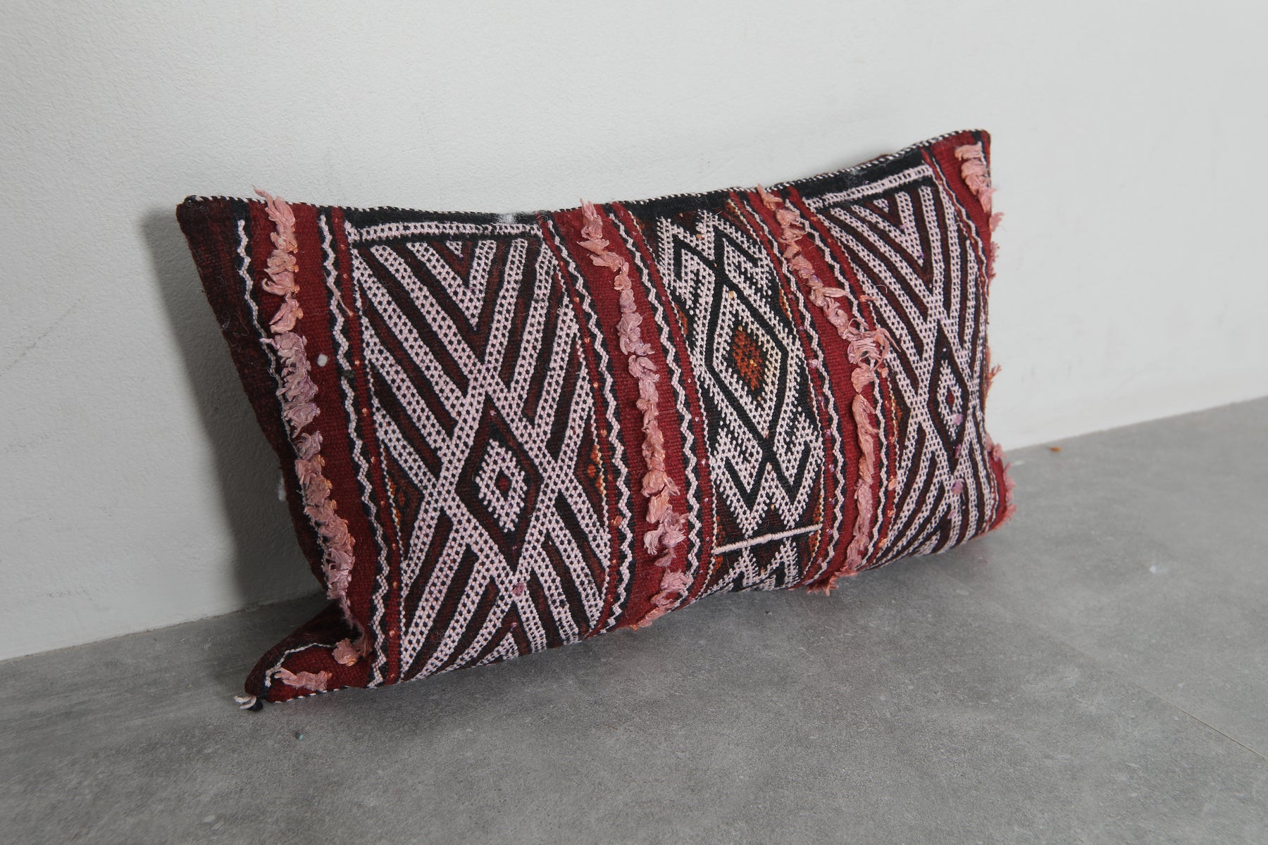Bring a piece of Moroccan artistry into your home with this beautifully handwoven kilim pillow cover. Made by Berber artisans, it features intricate embroidery and traditional weaving techniques, showcasing a rich wool texture that adds warmth and character to any room. Its rectangular shape is perfect for layering or as a standalone accent on sofas, chairs, or beds.