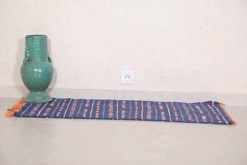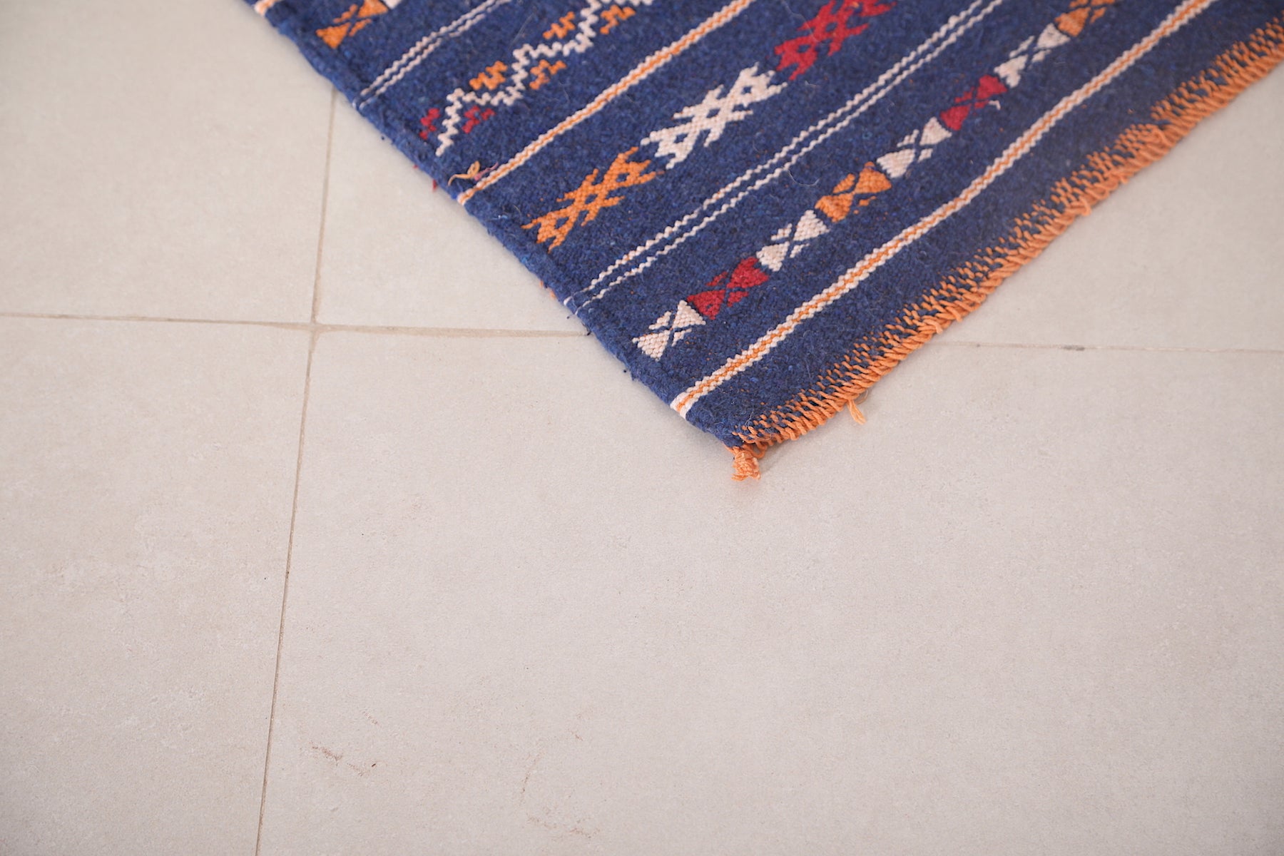 This 1.8 x 4 feet Handwoven Moroccan Kilim Rug features deep blue tones accented with vibrant tribal motifs in orange, white, and red. Its compact size makes it perfect as a runner, centerpiece, or wall tapestry, adding Moroccan charm to smaller interiors.