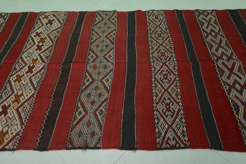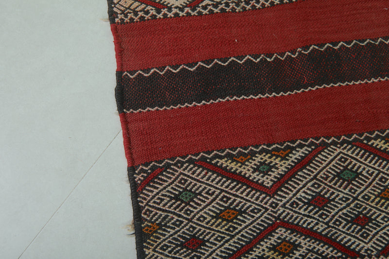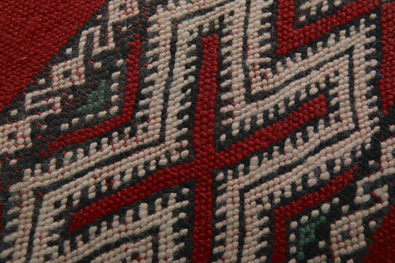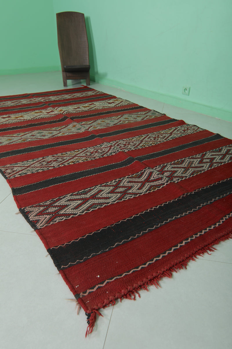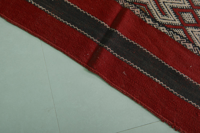 This 4.6 FT x 9.2 FT handwoven Moroccan Kilim rug features bold red tones enriched with traditional Berber patterns. With its earthy and black accents, this piece reflects Morocco's artisanal heritage and adds warmth and cultural character to any space.