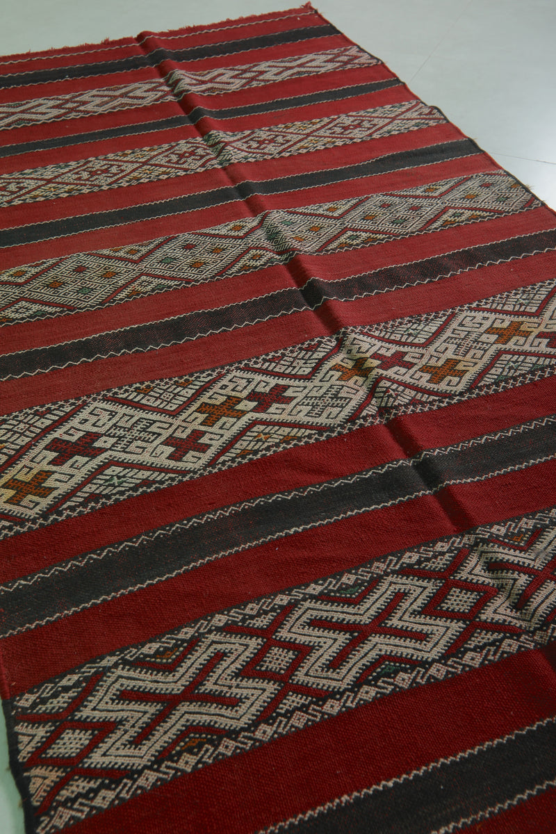 • Vivid red base complemented by geometric Berber patterns in black, ivory, and brown.