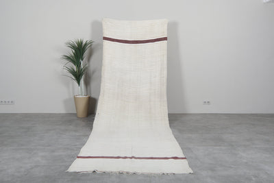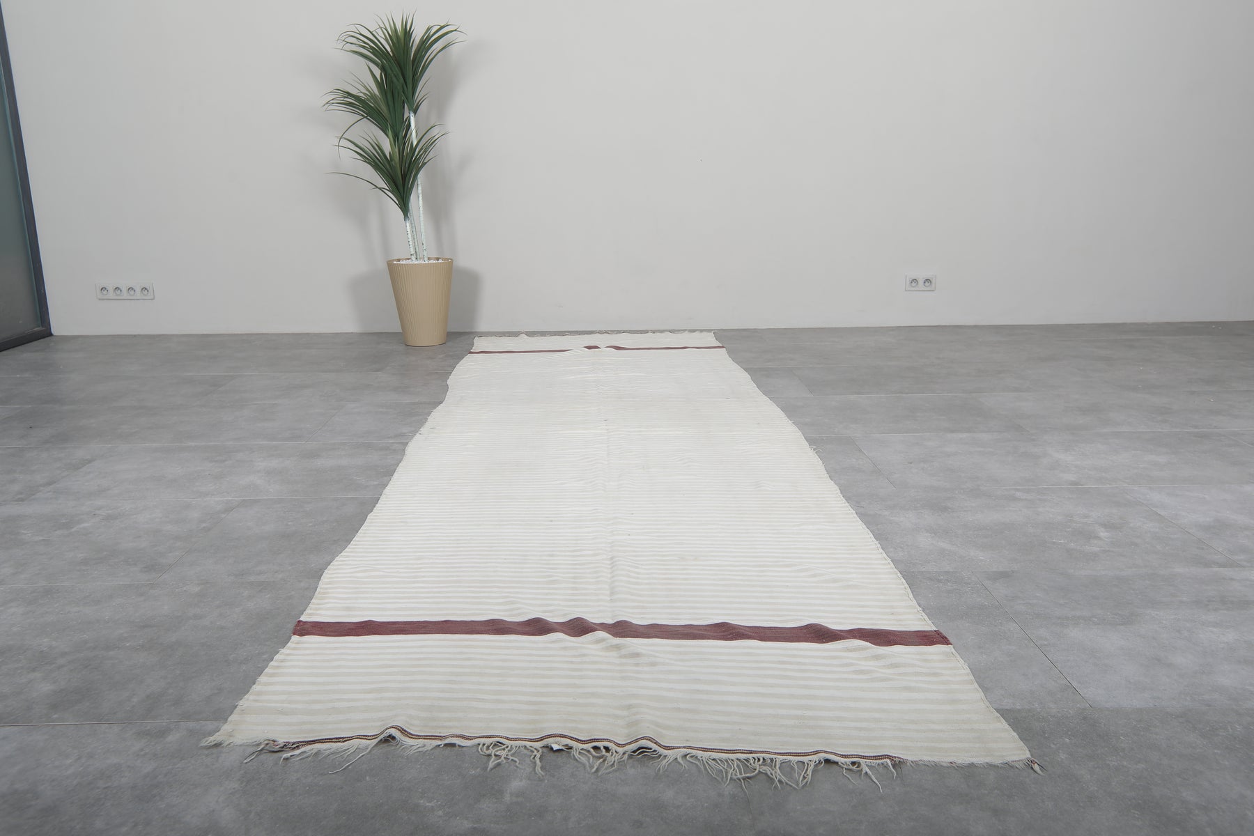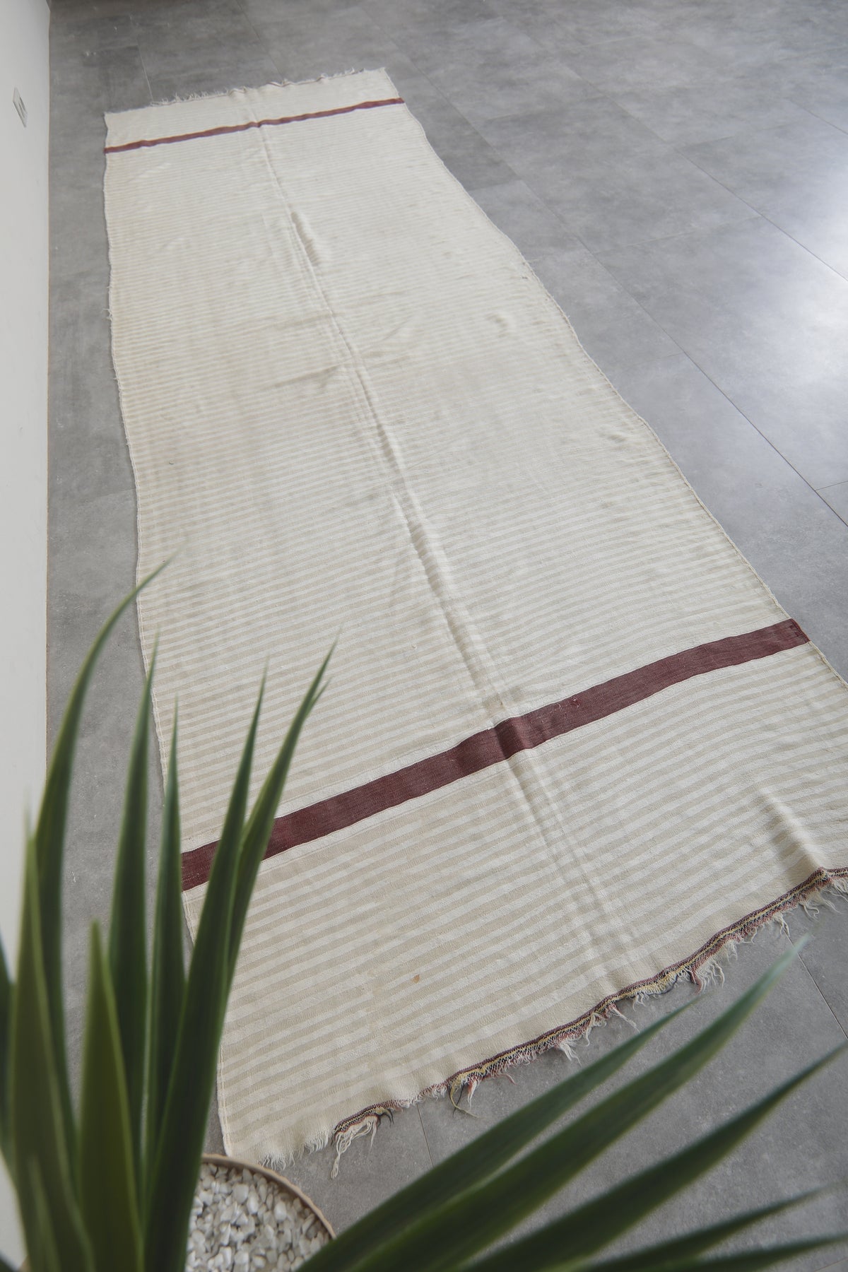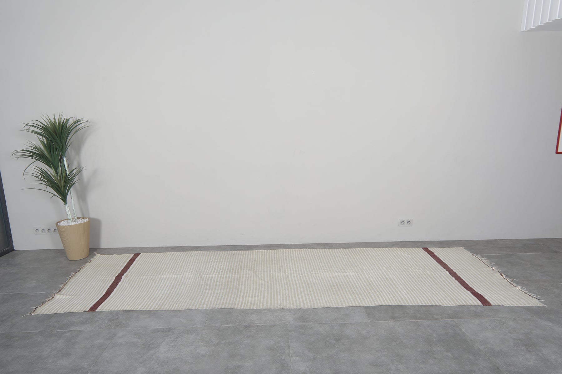 This 4.1 x 13.3 feet Handwoven Moroccan Kilim Runner features a minimalist striped design in soft ivory tones, accented by a bold maroon stripe for a touch of contrast. Its timeless elegance and durable craftsmanship make it an ideal choice for hallways, narrow spaces, or large open areas.