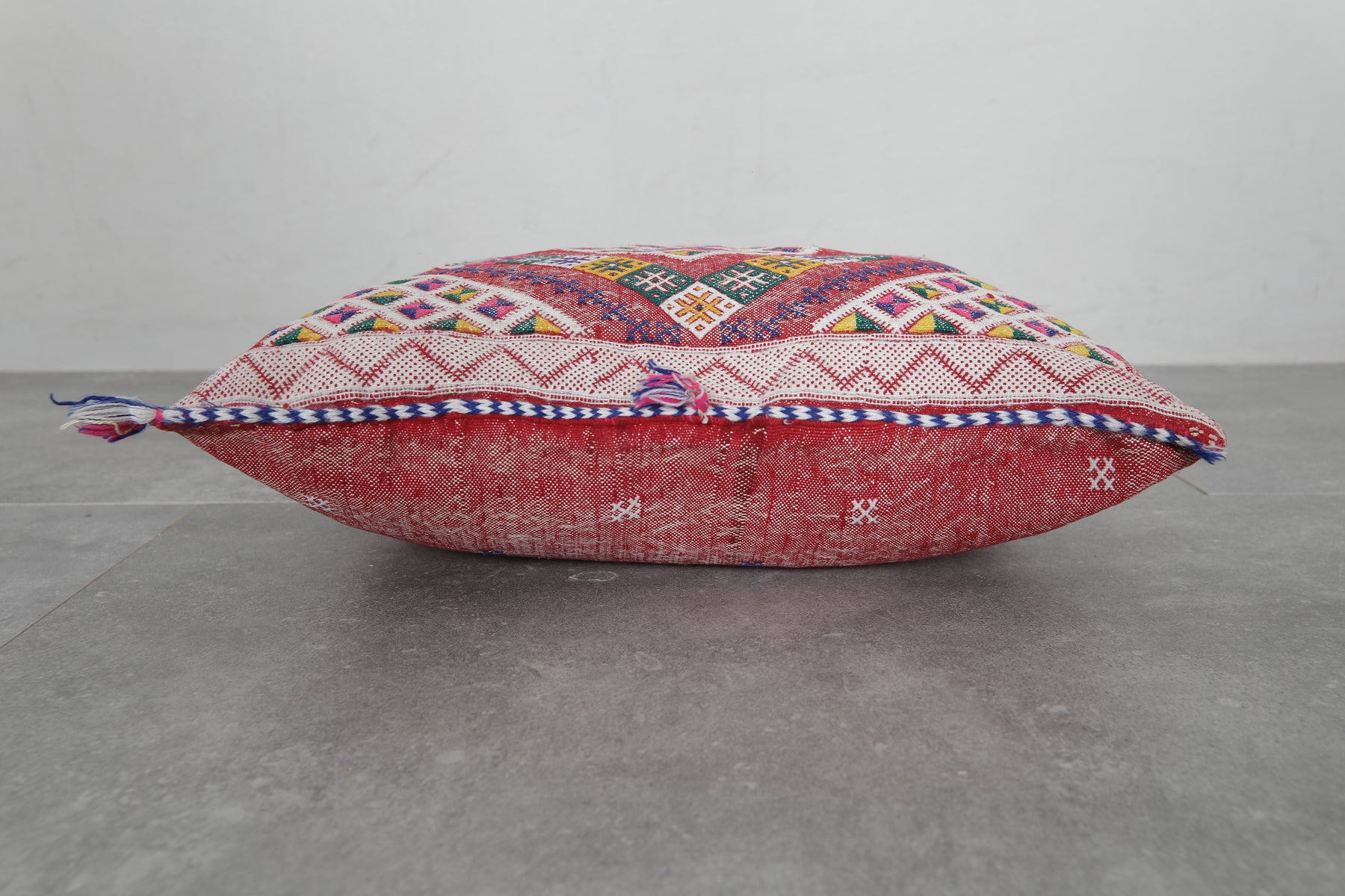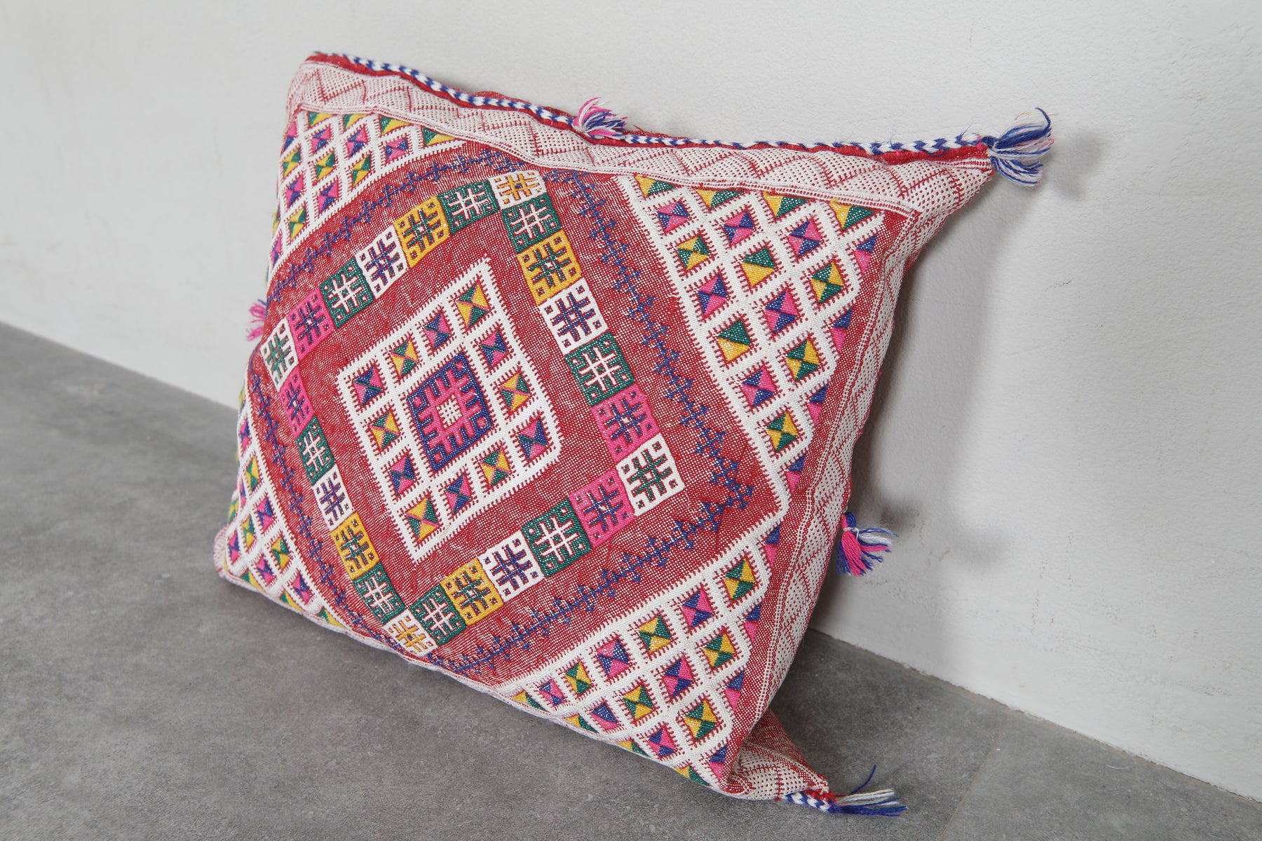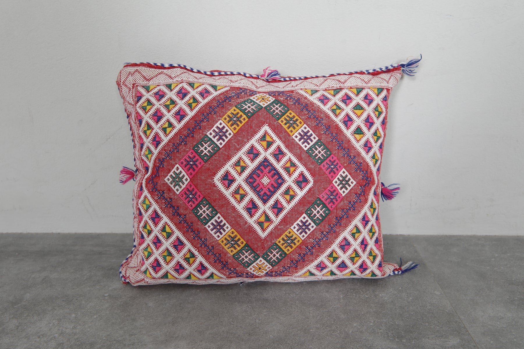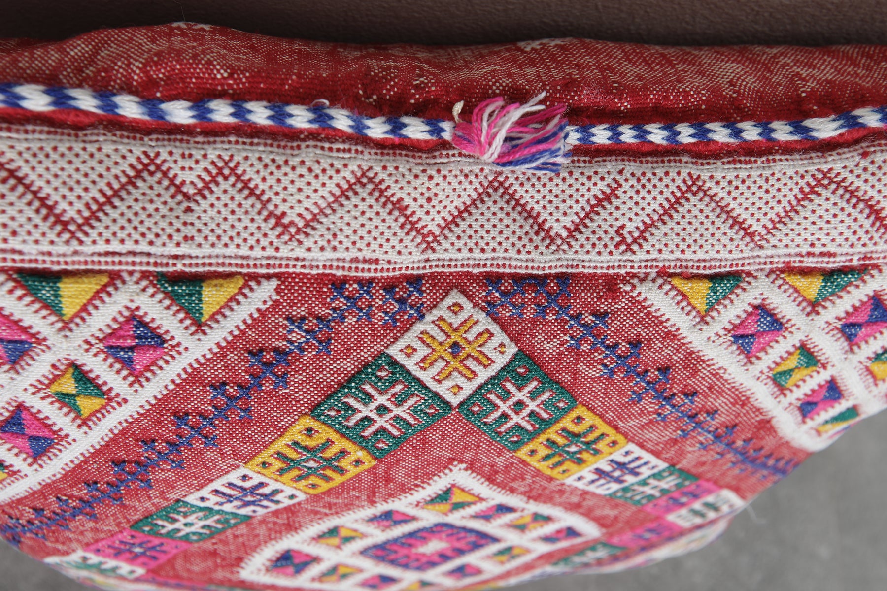 Brighten your decor with this handwoven Moroccan pillow, measuring 15.7x18.1 inches. Featuring intricate multicolored tribal patterns in vibrant shades of pink, yellow, green, and blue, this pillow is a striking addition to boho or eclectic interiors. Perfect for sofas, chairs, or beds.