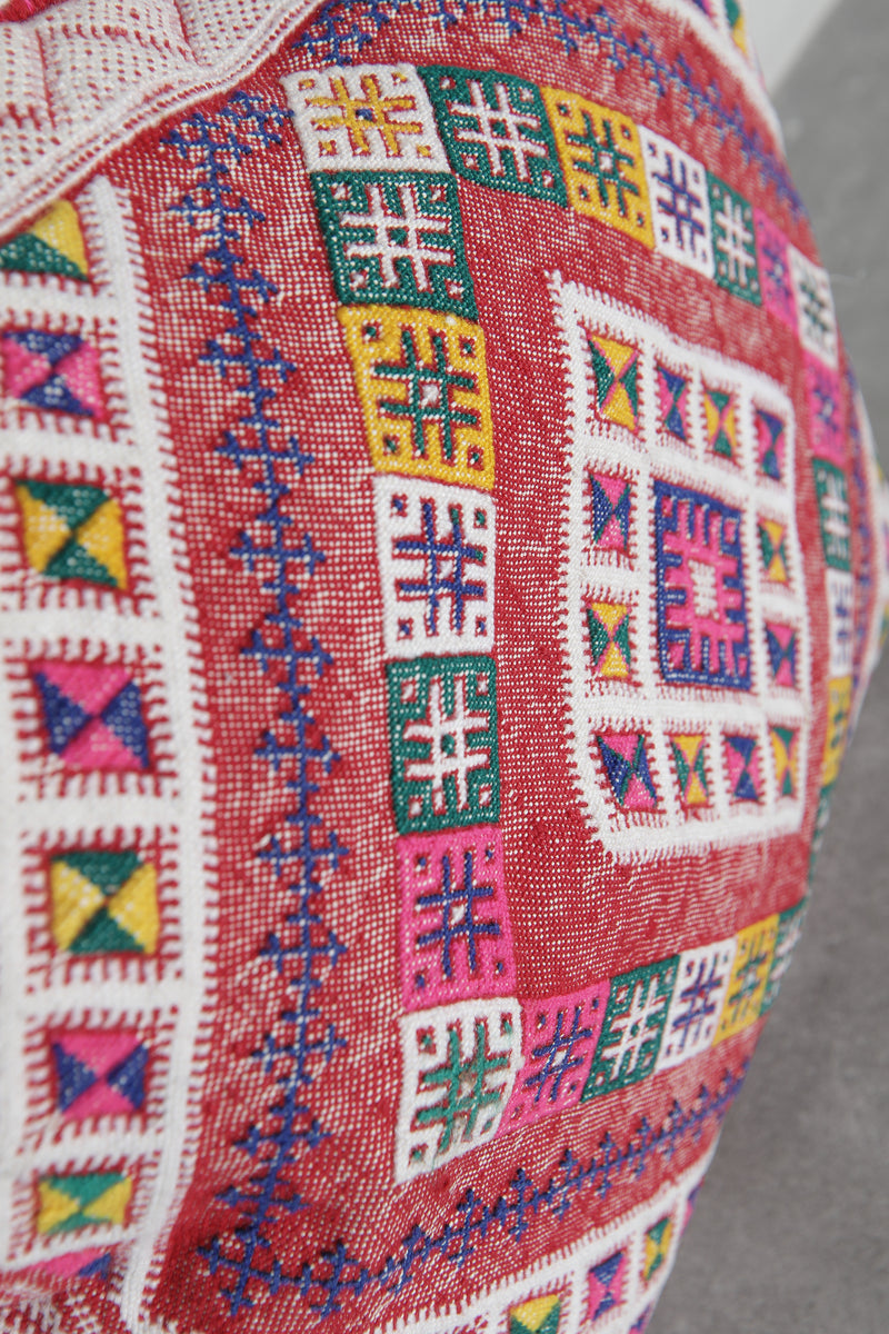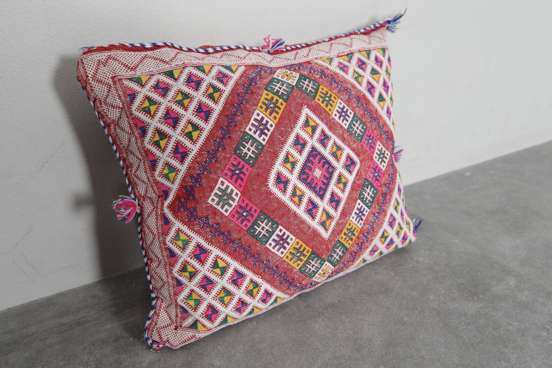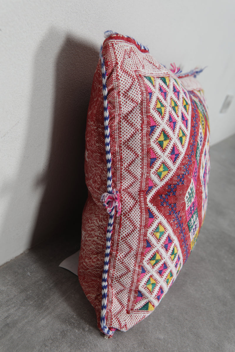 Brighten your decor with this handwoven Moroccan pillow, measuring 15.7x18.1 inches. Featuring intricate multicolored tribal patterns in vibrant shades of pink, yellow, green, and blue, this pillow is a striking addition to boho or eclectic interiors. Perfect for sofas, chairs, or beds.