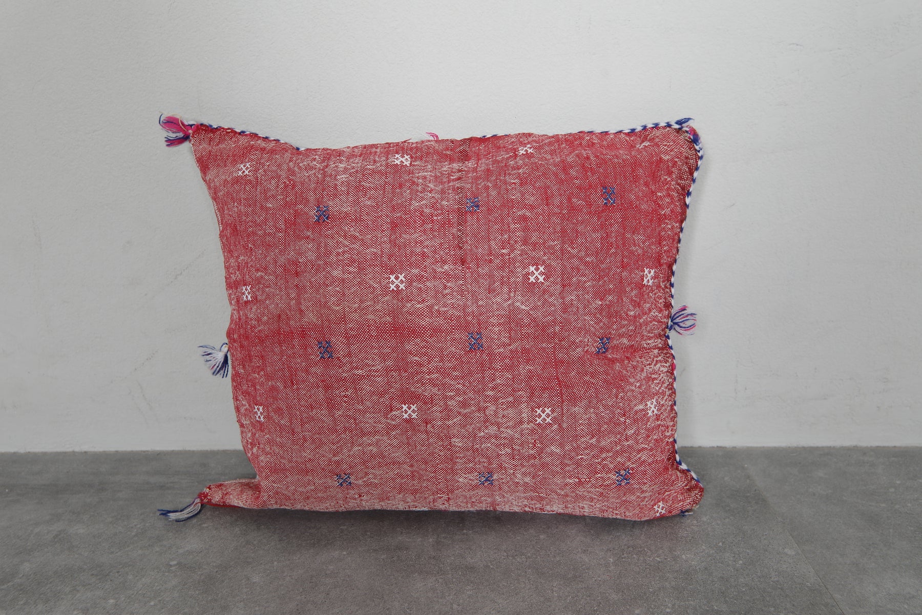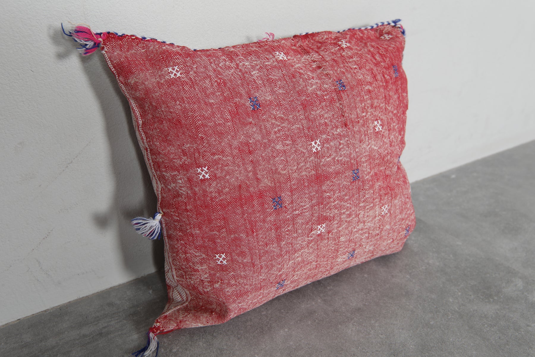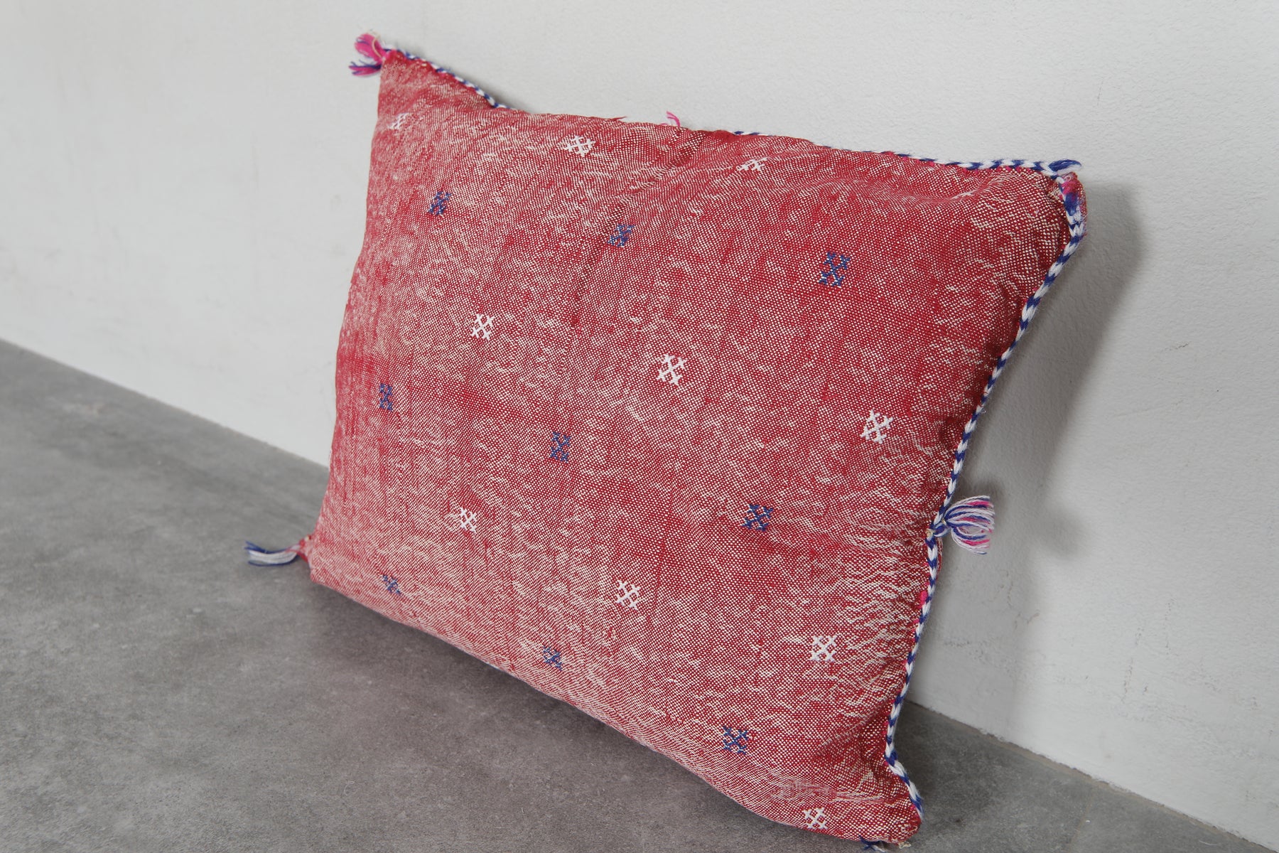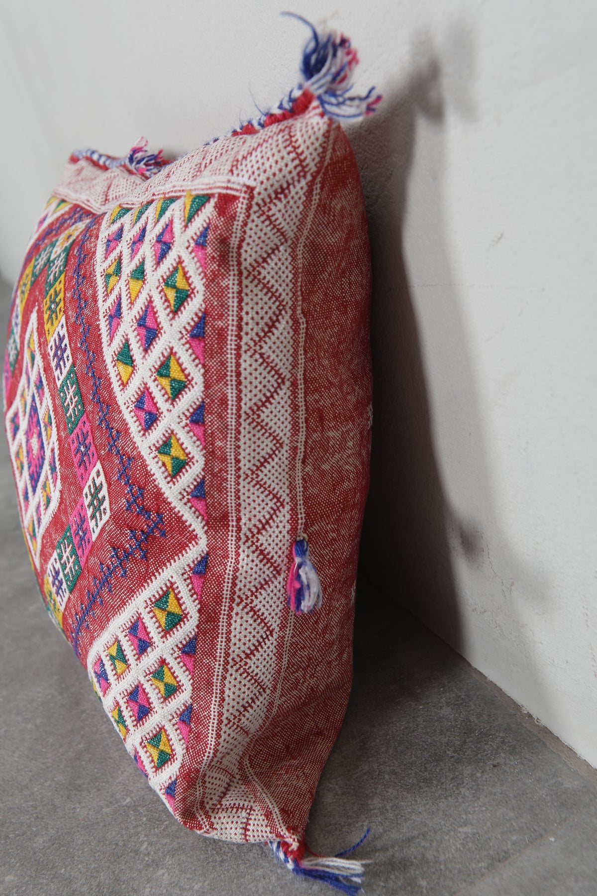 Brighten your decor with this handwoven Moroccan pillow, measuring 15.7x18.1 inches. Featuring intricate multicolored tribal patterns in vibrant shades of pink, yellow, green, and blue, this pillow is a striking addition to boho or eclectic interiors. Perfect for sofas, chairs, or beds.