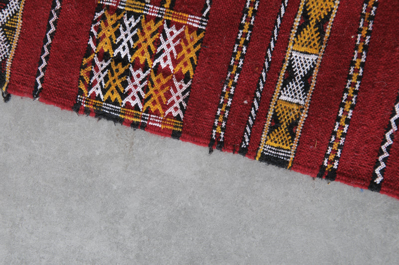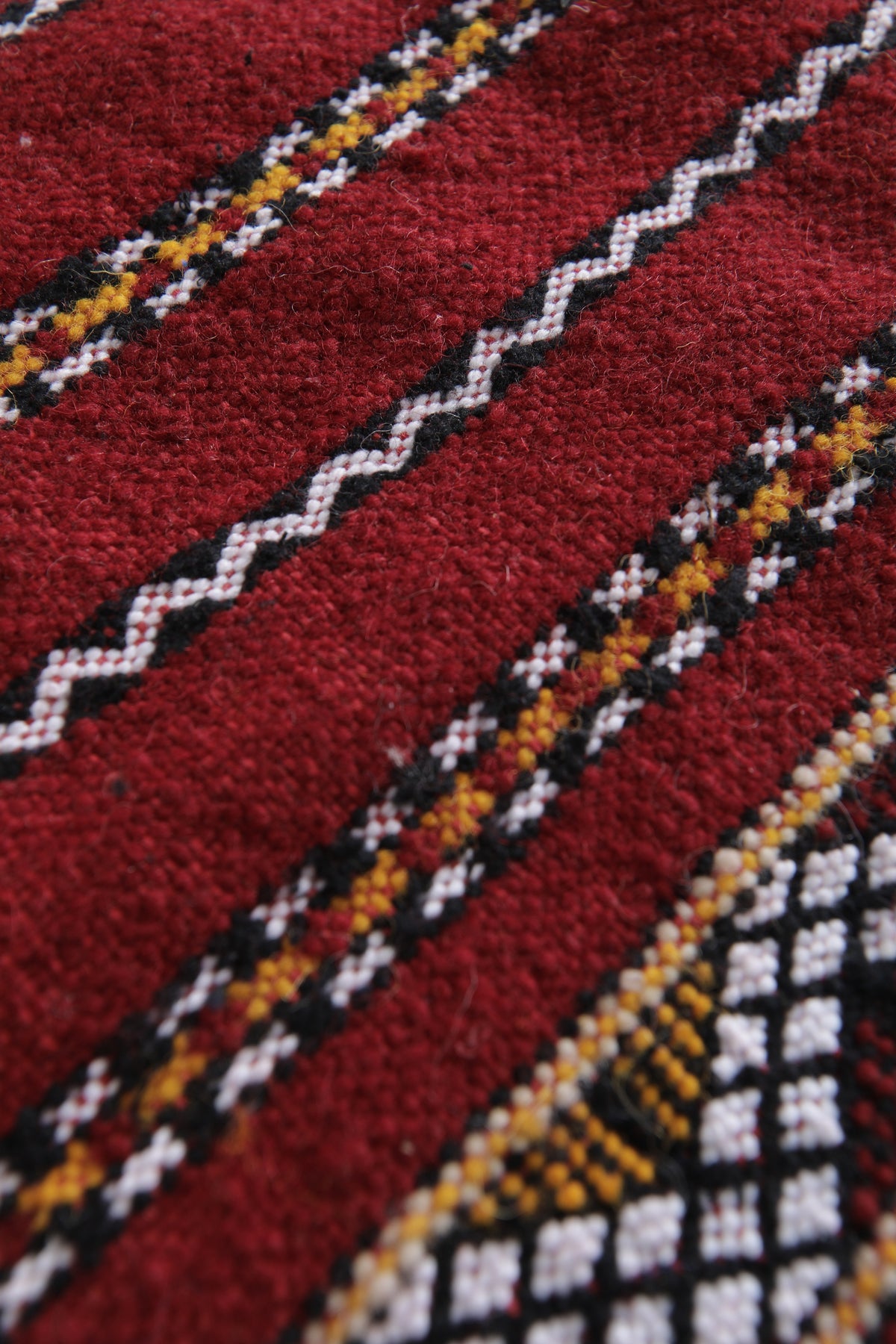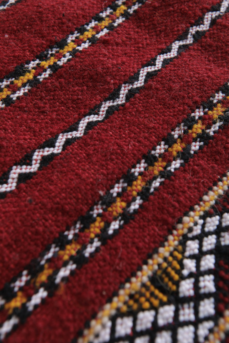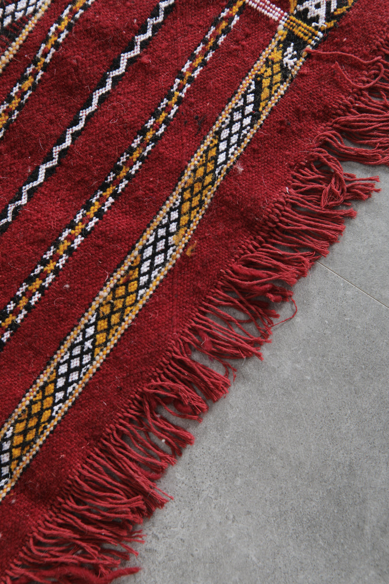 This 3.6 x 5.3 feet handwoven Moroccan rug features a rich red base adorned with intricate geometric patterns, blending traditional craftsmanship with timeless elegance. Handwoven from high-quality wool, it offers a soft yet durable texture that enhances any space. Perfect for living rooms, bedrooms, or entryways, this unique rug adds warmth, character, and a cultural touch while complementing both bohemian and classic interiors.