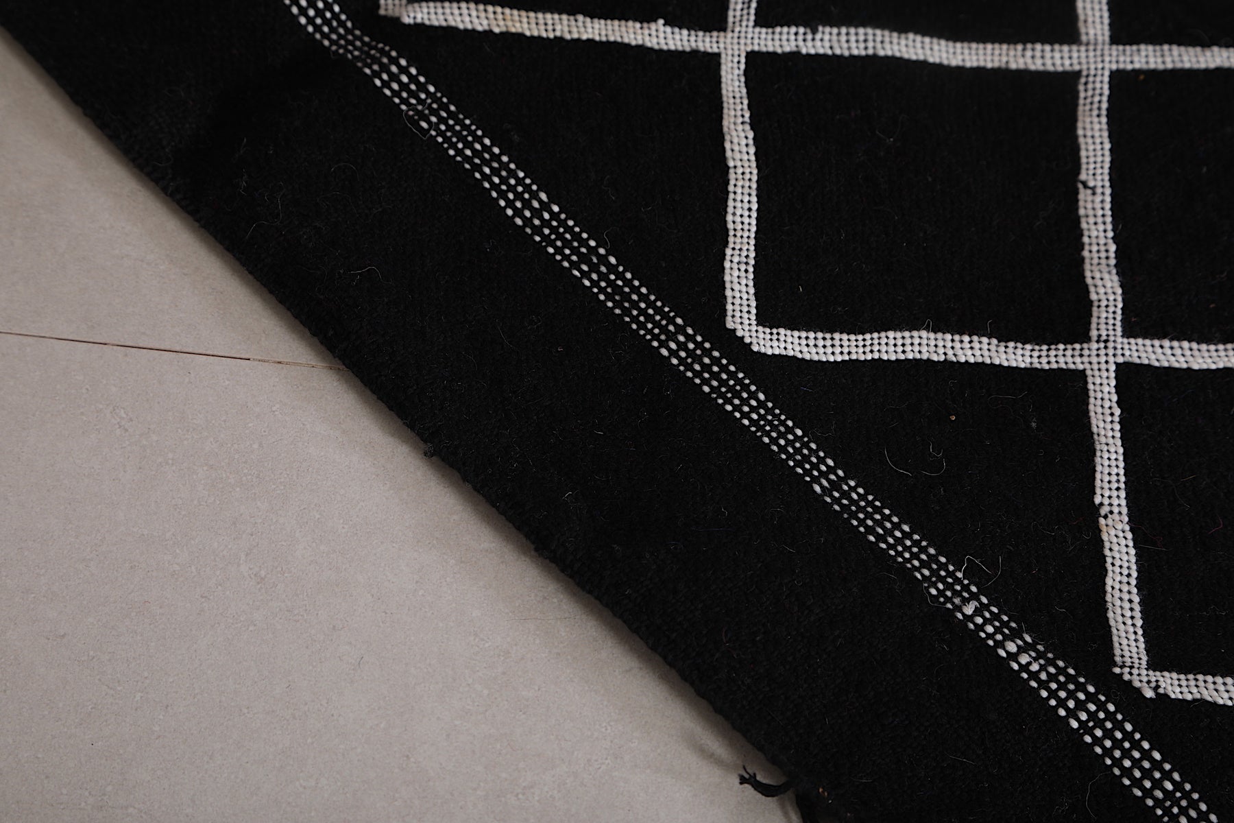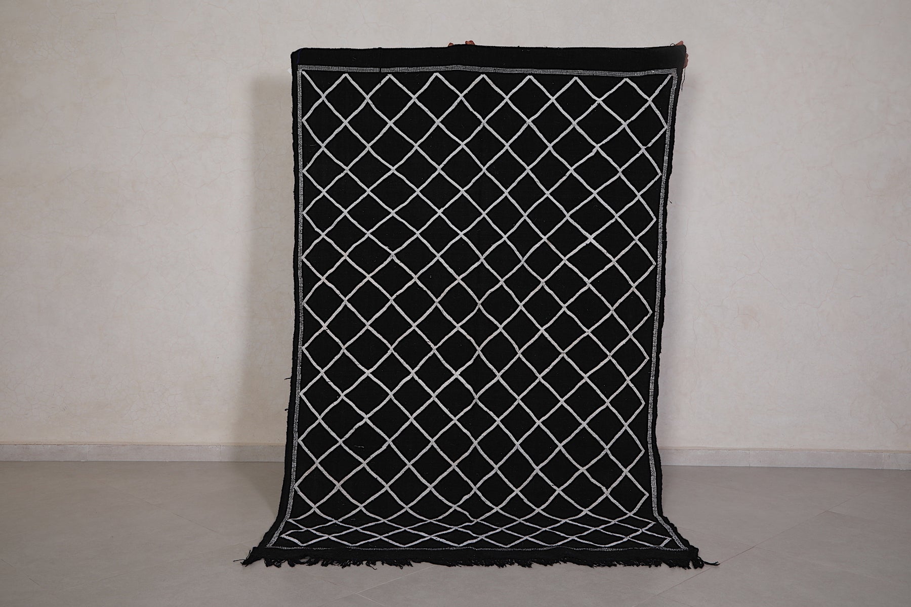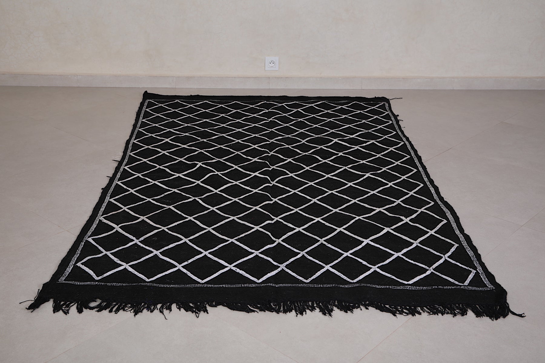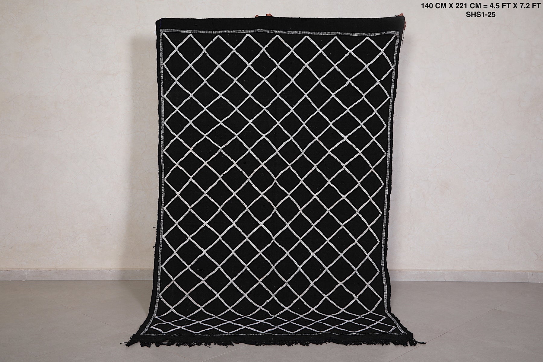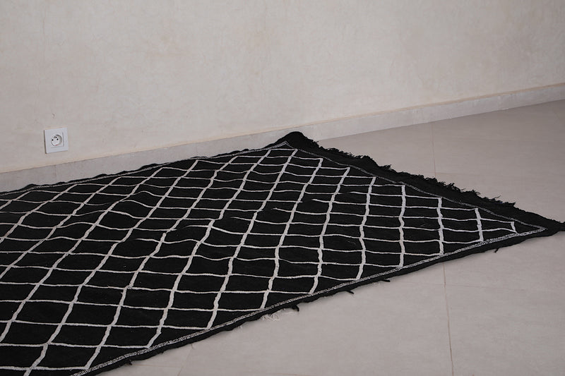 This 4.5 FT x 7.2 FT handwoven Moroccan rug delivers sleek sophistication with its deep black base and minimalist white lattice pattern. Blending traditional craftsmanship with modern simplicity, it's a stylish and versatile piece perfect for contemporary homes.