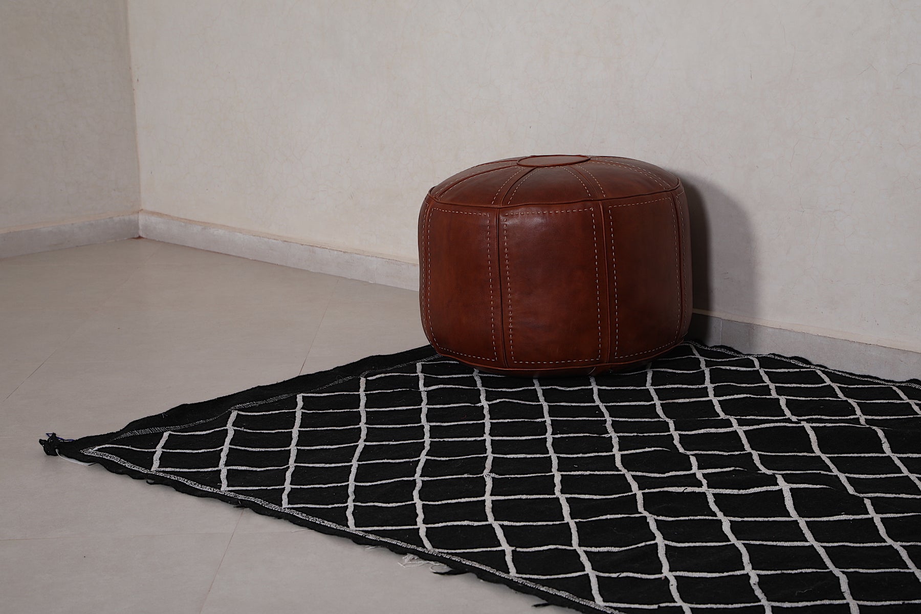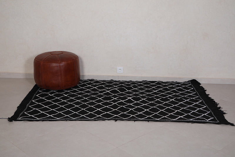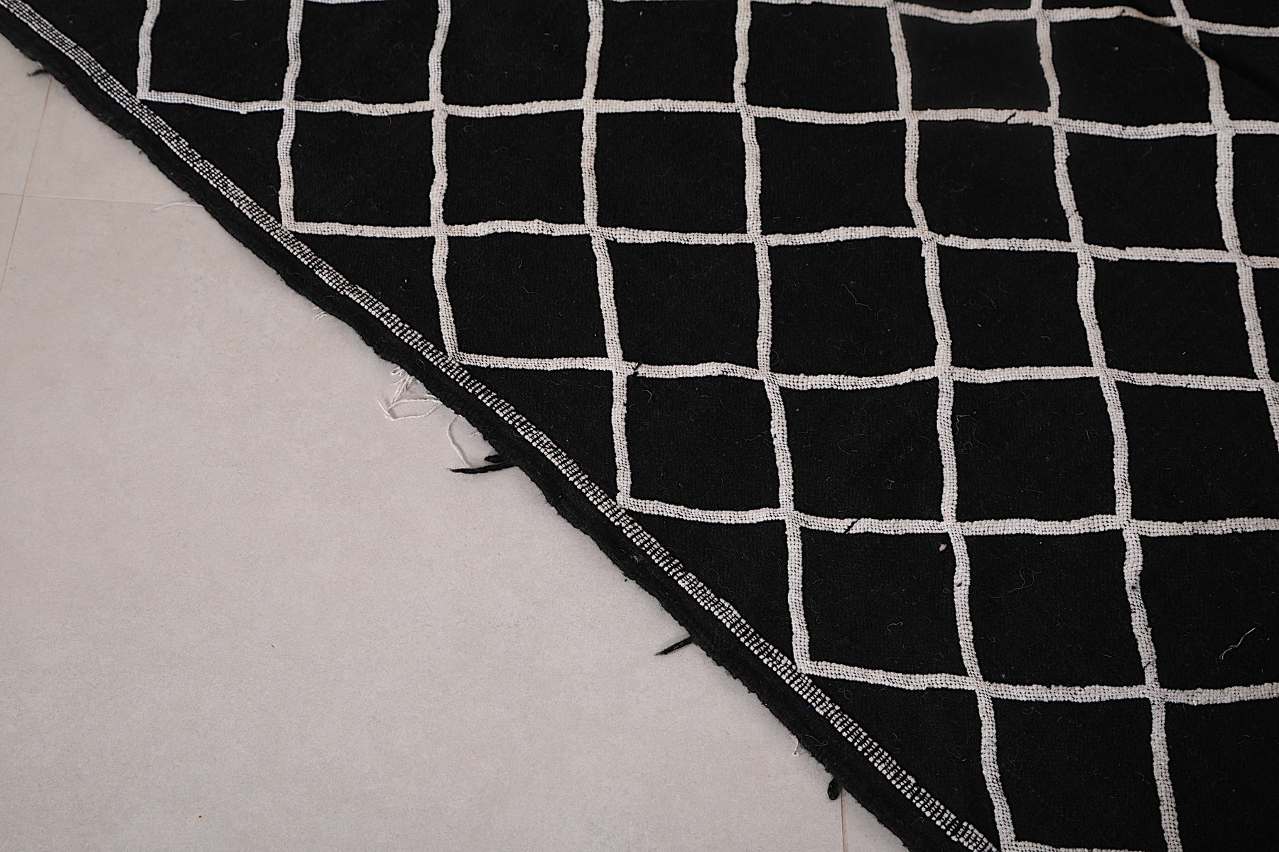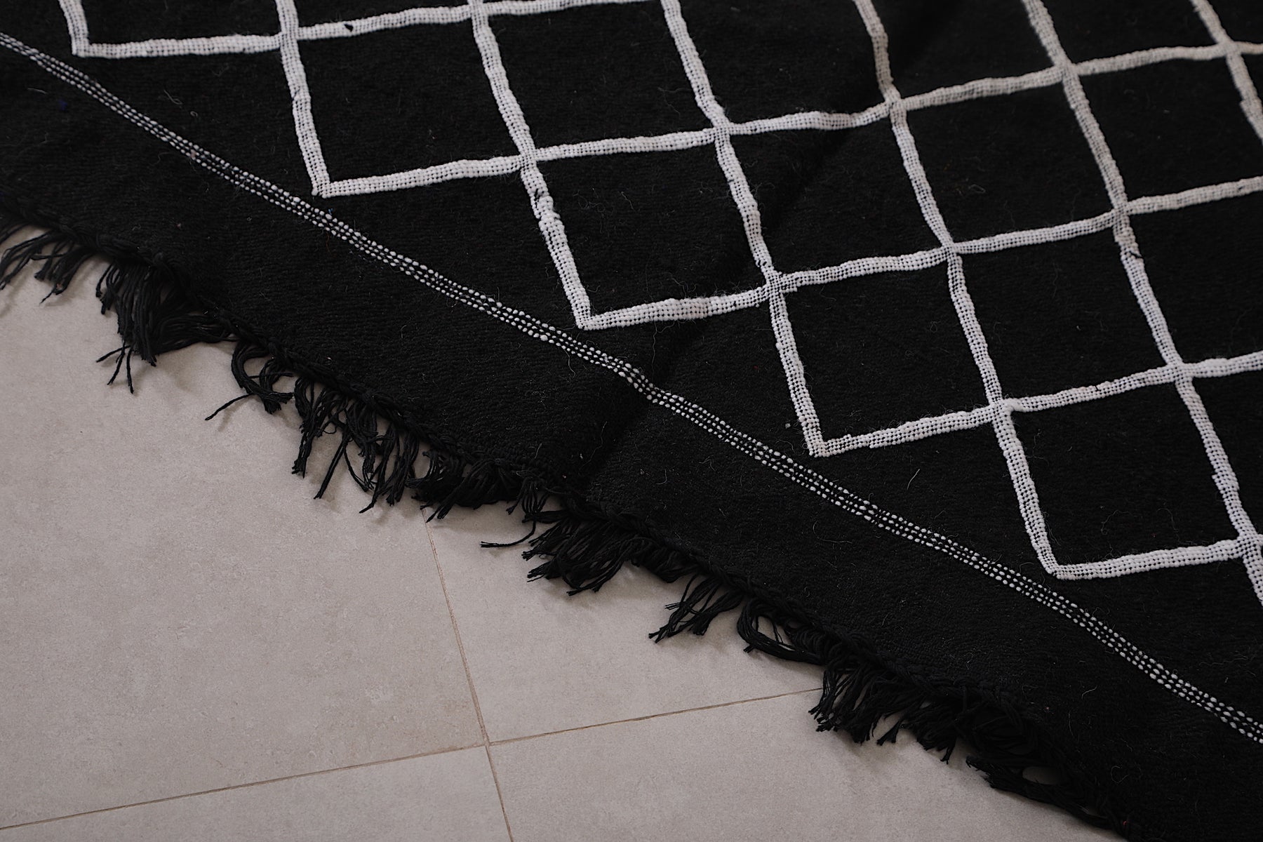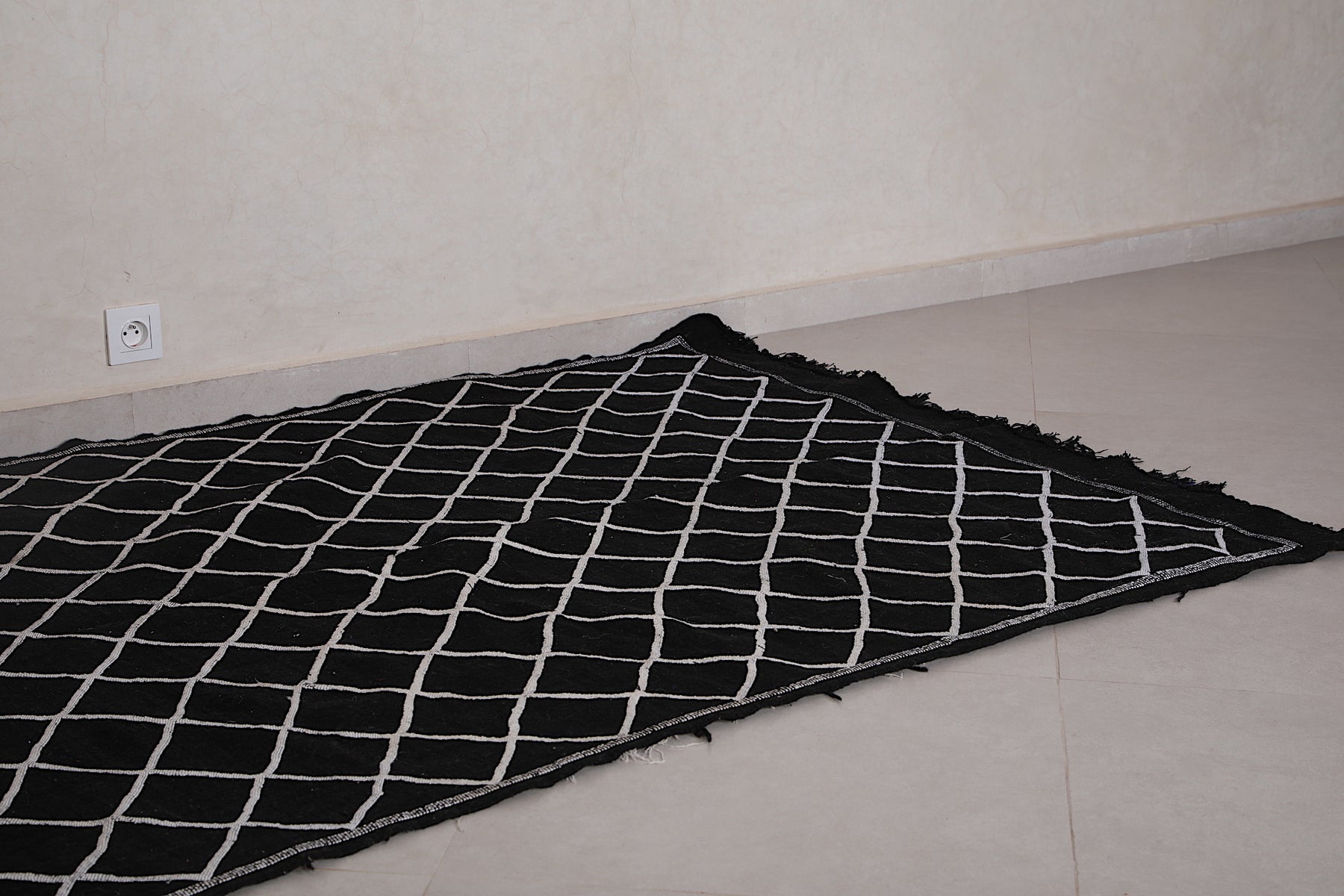 This 4.5 FT x 7.2 FT handwoven Moroccan rug delivers sleek sophistication with its deep black base and minimalist white lattice pattern. Blending traditional craftsmanship with modern simplicity, it's a stylish and versatile piece perfect for contemporary homes.