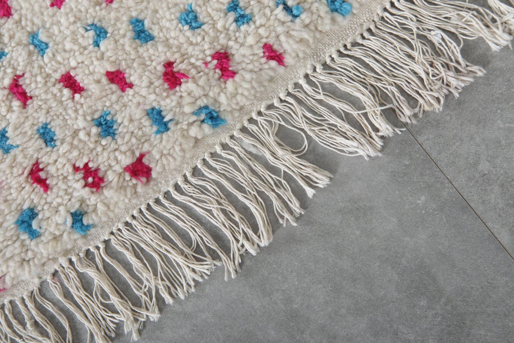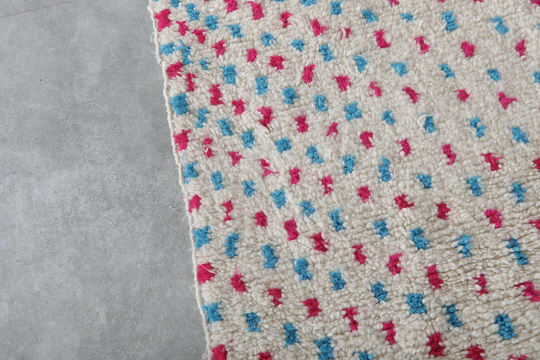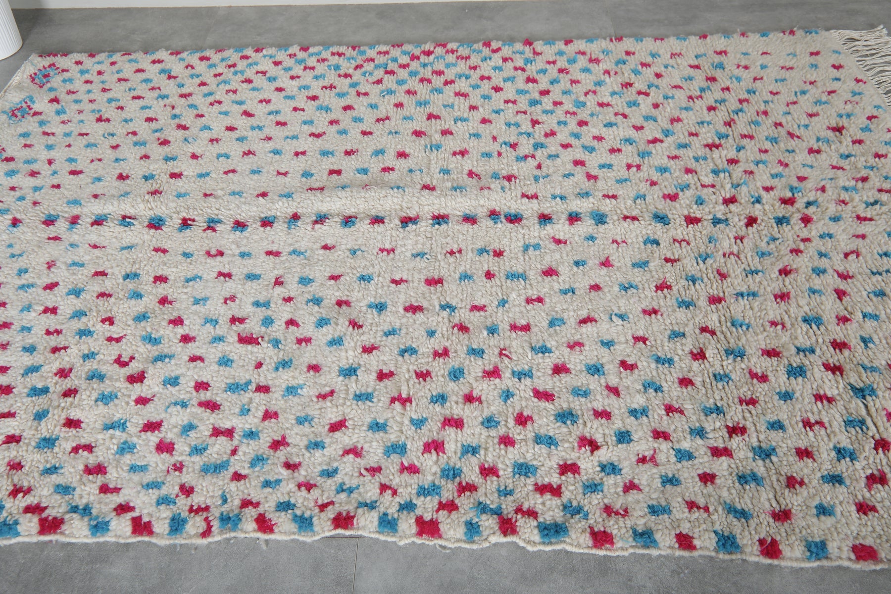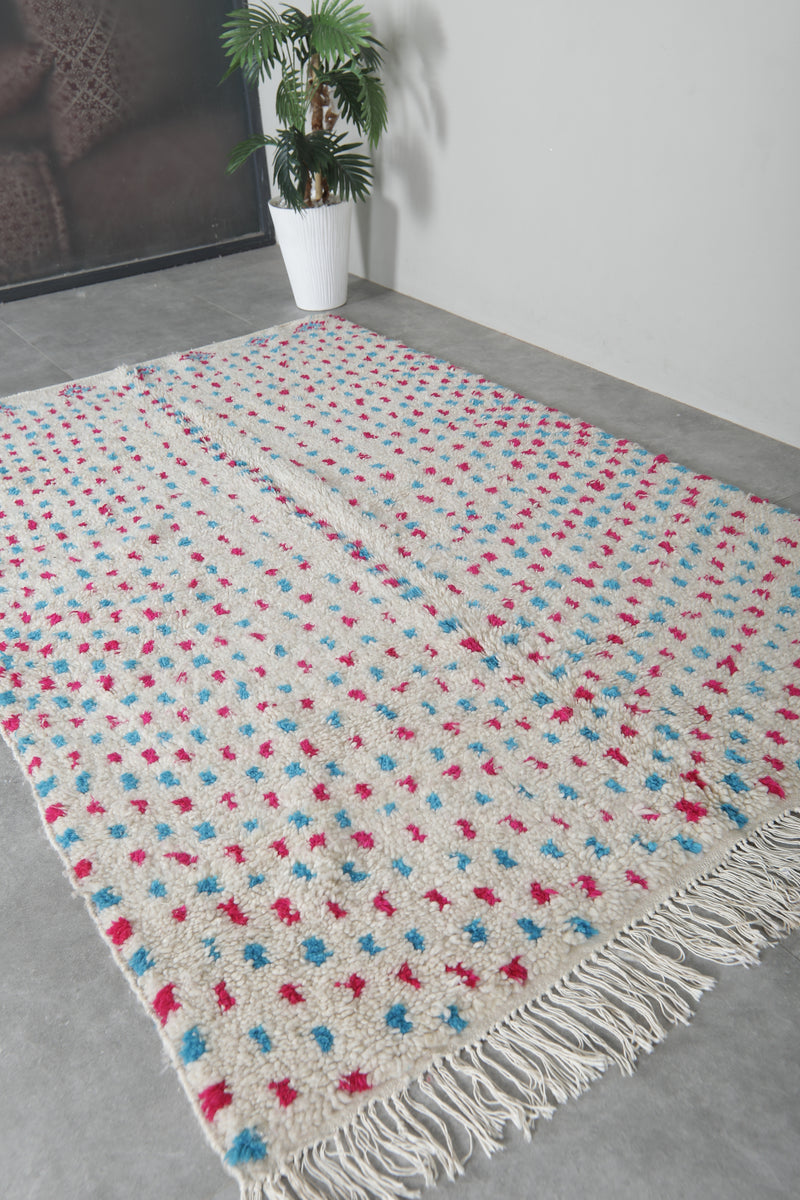 Add a playful touch to your home with this Handwoven Moroccan Rug, sized at 4.6 x 7.4 feet (143 CM x 227 CM). Featuring a charming polka dot design in red and blue on a neutral background, this artisan-made rug combines whimsy with elegance.