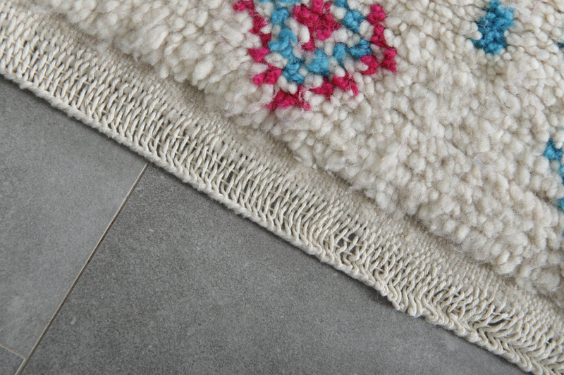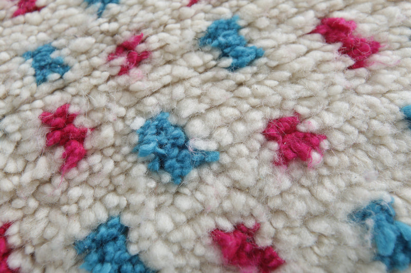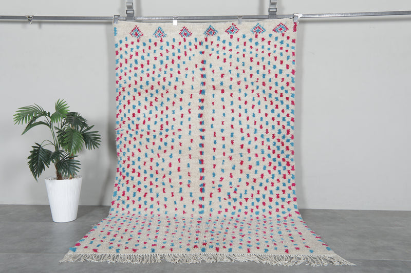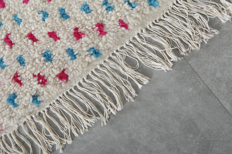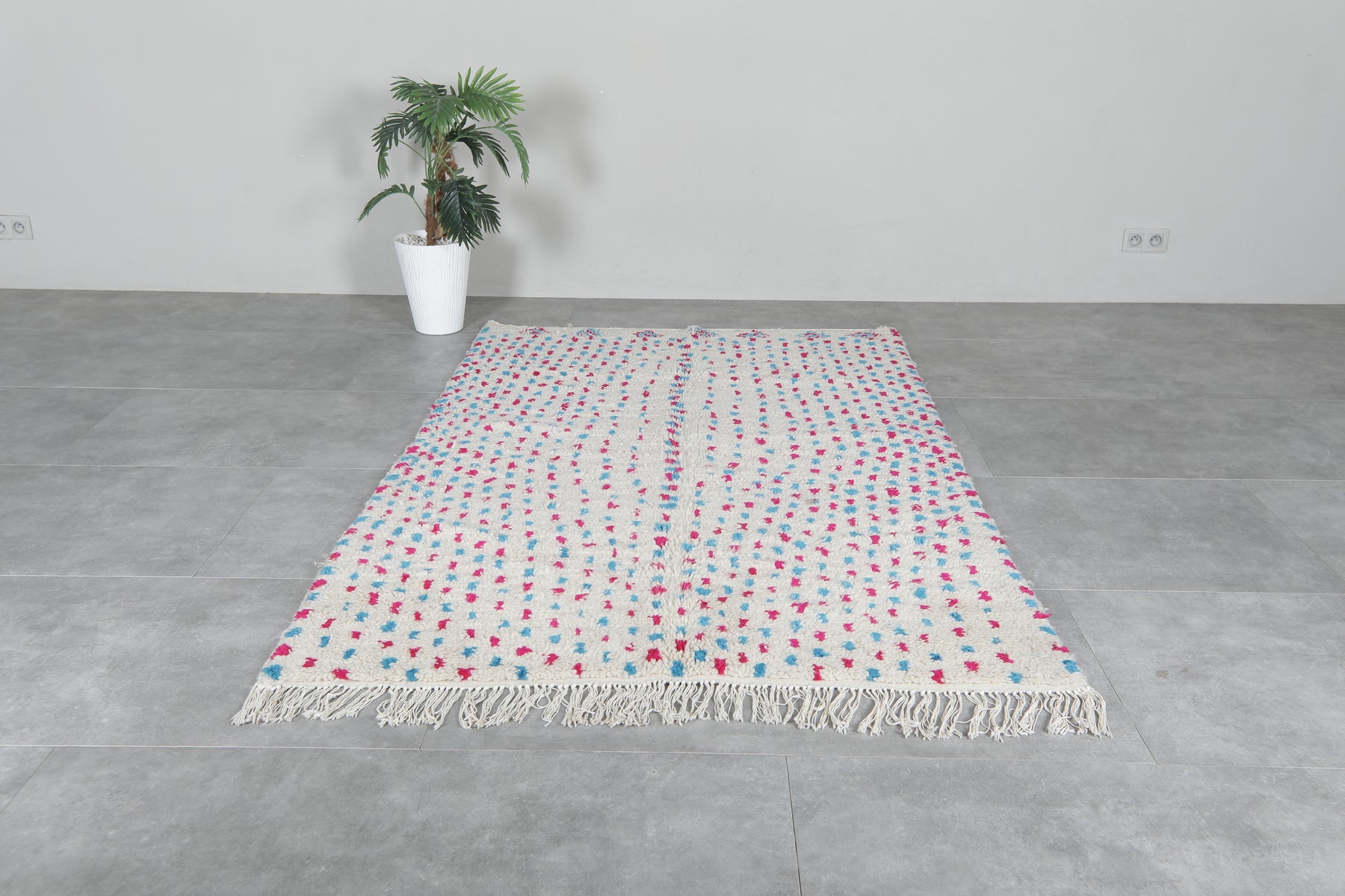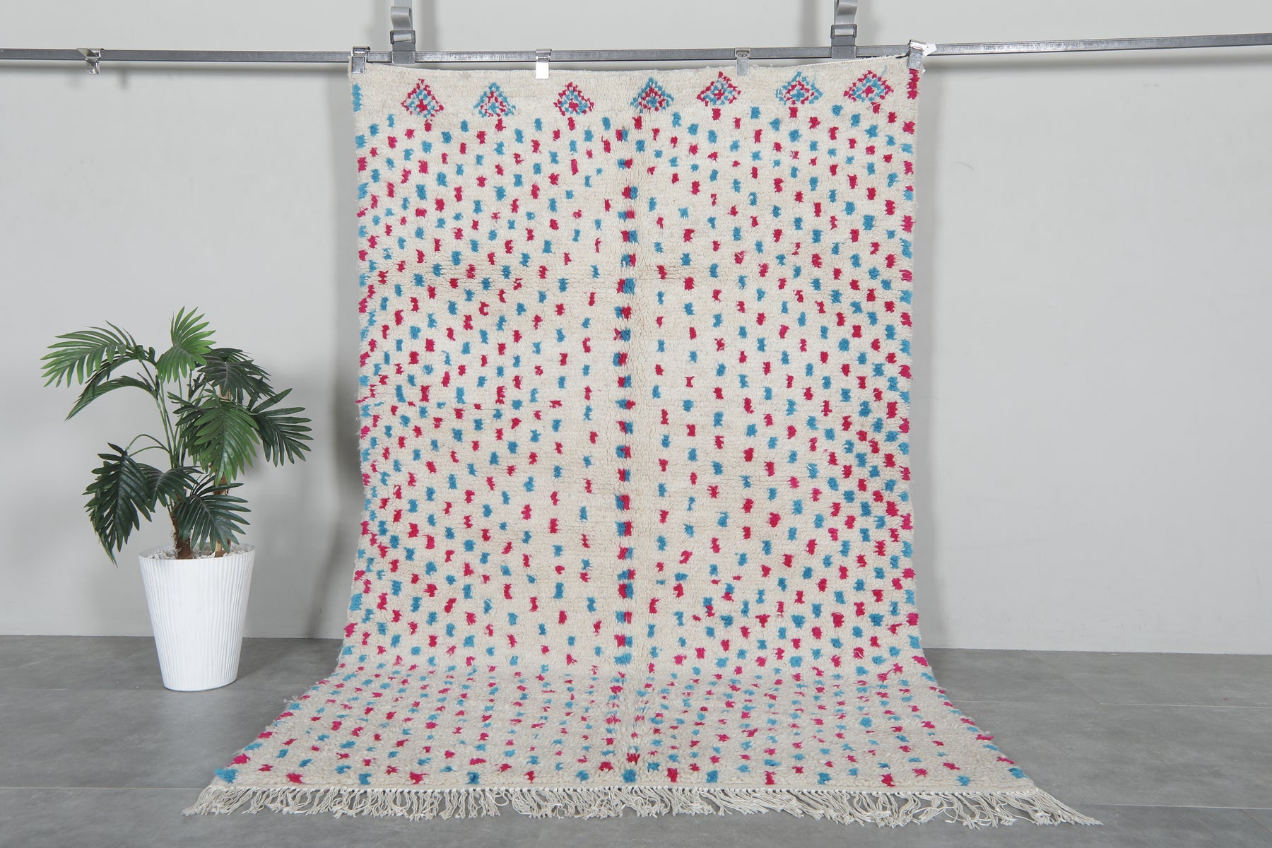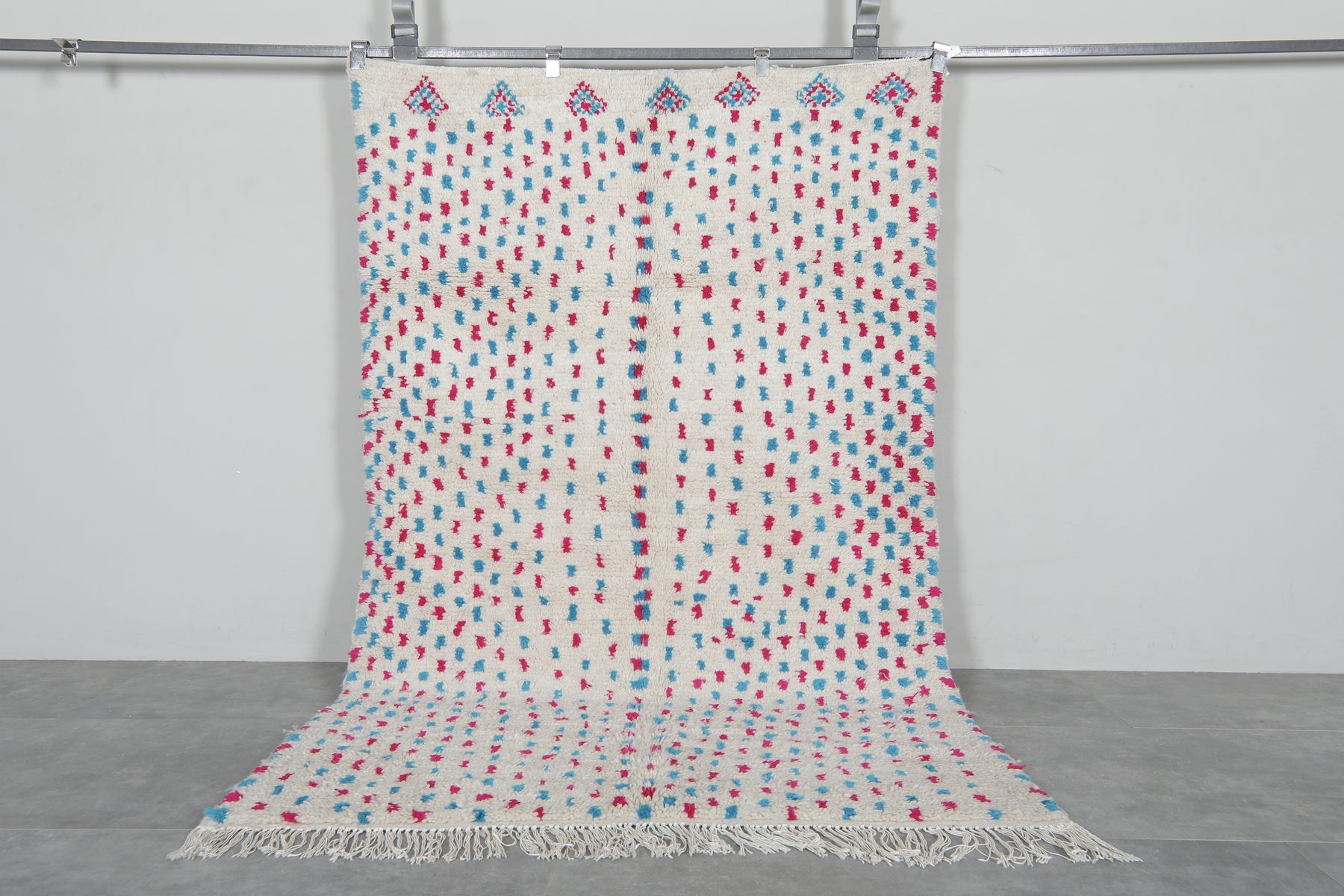 Add a playful touch to your home with this Handwoven Moroccan Rug, sized at 4.6 x 7.4 feet (143 CM x 227 CM). Featuring a charming polka dot design in red and blue on a neutral background, this artisan-made rug combines whimsy with elegance.